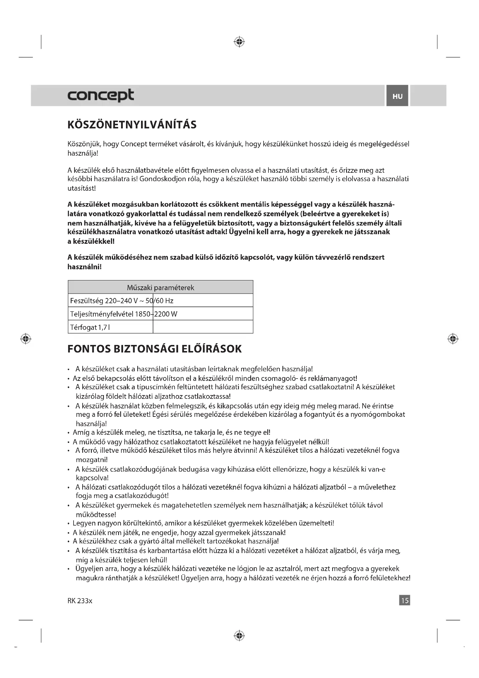Köszönjük, hogy Concept terméket vásárolt, és kívánjuk, hogy készülékünket hosszú ideig és megelégedéssel használja! A készülék első használatbavétele előtt gyelmesen olvassa el a használati utasítást, és őrizze meg azt későbbi használatra is! Gondoskodjon róla, hogy a készüléket használó többi személy is elolvassa a használati utasítást! A készüléket mozgásukban korlátozott és csökkent mentális képességgel vagy a készülék haszná- latára vonatkozó gyakorlattal és tudással nem rendelkező személyek (beleértve a gyerekeket is) nem használhatják, kivéve ha a felügyeletük biztosított, vagy a biztonságukért felelős személy általi készülékhasználatra vonatkozó utasítást adtak! Ügyelni kell arra, hogy a gyerekek ne játsszanak a készülékkel! A készülék működéséhez nem szabad külső időzítő kapcsolót, vagy külön távvezérlő rendszert használni! Műszaki paraméterek Feszültség 220–240 V ~ 50/60 Hz Teljesítményfelvétel 1850–2200 W Térfogat 1,7 l