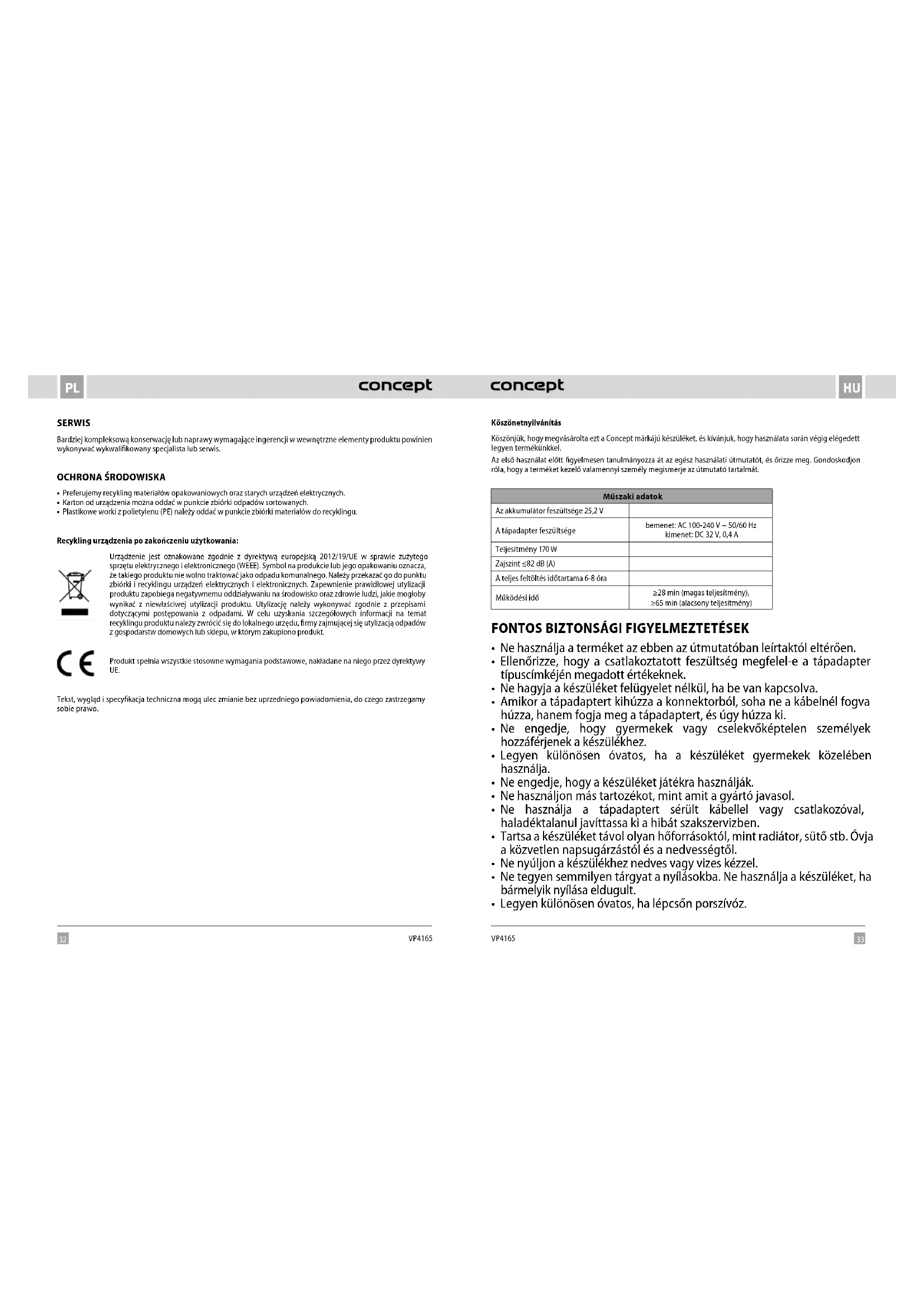 HASZNÁLATI ÚTMUTATÓ VP4165 Concept