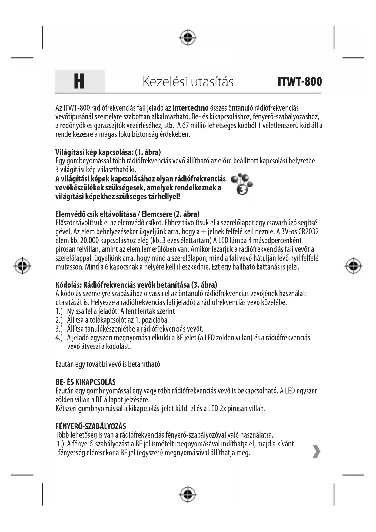 Οδηγίες χρήσης ITWT-800Az ITWT-800 rádiófrekvenciás fali jeladó az intertechno összes öntanuló rádiófrekvenciás vevőtípusánál személyre szabottan alkalmazható. Be- és kikapcsoláshoz, fényerő-szabályozáshoz, a redőnyök és garázsajtók vezérléséhez, stb. A 67 millió lehetséges kódból 1 véletlenszerű kód áll a rendelkezésre a magas fokú biztonság érdekében. Világítási kép kapcsolása: (1. ábra)Egy gombnyomással több rádiófrekvenciás vevő állítható az előre beállított kapcsolási helyzetbe.3 világítási kép választható ki. A világítási képek kapcsolásához olyan rádiófrekvenciás vevőkészülékek szükségesek, amelyek rendelkeznek a világítási képekhez szükséges tárhellyel! Elemvédő csík eltávolítása / Elemcsere (2. ábra)Először távolítsuk el az elemvédő csíkot. Ehhez távolítsuk el a szerelőlapot egy csavarhúzó segítsé-gével. Az elem behelyezésekor ügyeljünk arra, hogy a + jelnek felfelé kell néznie. A 3V-os CR2032 elem kb. 20.000 kapcsoláshoz elég (kb. 3 éves élettartam) A LED lámpa 4 másodpercenként pirosan felvillan, amint az elem lemerülőben van. Amikor lezárjuk a rádiófrekvenciás fali vevőt a szerelőlappal, ügyeljünk arra, hogy mind a szerelőlapon, mind a fali vevő hátulján lévő nyíl felfelé mutasson. Mind a 6 kapocsnak a helyére kell illeszkednie. Ezt egy hallható kattanás is jelzi.Kódolás: Rádiófrekvenciás vevők betanítása (3. ábra)A kódolás személyre szabásához olvassa el az öntanuló rádiófrekvenciás vevőjének használati utasítását is. Helyezze a rádiófrekvenciás fali jeladót a rádiófrekvenciás vevő közelébe.1.) Nyissa fel a jeladót. A fent leírtak szerint 2.) Állítsa a tolókapcsolót az 1. pozícióba.3.) Állítsa tanulókészenlétbe a rádiófrekvenciás vevőt.4.) A jeladó egyszeri megnyomása elküldi a BE jelet (a LED zölden villan) és a rádiófrekvenciás vevő átveszi a kódolást.Ezután egy további vevő is betanítható.BE- ÉS KIKAPCSOLÁSEzután egy gombnyomással egy vagy több rádiófrekvenciás vevő is bekapcsolható. A LED egyszer zölden villan a BE állapot jelzésére. Kétszeri gombnyomással a kikapcsolás-jelet küldi el és a LED 2x pirosan villan.FÉNYERŐ-SZABÁLYOZÁSTöbb lehetőség is van a rádiófrekvenciás fényerő-szabályozóval való használatra. 1.) A fényerő-szabályozást a BE jel ismételt megnyomásával indíthatja el, majd a kívánt fényesség elérésekor a BE jel (egyszeri) megnyomásával állíthatja meg.