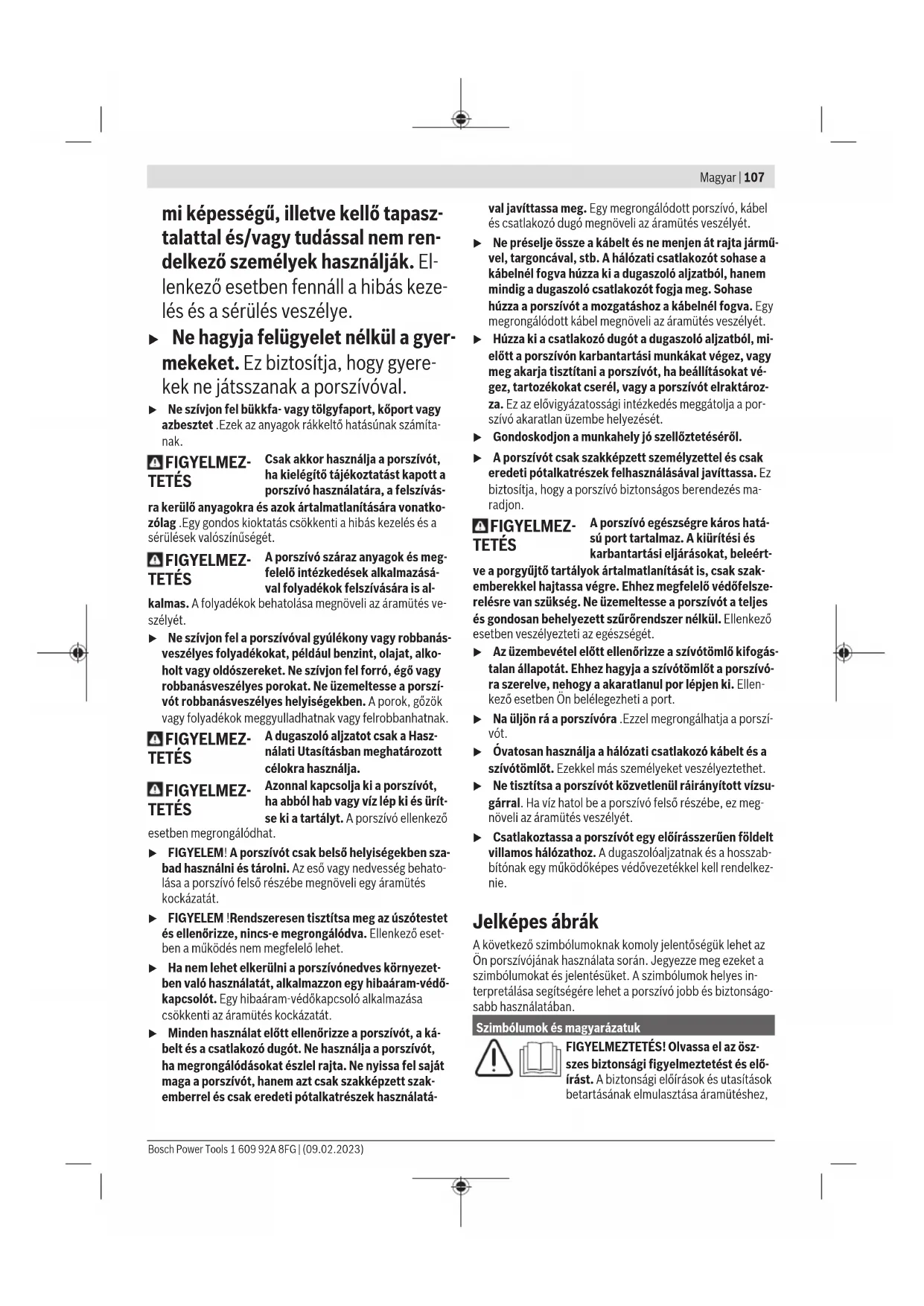 A porszívót alapvetően nem szabad robbanásveszélyes he- lyiségekben használni. Egy optimális elszívási teljesítmény biztosítására a (17) szí- vótömlőt mindig teljesen le kell tekerni a porszívó (6) felső részéről. Száraz porszívás A lerakódott por felszívása – A porszívó bekapcsolásához nyomja be rövid időre a (4)be-/kikapcsoló gombot. – A porszívó kikapcsolásához nyomja meg ismét a (4)be-/ kikapcsoló gombot. Porelszívás működő elektromos kéziszerszámok előtt (lásd aEábrát) u A helyiségben egy elegendő mértékű levegőcsere se- bességet (L) kell fenntartani, ha a porszívóból kilépő levegő a helyiségbe jut vissza. Tartsa be az adott or- szágban érvényes előírásokat. A porszívóba egy(3)védőérintkezős dugaszolóaljzat van be- építve. Ehhez egy elektromos kéziszerszámot lehet csatla- koztatni. Vegye tekintetbe a csatlakozásra kerülő elektromos kéziszerszám legnagyobb megengedett csatlakoztatási telje- sítményét. – Szerelje fel a(18)elszívó adaptert. – Dugja be a(18)elszívó-adaptert az elektromos kéziszer- szám elszívó csőcsonkjába. Figyelem: Olyan elektromos kéziszerszámmal végzett mun- kák esetén, amelyeknél a légbevezetés a szívótömlőbe ala- csony (például szúrófűrészek, csiszolók stb.), a(18)elszívó adapter (26)hamislevegő nyílását ki kell nyitni. A félautoma- ta szűrőtisztítás (SFC) csak így működik problémamentesen. Ehhez fordítsa olyan helyzetbe a (26)hamislevegő nyílás fe- letti gyűrűt, hogy maximális nyílás jöjjön létre. – A porszívó Start/Stop automatikájának üzembe helye- zéséhez nyomja be röviden a be-/kikapcsoló gombot (4). – A porszívó üzembe helyezéséhez kapcsolja be a duga- szolóaljzathoz (3) csatlakoztatott elektromos kéziszerszá- mot. A porszívó automatikusan elindul. – Az elszívás befejezéséhez kapcsolja ki az elektromos ké- ziszerszámot. A Start/Stop automatika utánfutási funkciója a porszívót még 15másodpercig működésben tartja, hogy kiszívja a maradék port az elszívótömlőből. – A porszívó kikapcsolásához nyomja meg a be-/kikapcso- ló gombot (4). Nedves porszívás u Ne szívjon fel a porszívóval gyúlékony vagy robbanás- veszélyes folyadékokat, például benzint, olajat, alko- holt vagy oldószereket. Ne szívjon fel forró, égő vagy robbanásveszélyes porokat. Ne üzemeltesse a porszí- vót robbanásveszélyes helyiségekben. A porok, gőzök vagy folyadékok meggyulladhatnak vagy felrobbanhatnak. 1 609 92A 8FG | (09.02.2023) Bosch Power ToolsMagyar | 111 u A porszívót nem szabad vízszivattyúként használni. A porszívó levegő és víz keverékének felszívására szolgál. Munkavégzési lépések a nedves porszívás előtt – Nyissa ki a (7) zárakat és vegye le a porszívó (6) felső ré- szét. – Szükség esetén távolítsa el a (20) poreltávolító zsákot vagy a porzsákot. – Szükség esetén ürítse ki a(1)tartályt. – Tegye fel a porszívó (6) felső részét és zárja le a (7) zára- kat. Folyadékok felszívása – Kapcsolja be a porszívót. A porszívó egy úszótesttel van felszerelve. A maximális szint elérésekor a szívás leáll. – Kapcsolja ki a porszívót. – Ürítse ki a(1)tartályt. A penészképződés megelőzésére egy nedves elszívás után: – Vegye le a porszívó(6)felső részét, vegye ki a(28)redős szűrőt és mindkettőt alaposan szárítsa ki. Félautomatikus szűrőtisztítás (lásd a F ábrát) Legkésőbb akkor, ha az elszívási teljesítmény már nem kielé- gítő, aktiválni kell a szűrőtisztítást. A szűrőtisztítás gyakorisága a por fajtájától és mennyiségétől függ. Rendszeres alkalmazás esetén a maximális szállítási teljesítmény hosszabb ideig fennmarad. A félautomata szűrőtisztítás (SFC) során a szűrő lamelláit a megfordított légáram tisztítja meg. Ha egy redős szűrőnek csak a felülete van elszennyeződve, az még teljes mértékben működésképes. A lapos redős szűrő kiütögetéssel vagy átfúvásával való kitisztítására nincs szük- ség és az még a szűrő megrongálódásához is vezethet. Az SFC-szűrőtisztítás kioldása – Zárja le a tenyerével a fúvóka- vagy szívótömlőnyílást. – Nyomja meg 3-szor a (11) SFC-kapcsolót. Karbantartás és szerviz Karbantartás és tisztítás u Húzza ki a csatlakozó dugót a dugaszoló aljzatból, mi- előtt a porszívón karbantartási munkákat végez, vagy meg akarja tisztítani a porszívót, ha beállításokat vé- gez, tartozékokat cserél, vagy a porszívót elraktároz- za. Ez az elővigyázatossági intézkedés meggátolja a por- szívó akaratlan üzembe helyezését. u Tartsa mindig tisztán a porszívót és annak szellőzőnyí- lásait, hogy jól és biztonságosan dolgozhasson. u A porszívó karbantartásához és tisztításához viseljen egy porvédő álarcot. Ha a csatlakozó vezetéket ki kell cserélni, akkor a cserével csak a magát a Bosch céget, vagy egy Bosch elektromos ké- ziszerszám-műhely ügyfélszolgálatát szabad megbízni, ne- hogy a biztonságra veszélyes szituáció lépjen fel. A felhasználó által végrehajtott karbantartáshoz a porszívót szét kell szerelni, meg kell tisztítani és végre kell hajtani a karbantartási munkákat, amennyire ez végrehajtható, úgy, hogy eközben ne lépjenek fel veszélyek a karbantartó sze- mélyzet és más személyek számára. A szétszerelés előtt a porszívót az esetleges veszélyek megakadályozására meg kell tisztítani. Annak a helyiségnek,amelyben a porszívót szétszerelik, jó szellőzéssel kell rendelkeznie. A karbantartá- si munkák közben viseljen személyi védőfelszerelést. A kar- bantartás befejezése után meg kell tisztítani a karbantartási területet. Legalább évente egyszer a gyártónak vagy egy erre kioktatott személynek végre kell 