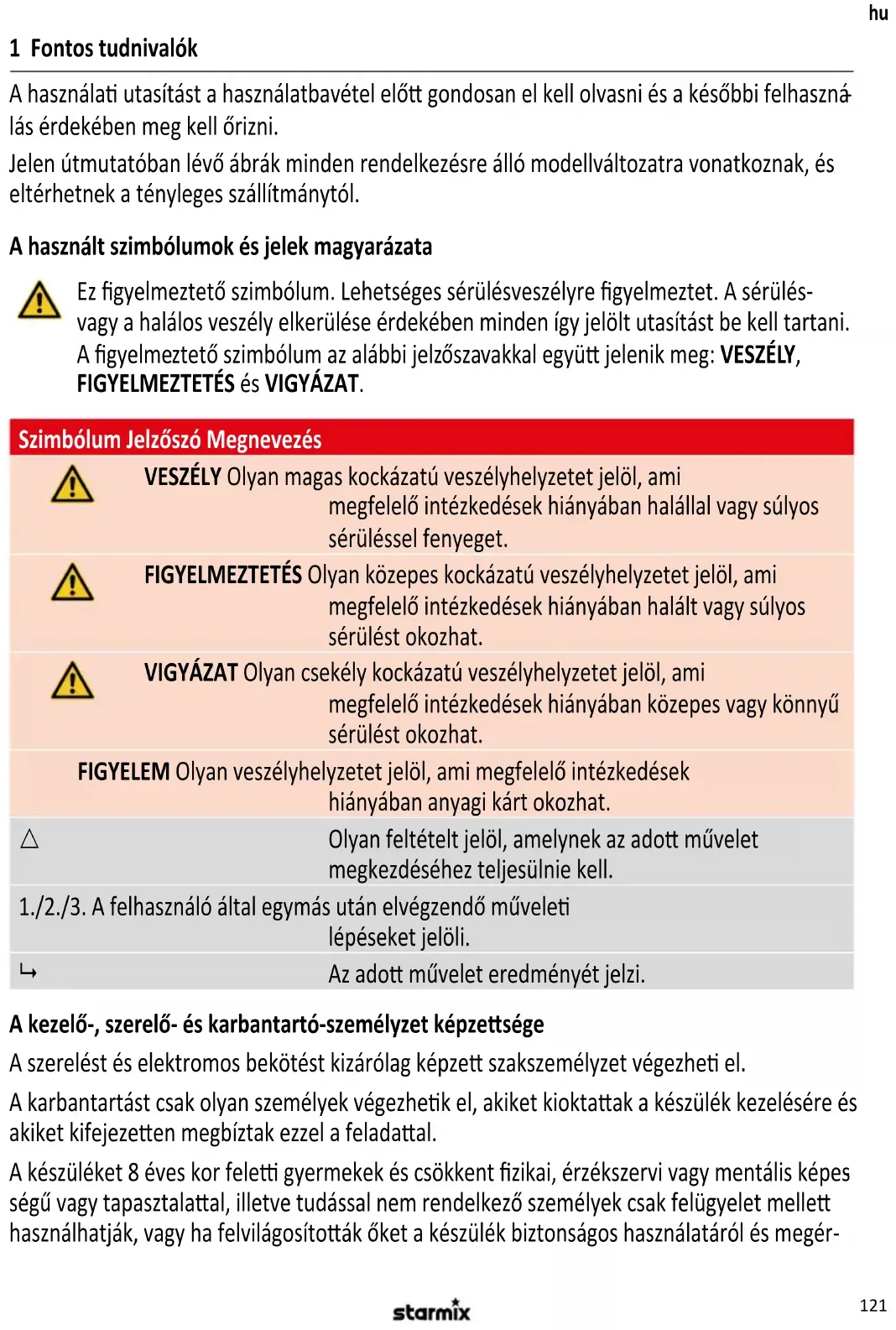 lás érdekében meg kell őrizni. Jelen útmutatóban lévő ábrák minden rendelkezésre álló modellváltozatra vonatkoznak, és eltérhetnek a tényleges szállítmánytól. A használt szimbólumok és jelek magyarázata Ez gyelmeztető szimbólum. Lehetséges sérülésveszélyre gyelmeztet. A sérülés- vagy a halálos veszély elkerülése érdekében minden így jelölt utasítást be kell tartani. A gyelmeztető szimbólum az alábbi jelzőszavakkal együ jelenik meg: VESZÉLY, FIGYELMEZTETÉS és VIGYÁZAT. Szimbólum Jelzőszó Megnevezés VESZÉLY Olyan magas kockázatú veszélyhelyzetet jelöl, ami megfelelő intézkedések hiányában halállal vagy súlyos sérüléssel fenyeget. FIGYELMEZTETÉS Olyan közepes kockázatú veszélyhelyzetet jelöl, ami megfelelő intézkedések hiányában halált vagy súlyos sérülést okozhat. VIGYÁZAT Olyan csekély kockázatú veszélyhelyzetet jelöl, ami megfelelő intézkedések hiányában közepes vagy könnyű sérülést okozhat. FIGYELEM Olyan veszélyhelyzetet jelöl, ami megfelelő intézkedések hiányában anyagi kárt okozhat.