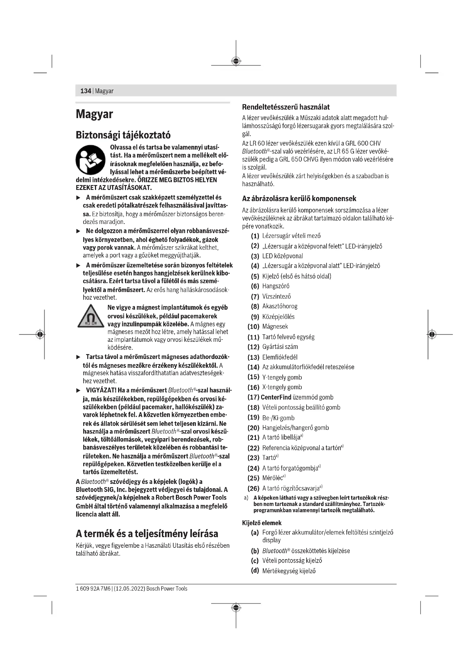 Údržba aservis Údržba ačistenie Laserový prijímač udržiavajte vždy čistý. Neponárajte laserový prijímač do vody ani do iných kvapalín. Znečistenia utrite vlhkou mäkkou handričkou. Nepoužívajte žiadne čistiace prostriedky či rozpúšťadlá. Zákaznícka služba aporadenstvo ohľadom použitia Servisné stredisko Vám odpovie na otázky týkajúce sa opravy aúdržby Vášho produktu ako aj náhradných dielov. Rozkladové výkresy ainformácie onáhradných dieloch náj- dete tiež na: www.bosch-pt.com Vprípade otázok týkajúcich sa našich výrobkov apríslušen- stva Vám ochotne pomôže poradenský tím Bosch. Vprípade akýchkoľvek otázok aobjednávok náhradných dielov uvádzajte bezpodmienečne 10‑miestne vecné číslo uvedené na typovom štítku výrobku. Slovakia Na www.bosch-pt.sk si môžete objednať opravu vášho stroja alebo náhradné diely online. Tel.: +421 2 48 703 800 Fax: +421 2 48 703 801 E-Mail: servis.naradia@sk.bosch.com www.bosch-pt.sk Ďalšie adresy servisov nájdete na: www.bosch-pt.com/serviceaddresses Likvidácia Laserový prijímač, príslušenstvo aobaly odovzdajte na recykláciu vsúlade sochranou životného prostredia. Laserový prijímač abatérie neodhadzujte do domového odpadu! Len pre krajinyEÚ: Podľa európskej smernice 2012/19/EÚ oodpade zelektrických aelektronických zariadení apodľa jej trans- pozície vnárodnom práve sa musia už nepoužiteľné laserové prijímače a, podľa európskej smernice 2006/66/ES, po- škodené alebo vybité akumulátory/batérie zbierať separova- ne aodovzdať na recykláciu vsúlade sochranou životného prostredia. Pri nesprávnej likvidácii môžu mať staré elektrické aelektro- nické zariadenia kvôli možnej prítomnosti nebezpečných látok škodlivý vplyv na životné prostredie aľudské zdravie. Bosch Power Tools 1 609 92A 7M6 | (12.05.2022)134 | Magyar Magyar Biztonsági tájékoztató Olvassa el és tartsa be valamennyi utasí- tást. Ha a mérőműszert nem a mellékelt elő- írásoknak megfelelően használja, ez befo- lyással lehet a mérőműszerbe beépített vé- delmi intézkedésekre. ŐRIZZE MEG BIZTOS HELYEN EZEKET AZ UTASÍTÁSOKAT. u A mérőműszert csak szakképzett személyzettel és csak eredeti pótalkatrészek felhasználásával javíttas- sa. Ez biztosítja, hogy a mérőműszer biztonságos beren- dezés maradjon. u Ne dolgozzon a mérőműszerrel olyan robbanásveszé- lyes környezetben, ahol éghető folyadékok, gázok vagy porok vannak. A mérőműszer szikrákat kelthet, amelyek a port vagy a gőzöket meggyújthatják. u A mérőműszer üzemeltetése során bizonyos feltételek teljesülése esetén hangos hangjelzések kerülnek kibo- csátásra. Ezért tartsa távol a fülétől és más szemé- lyektől a mérőműszert. Az erős hang halláskárosodások- hoz vezethet. Ne vigye a mágnest implantátumok és egyéb orvosi készülékek, például pacemakerek vagy inzulinpumpák közelébe. A mágnes egy mágnesesmezőt hoz létre, amely hatással lehet az implantátumok vagy orvosi készülékek mű- ködésére. u Tartsa távol a mérőműszert mágneses adathordozók- tól és mágneses mezőkre érzékeny készülékektől. A mágnesek hatása visszafordíthatatlan adatveszteségek- hez vezethet. u VIGYÁZAT! Ha a mérőműszert Bluetooth®-szal használ- ja, más készülékekben, repülőgépekben és orvosi ké- szülékekben (például pacemaker, hallókészülék) za- varok léphetnek fel. A közvetlen környezetben embe- rek és állatok sérülését sem lehet teljesen kizárni. Ne használja a mérőműszert Bluetooth®-szal orvosi készü- lékek, töltőállomások, vegyipari berendezések, rob- banásveszélyes területek közelében és robbantási te- rületeken. Ne használja a mérőműszert Bluetooth®-szal repülőgépeken. Közvetlen testközelben kerülje el a tartós üzemeltetést. A Bluetooth® szóvédjegy és a képjelek (logók) a Bluetooth SIG, Inc. bejegyzett védjegyei és tulajdonai. A szóvédjegynek/a képjelnek a Robert Bosch Power Tools GmbH által történő valamennyi alkalmazása a megfelelő licencia alatt áll. A termék és a teljesítmény leírása Kérjük, vegye figyelembe a Használati Utasítás első részében található ábrákat. Rendeltetésszerű használat A lézer vevőkészülék a Műszaki adatok alatt megadott hul- lámhosszúságú forgó lézersugarak gyors megtalálására szol- gál. Az LR60 lézer vevőkészülék ezen kívül a GRL600CHV Bluetooth®-szal való vezérlésére, az LR65G lézer vevőké- szülék pedig a GRL650CHVG ilyen módon való vezérlésére is szolgál. A lézer vevőkészülék zárt helyiségekben és a szabadban is használható. Az ábrázolásra kerülő komponensek Az ábrázolásra kerülő komponensek sorszámozása a lézer vevőkészüléknek az ábrákat tartalmazó oldalon található ké- pére vonatkozik. (1) Lézersugár vételi mező (2) „Lézersugár a középvonal felett“ LED-irányjelző (3) LED középvonal (4) „Lézersugár a középvonal alatt“ LED-irányjelző (5) Kijelző (első és hátsó oldal) (6) Hangszóró (7) Vízszintező (8) Akasztóhorog (9) Középjelölés (10) Mágnesek (11) Tartó felvevő egység (12) Gyártási szám (13) Elemfiókfedél (14) Az akkumulátorfiókfedél reteszelése (15) Y‑tengely gomb (16) X‑tengely gomb (17) CenterFind üzemmód gomb (18) Vételi pontosság beállító gomb (19) Be-/Ki-gomb (20) Hangjelzés/hangerő gomb (21) A tartó libellája