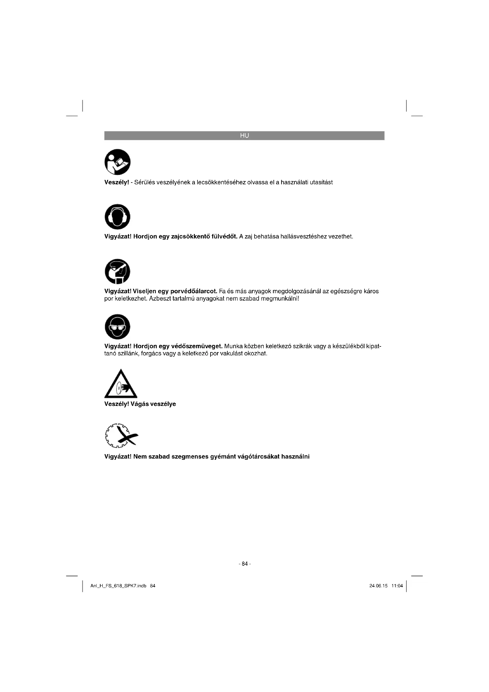 Vigyázat! Nem szabad szegmenses gyémánt vágótárcsákat használni Veszély! Vágás veszélye Veszély! - Sérülés veszélyének a lecsökkentéséhez olvassa el a használati utasítást Vigyázat! Hordjon egy zajcsökkentő fülvédőt. A zaj behatása hallásvesztéshez vezethet. Vigyázat! Hordjon egy védőszemüveget. Munka közben keletkező szikrák vagy a készülékből kipat- tanó szillánk, forgács vagy a keletkező por vakulást okozhat. Vigyázat! Viseljen egy porvédőálarcot. Fa és más anyagok megdolgozásánál az egészségre káros por keletkezhet. Azbeszt tartalmú anyagokat nem szabad megmunkálni! Anl_H_FS_618_SPK7.indb 84Anl_H_FS_618_SPK7.indb 84 24.06.15 11:0424.06.15 11:04HU