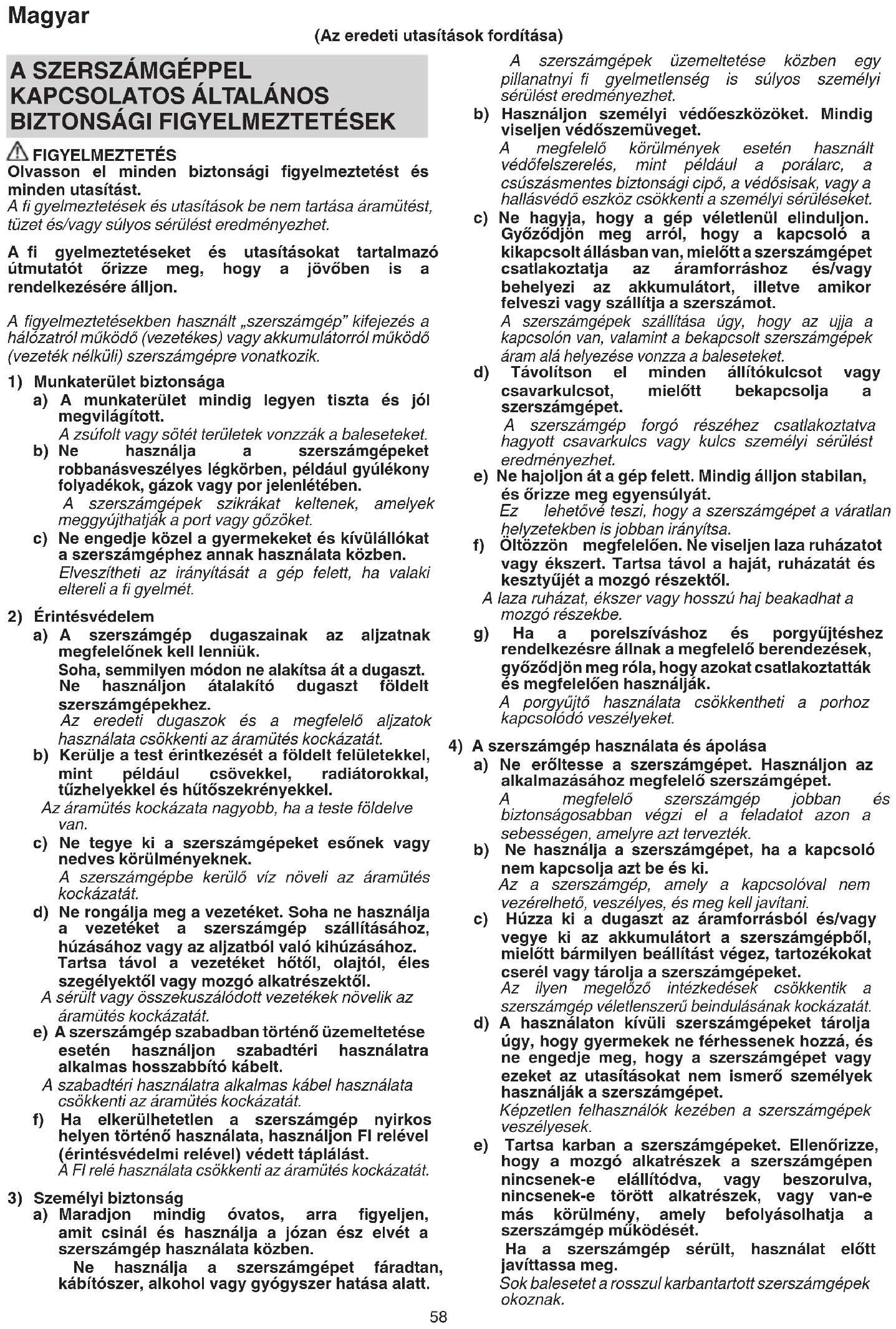 FIGYELMEZTETÉS Olvasson el minden biztonsági fi gyelmeztetést és minden utasítást. A fi gyelmeztetések és utasítások be nem tartása áramütést, tüzet és/vagy súlyos sérülést eredményezhet. A fi gyelmeztetéseket és utasításokat tartalmazó útmutatót őrizze meg, hogy a jövőben is a rendelkezésére álljon. A fi gyelmeztetésekben használt „szerszámgép” kifejezés a hálózatról működő (vezetékes) vagy akkumulátorról működő (vezeték nélküli) szerszámgépre vonatkozik.