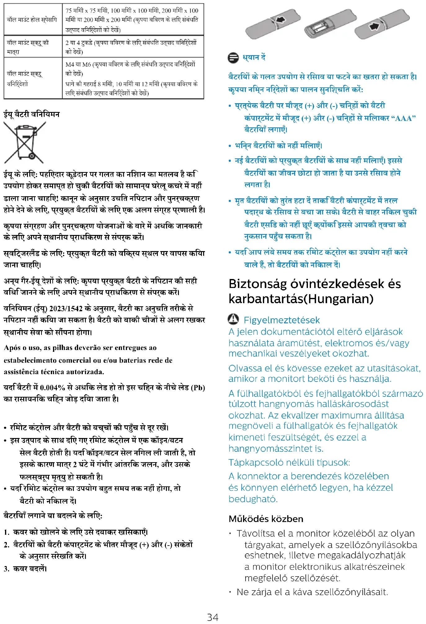 - Ha úgy gondolja, hogy az elemet lenyelték vagy testbe jutott, azonnal forduljon orvoshoz. Falra szerelési útmutató (a falra szerelési funkcióval rendelkező modellekre vonatkozik) Ez a termékcsomag nem tartalmaz falra szereléshez való pótalkatrészeket. Ha falra szerelés szükséges, kérjük, mindenképpen lépjen kapcsolatba a gyártóval. Fali rögzítőfuratok távolsága 75 mm x 75 mm, 100 mm x 100 mm, 200 mm x 100 mm vagy 200 mm x 200 mm (a részletekért kérjük, tekintse meg a megfelelő termékleírásokat) Fali rögzítő csavarok mennyisége 2 vagy 4 darab (a részletekért kérjük, olvassa el a megfelelő termékleírást)36 A falra szereléshez szükséges csavarok jellemzői M4 vagy M6 (a részleteket lásd a megfelelő termékleírásokban) Menetmélység 8 mm, 10 mm vagy 12 mm (a részletekért kérjük, tekintse meg a megfelelő termékleírást) Az Európai Unió akkumulátorokra vonatkozó rendelete EU esetén: Az áthúzott szemetes azt jelzi, hogy a használt akkumulátorokat tilos háztartási hulladékba dobni! A használt akkumulátorok számára egy külön gyűjtőrendszer létezik, amely lehetővé teszi a jogszabályoknak megfelelő kezelést és újrahasznosítást. A gyűjtési és újrahasznosítási módokról érdeklődjön a helyi hatóságnál. Svájc esetén: A használt elemet a vásárlás helyére kell visszavinni. Más, EU-n kívüli országok esetén: A használt elemek helyes hulladékkezeléséről érdeklődjön a helyi hatóságnál. A 2023/1542 EU rendelet értelmében az elemek ártalmatlanítása nem történhet meg helytelenül. Az elemeket külön kell gyűjteni a helyi szolgáltató számára. Após o uso, as pilhas deverão ser entregues ao estabelecimento comercial ou e/ou baterias rede de assistência técnica autorizada. Ha az akkumulátor(ok) 0,004 %-nál több ólmot tartalmaz(nak), a szimbólum alatt az ólom (Pb) kémiai jelét kell feltüntetni.