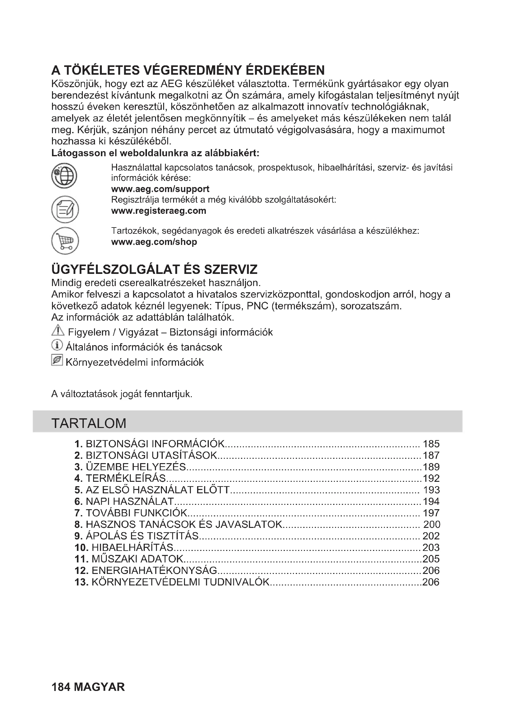 Mindig eredeti cserealkatrészeket használjon. Amikor felveszi a kapcsolatot a hivatalos szervizközponttal, gondoskodjon arról, hogy a következő adatok kéznél legyenek: Típus, PNC (termékszám), sorozatszám. Az információk az adattáblán találhatók. Figyelem / Vigyázat – Biztonsági információk Általános információk és tanácsok Környezetvédelmi információk A változtatások jogát fenntartjuk. TARTALOM