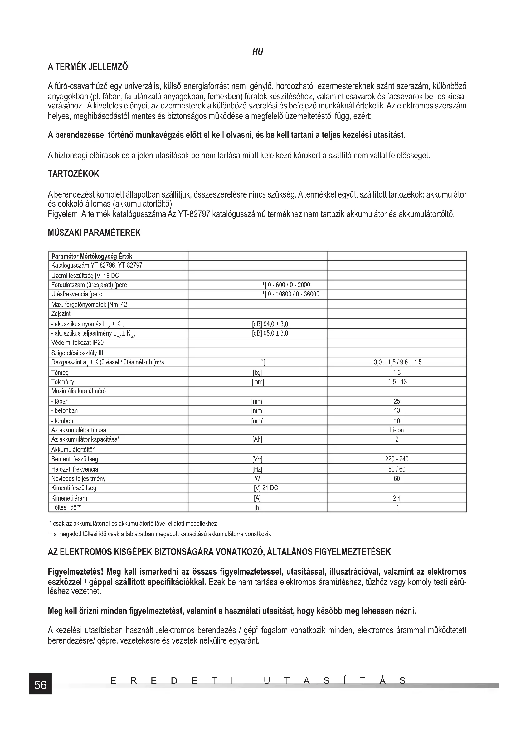- csak az akkumulátorral és akkumulátortöltővel ellátott modellekhez ** a megadott töltési idő csak a táblázatban megadott kapacitású akkumulátorra vonatkozik AZ ELEKTROMOS KISGÉPEK BIZTONSÁGÁRA VONATKOZÓ, ÁLTALÁNOS FIGYELMEZTETÉSEK Figyelmeztetés! Meg kell ismerkedni az összes fi gyelmeztetéssel, utasítással, illusztrációval, valamint az elektromos eszközzel / géppel szállított specifi kációkkal. Ezek be nem tartása elektromos áramütéshez, tűzhöz vagy komoly testi sérü- léshez vezethet. Meg kell őrizni minden fi gyelmeztetést, valamint a használati utasítást, hogy később meg lehessen nézni. A kezelési utasításban használt „elektromos berendezés / gép” fogalom vonatkozik minden, elektromos árammal működtetett berendezésre/ gépre, vezetékesre és vezeték nélkülire egyaránt.57