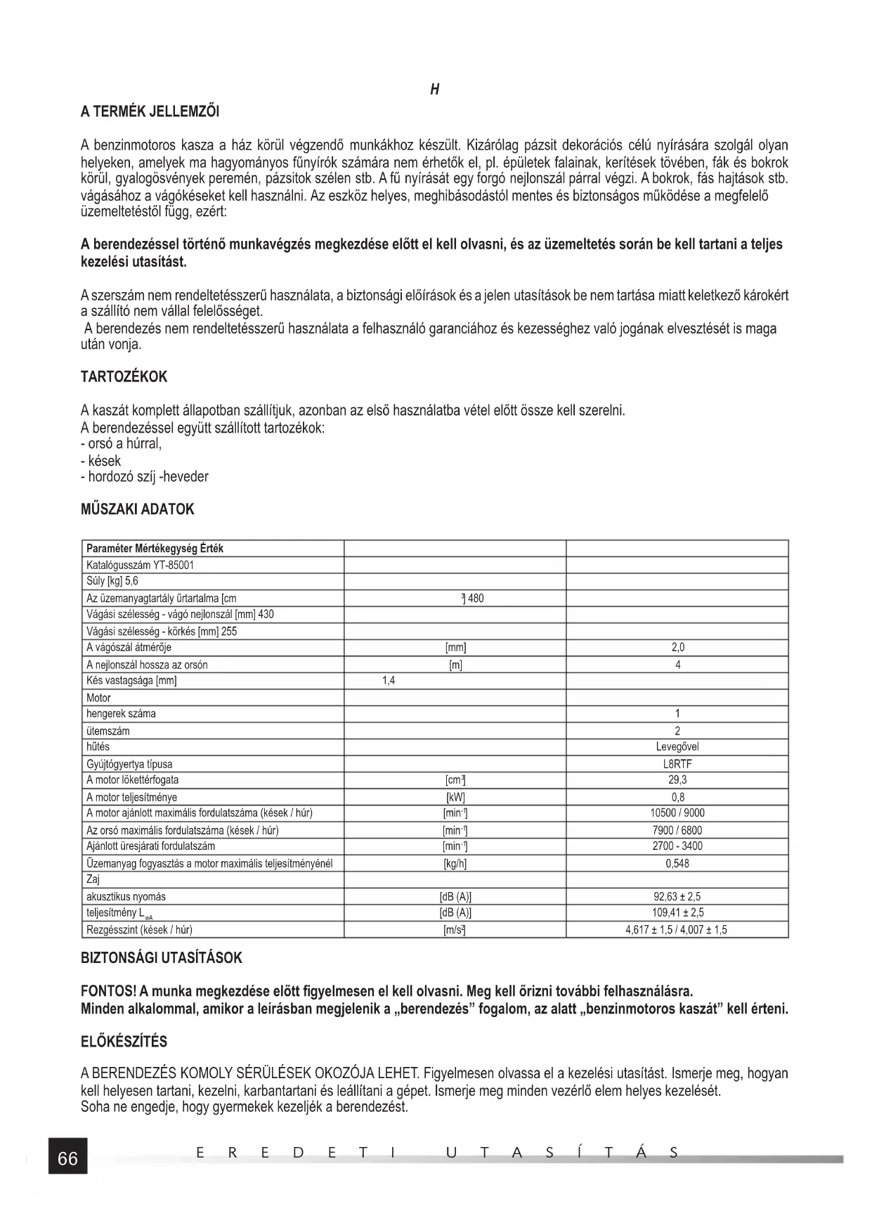 Paraméter Mértékegység Érték Katalógusszám YT-85001 Súly [kg] 5,6 Az üzemanyagtartály űrtartalma [cm