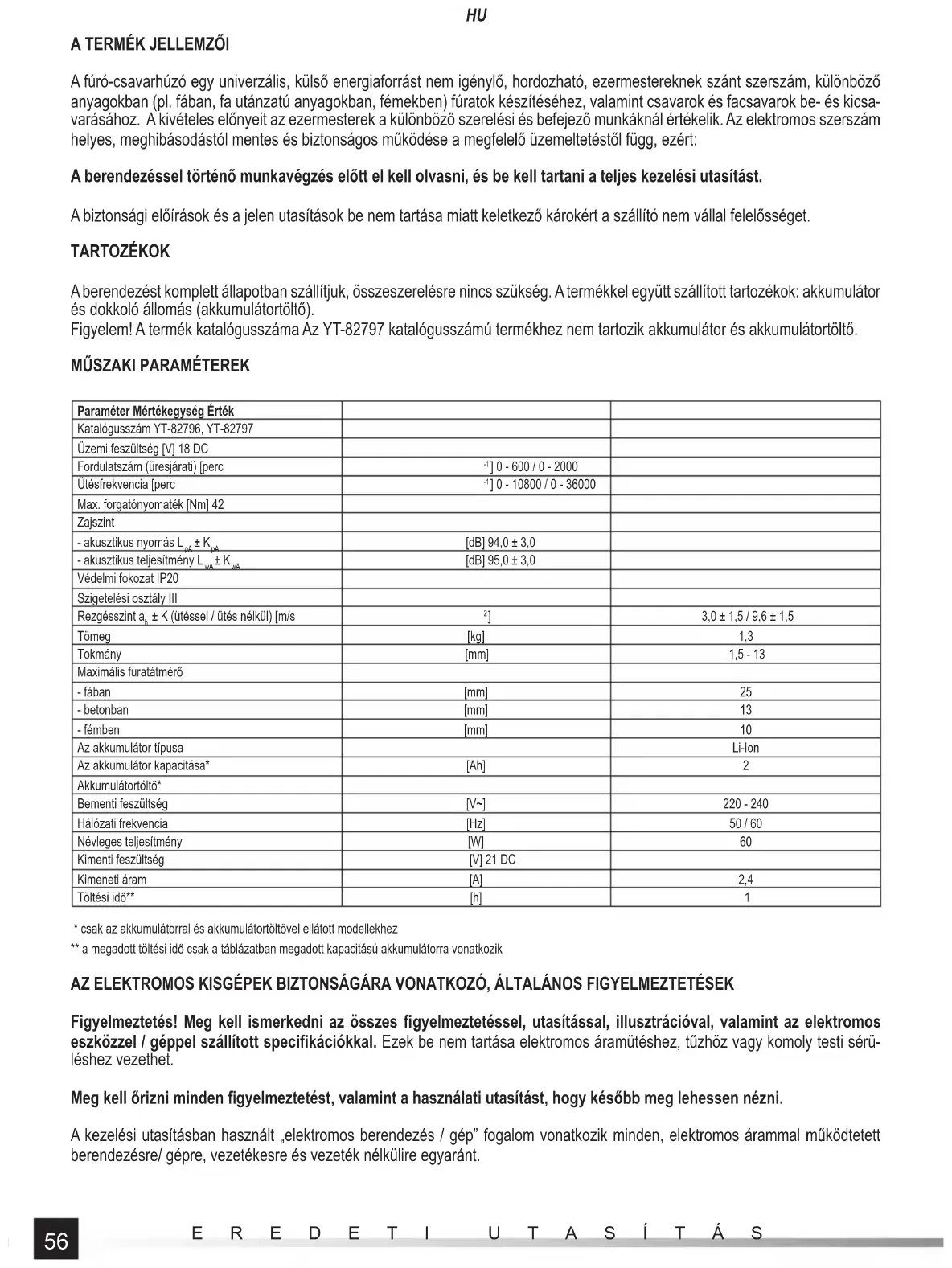 - csak az akkumulátorral és akkumulátortöltővel ellátott modellekhez ** a megadott töltési idő csak a táblázatban megadott kapacitású akkumulátorra vonatkozik AZ ELEKTROMOS KISGÉPEK BIZTONSÁGÁRA VONATKOZÓ, ÁLTALÁNOS FIGYELMEZTETÉSEK Figyelmeztetés! Meg kell ismerkedni az összes fi gyelmeztetéssel, utasítással, illusztrációval, valamint az elektromos eszközzel / géppel szállított specifi kációkkal. Ezek be nem tartása elektromos áramütéshez, tűzhöz vagy komoly testi sérü- léshez vezethet. Meg kell őrizni minden fi gyelmeztetést, valamint a használati utasítást, hogy később meg lehessen nézni. A kezelési utasításban használt „elektromos berendezés / gép” fogalom vonatkozik minden, elektromos árammal működtetett berendezésre/ gépre, vezetékesre és vezeték nélkülire egyaránt.57