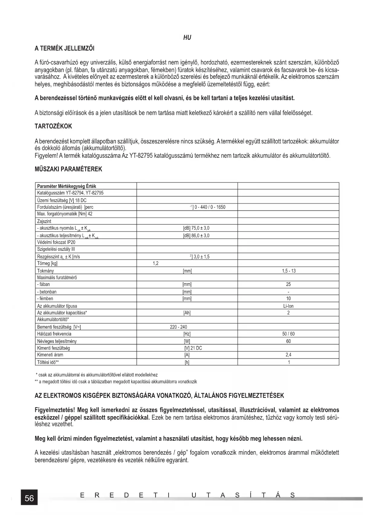 - csak az akkumulátorral és akkumulátortöltővel ellátott modellekhez ** a megadott töltési idő csak a táblázatban megadott kapacitású akkumulátorra vonatkozik AZ ELEKTROMOS KISGÉPEK BIZTONSÁGÁRA VONATKOZÓ, ÁLTALÁNOS FIGYELMEZTETÉSEK Figyelmeztetés! Meg kell ismerkedni az összes fi gyelmeztetéssel, utasítással, illusztrációval, valamint az elektromos eszközzel / géppel szállított specifi kációkkal. Ezek be nem tartása elektromos áramütéshez, tűzhöz vagy komoly testi sérü- léshez vezethet. Meg kell őrizni minden fi gyelmeztetést, valamint a használati utasítást, hogy később meg lehessen nézni. A kezelési utasításban használt „elektromos berendezés / gép” fogalom vonatkozik minden, elektromos árammal működtetett berendezésre/ gépre, vezetékesre és vezeték nélkülire egyaránt.57