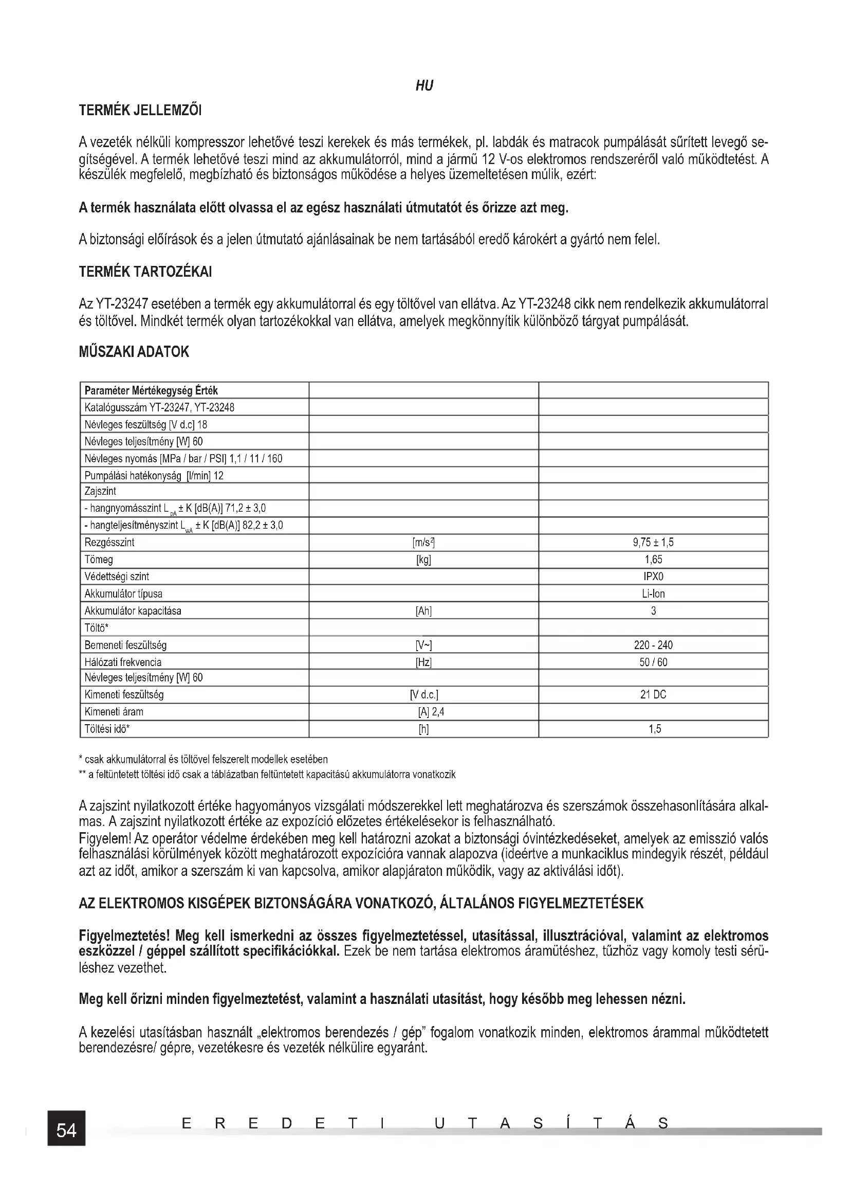 - csak akkumulátorral és töltővel felszerelt modellek esetében ** a feltüntetett töltési idő csak a táblázatban feltüntetett kapacitású akkumulátorra vonatkozik A zajszint nyilatkozott értéke hagyományos vizsgálati módszerekkel lett meghatározva és szerszámok összehasonlítására alkal- mas. A zajszint nyilatkozott értéke az expozíció előzetes értékelésekor is felhasználható. Figyelem! Az operátor védelme érdekében meg kell határozni azokat a biztonsági óvintézkedéseket, amelyek az emisszió valós felhasználási körülmények között meghatározott expozícióra vannak alapozva (ideértve a munkaciklus mindegyik részét, például azt az időt, amikor a szerszám ki van kapcsolva, amikor alapjáraton működik, vagy az aktiválási időt). AZ ELEKTROMOS KISGÉPEK BIZTONSÁGÁRA VONATKOZÓ, ÁLTALÁNOS FIGYELMEZTETÉSEK Figyelmeztetés! Meg kell ismerkedni az összes fi gyelmeztetéssel, utasítással, illusztrációval, valamint az elektromos eszközzel / géppel szállított specifi kációkkal. Ezek be nem tartása elektromos áramütéshez, tűzhöz vagy komoly testi sérü- léshez vezethet. Meg kell őrizni minden fi gyelmeztetést, valamint a használati utasítást, hogy később meg lehessen nézni. A kezelési utasításban használt „elektromos berendezés / gép” fogalom vonatkozik minden, elektromos árammal működtetett berendezésre/ gépre, vezetékesre és vezeték nélkülire egyaránt.55