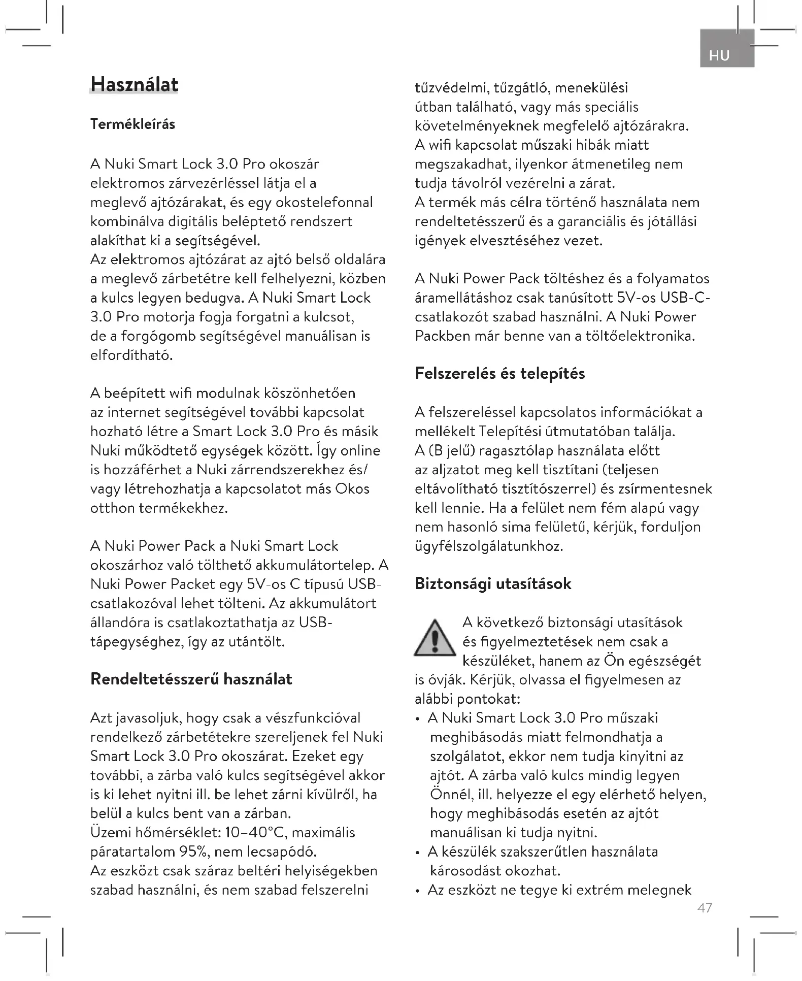 de a forgógomb segítségével manuálisan is elfordítható. A beépített wifi modulnak köszönhetően az internet segítségével további kapcsolat hozható létre a Smart Lock 3.0 Pro és másik Nuki működtető egységek között. Így online is hozzáférhet a Nuki zárrendszerekhez és/ vagy létrehozhatja a kapcsolatot más Okos otthon termékekhez. A Nuki Power Pack a Nuki Smart Lock okoszárhoz való tölthető akkumulátortelep. A Nuki Power Packet egy 5V-os C típusú USB- csatlakozóval lehet tölteni. Az akkumulátort állandóra is csatlakoztathatja az USB- tápegységhez, így az utántölt. Rendeltetésszerű használat Azt javasoljuk, hogy csak a vészfunkcióval rendelkező zárbetétekre szereljenek fel Nuki Smart Lock 3.0 Pro okoszárat. Ezeket egy további, a zárba való kulcs segítségével akkor is ki lehet nyitni ill. be lehet zárni kívülről, ha belül a kulcs bent van a zárban. Üzemi hőmérséklet: 10–40°C, maximális páratartalom 95%, nem lecsapódó. Az eszközt csak száraz beltéri helyiségekben szabad használni, és nem szabad felszerelni tűzvédelmi, tűzgátló, menekülési útban található, vagy más speciális követelményeknek megfelelő ajtózárakra. A wifi kapcsolat műszaki hibák miatt megszakadhat, ilyenkor átmenetileg nem tudja távolról vezérelni a zárat. A termék más célra történő használata nem rendeltetésszerű és a garanciális és jótállási igények elvesztéséhez vezet. A Nuki Power Pack töltéshez és a folyamatos áramellátáshoz csak tanúsított 5V-os USB-C- csatlakozót szabad használni. A Nuki Power Packben már benne van a töltőelektronika. Felszerelés és telepítés A felszereléssel kapcsolatos információkat a mellékelt Telepítési útmutatóban találja. A (B jelű) ragasztólap használata előtt az aljzatot meg kell tisztítani (teljesen eltávolítható tisztítószerrel) és zsírmentesnek kell lennie. Ha a felület nem fém alapú vagy nem hasonló sima felületű, kérjük, forduljon ügyfélszolgálatunkhoz. Biztonsági utasítások A következő biztonsági utasítások és figyelmeztetések nem csak a készüléket, hanem az Ön egészségét is óvják. Kérjük, olvassa el figyelmesen az alábbi pontokat: