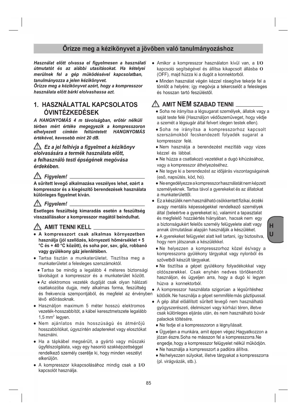 Őrízze meg a kézikönyvet a jövőben való tanulmányozáshoz Használat előtt olvassa el gyelmesen a használati útmutatót és az alábbi utasításokat. Ha kételyei merülnek fel a gép működésével kapcsolatban, tanulmányozza a jelen kézikönyvet. Őrízze meg a kézikönyvet azért, hogy a kompresszor használata előtt bárki elolvashassa azt.