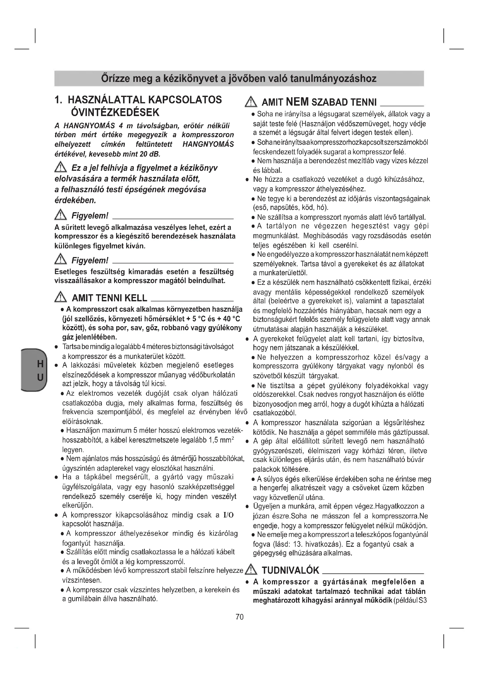 A HANGNYOMÁS 4 m távolságban, erőtér nélküli térben mért értéke megegyezik a kompresszoron elhelyezett címkén feltüntetett HANGNYOMÁS értékével, kevesebb mint 20 dB. Ez a jel felhívja a gyelmet a kézikönyv elolvasására a termék használata előtt, a felhasználó testi épségének megóvása érdekében. Figyelem! A sűrített levegő alkalmazása veszélyes lehet, ezért a kompresszor és a kiegészítő berendezések használata különleges gyelmet kíván. Figyelem! Esetleges feszültség kimaradás esetén a feszültség visszaállásakor a kompresszor magától beindulhat.