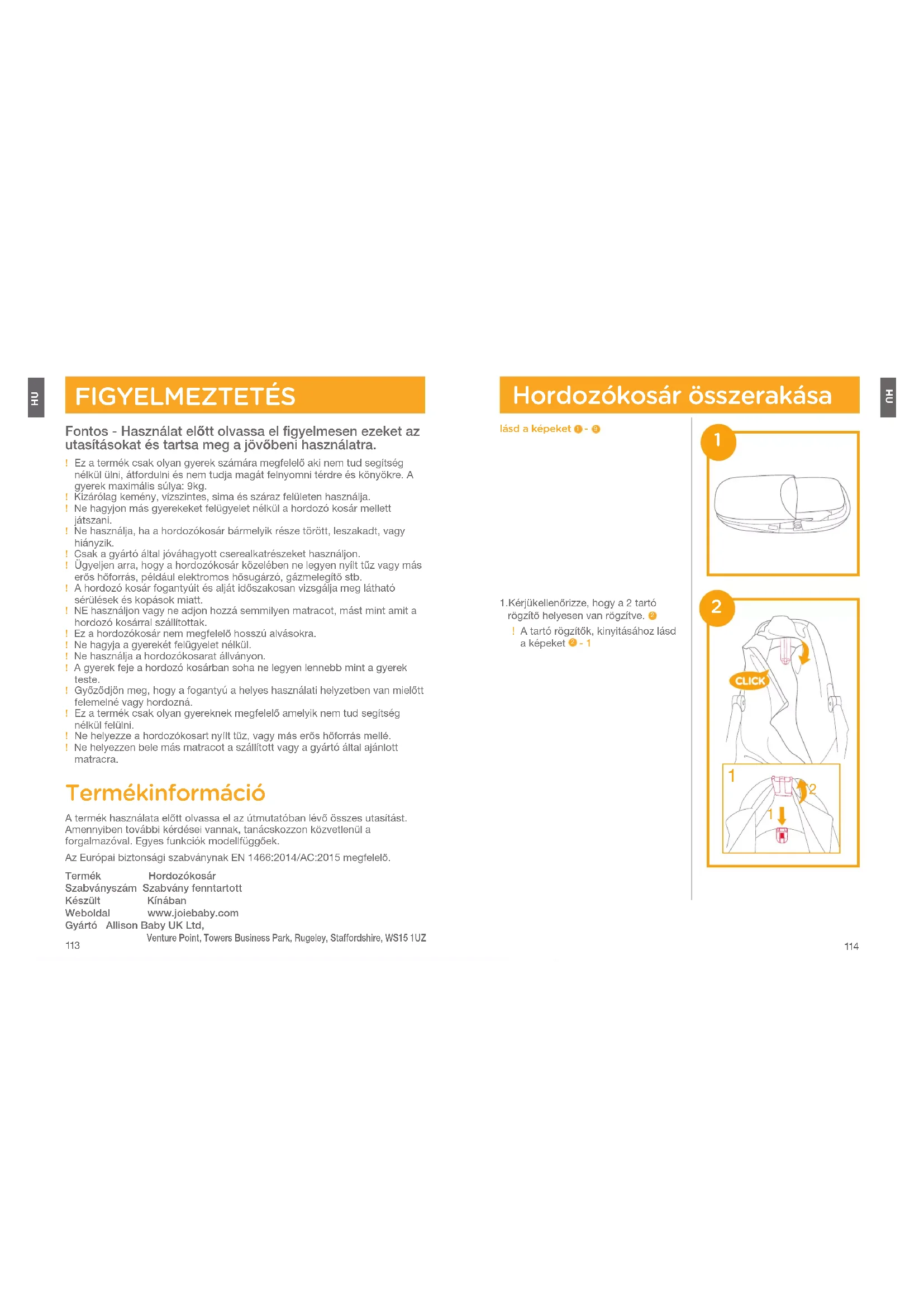 FIGYELMEZTETÉS Fontos - Használat előtt olvassa el figyelmesen ezeket az utasításokat és tartsa meg a jövőbeni használatra. ! Ez a termék csak olyan gyerek számára megfelelő aki nem tud segítség nélkül ülni, átfordulni és nem tudja magát felnyomni térdre és könyökre. A gyerek maximális súlya: 9kg.! Kizárólag kemény, vízszintes, sima és száraz felületen használja.! Ne hagyjon más gyerekeket felügyelet nélkül a hordozó kosár mellett játszani.! Ne használja, ha a hordozókosár bármelyik része törött, leszakadt, vagy hiányzik.! Csak a gyártó által jóváhagyott cserealkatrészeket használjon. ! Ügyeljen arra, hogy a hordozókosár közelében ne legyen nyílt tűz vagy más erős hőforrás, például elektromos hősugárzó, gázmelegítő stb. ! A hordozó kosár fogantyúit és alját időszakosan vizsgálja meg látható sérülések és kopások miatt.! NE használjon vagy ne adjon hozzá semmilyen matracot, mást mint amit a hordozó kosárral szállítottak.! Ez a hordozókosár nem megfelelő hosszú alvásokra.! Ne hagyja a gyerekét felügyelet nélkül.! Ne használja a hordozókosarat állványon.! A gyerek feje a hordozó kosárban soha ne legyen lennebb mint a gyerek teste. ! Győződjön meg, hogy a fogantyú a helyes használati helyzetben van mielőtt felemelné vagy hordozná. ! Ez a termék csak olyan gyereknek megfelelő amelyik nem tud segítség nélkül felülni. ! Ne helyezze a hordozókosart nyílt tűz, vagy más erős hőforrás mellé. ! Ne helyezzen bele más matracot a szállított vagy a gyártó által ajánlott matracra. Termékinformáció A termék használata előtt olvassa el az útmutatóban lévő összes utasítást. Amennyiben további kérdései vannak, tanácskozzon közvetlenül a forgalmazóval. Egyes funkciók modellfüggőek.Az Európai biztonsági szabványnak EN 1466:2014/AC:2015 megfelelő.Termék HordozókosárSzabványszám Szabvány fenntartottKészült KínábanWeboldal www.joiebaby.comGyártó Allison Baby UK Ltd, Venture Point, Towers Business Park, Rugeley, Staffordshire, WS15 1UZ Hordozókosár összerakása lásd a képeket
