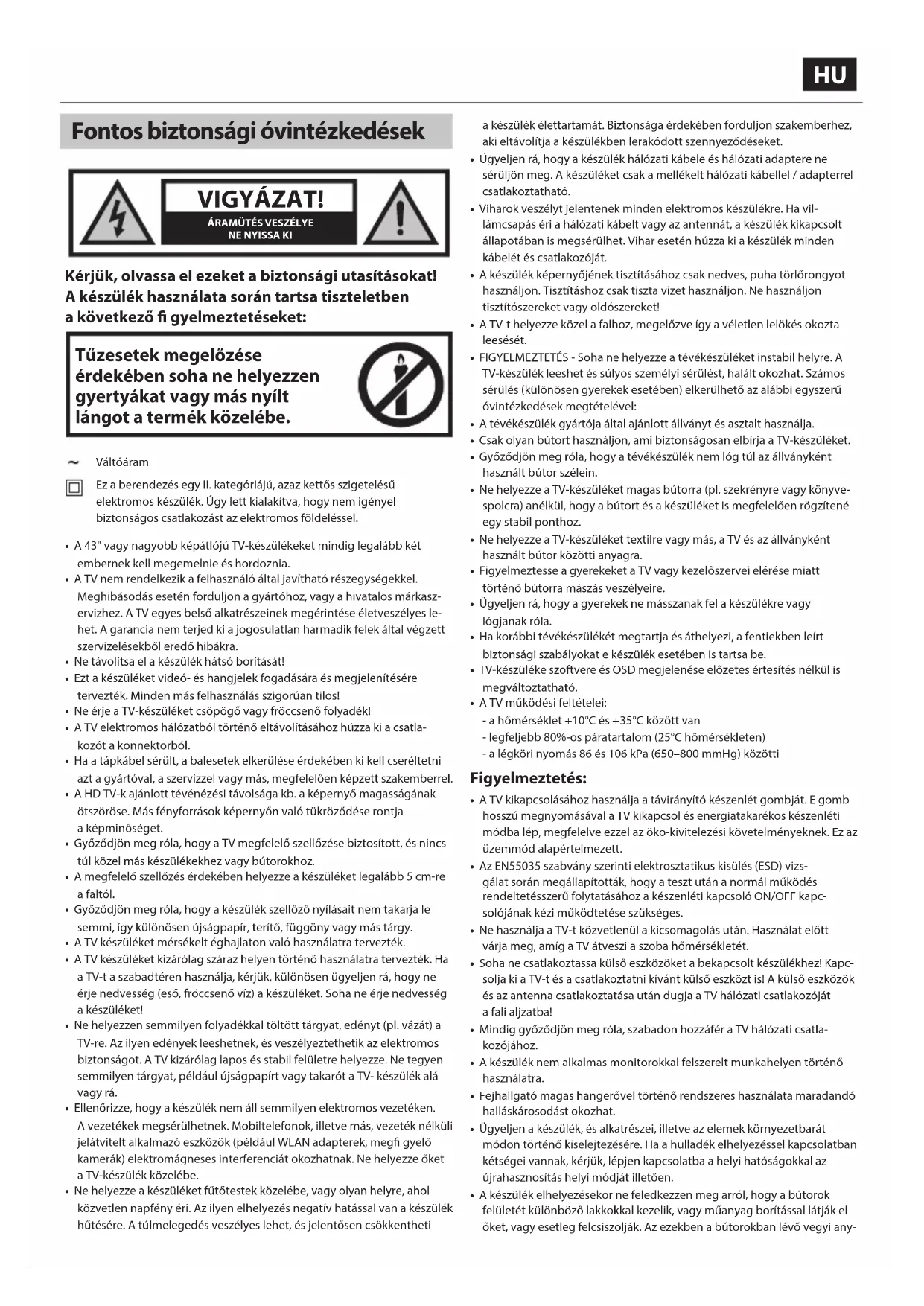 - A 43" vagy nagyobb képátlójú TV-készülékeket mindig legalább két embernek kell megemelnie és hordoznia.