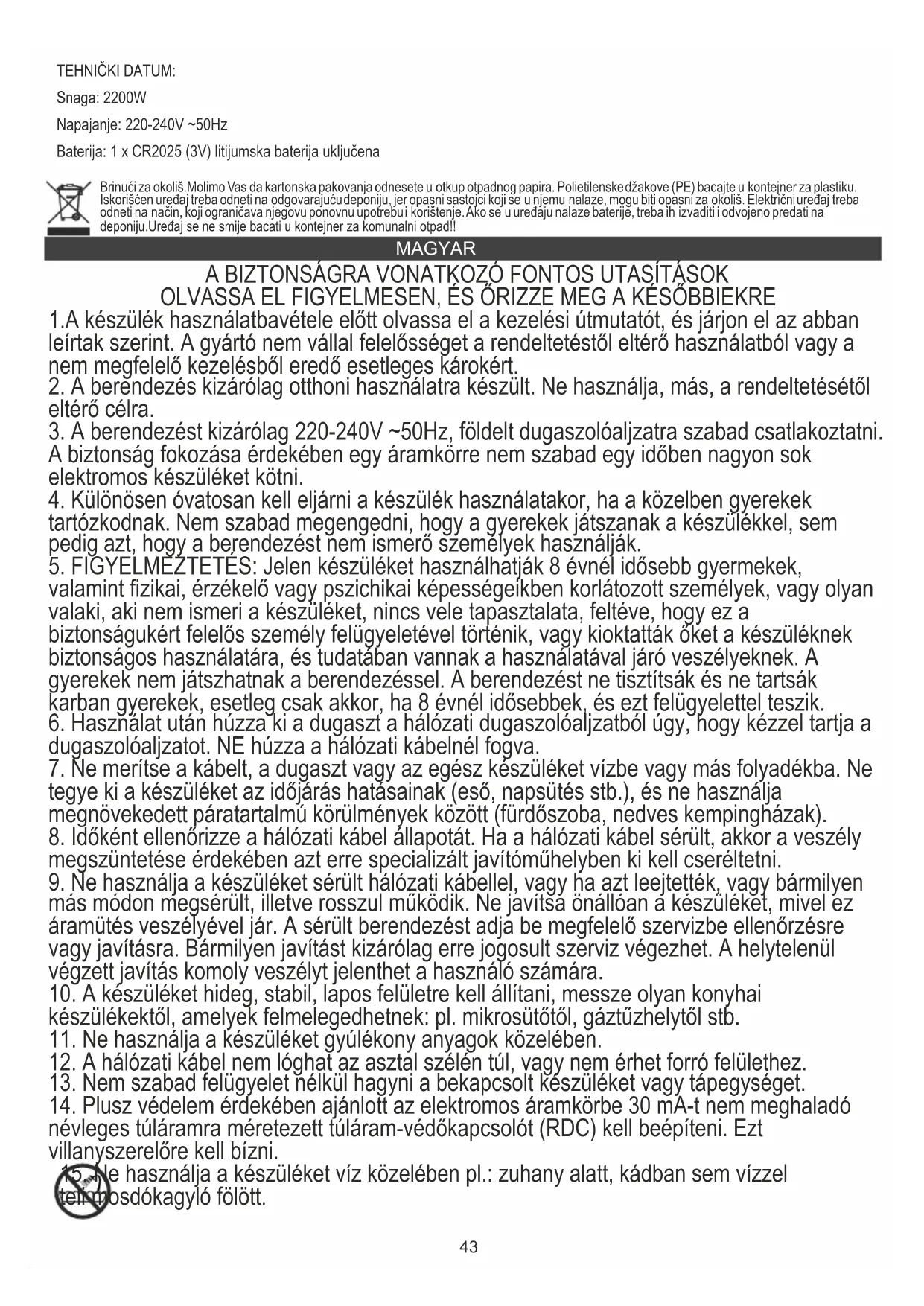 Brinući za okoliš.Molimo Vas da kartonska pakovanja odnesete u otkup otpadnog papira. Polietilenske džakove (PE) bacajte u kontejner za plastiku. Iskorišćen uređaj treba odneti na odgovarajuću deponiju, jer opasni sastojci koji se u njemu nalaze, mogu biti opasni za okoliš. Električni uređaj treba odneti na način, koji ograničava njegovu ponovnu upotrebu i korištenje. Ako se u uređaju nalaze baterije, treba ih izvaditi i odvojeno predati na deponiju.Uređaj se ne smije bacati u kontejner za komunalni otpad!! MAGYAR A BIZTONSÁGRA VONATKOZÓ FONTOS UTASÍTÁSOK OLVASSA EL FIGYELMESEN, ÉS ŐRIZZE MEG A KÉSŐBBIEKRE 1.A készülék használatbavétele előtt olvassa el a kezelési útmutatót, és járjon el az abban leírtak szerint. A gyártó nem vállal felelősséget a rendeltetéstől eltérő használatból vagy a nem megfelelő kezelésből eredő esetleges károkért.