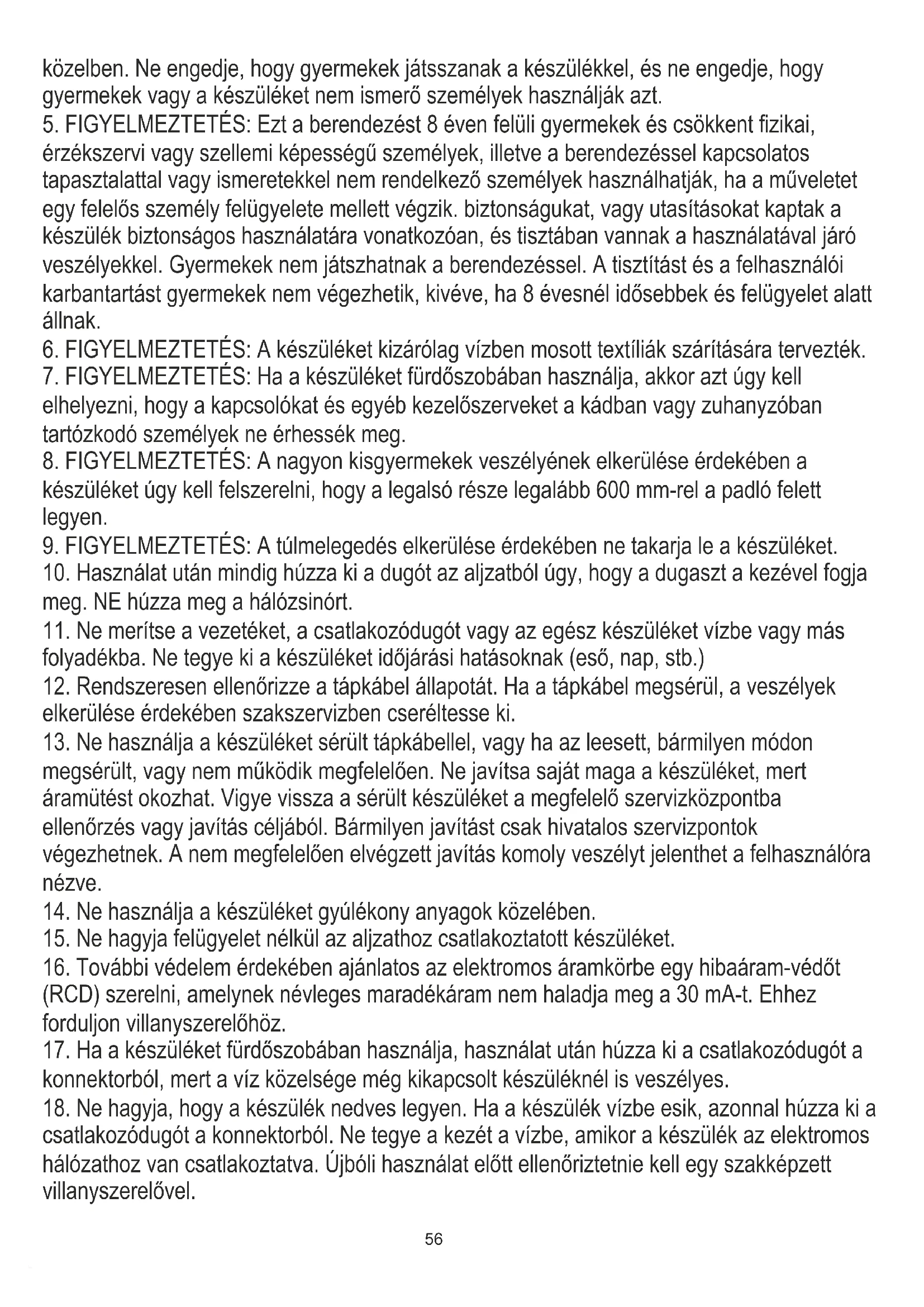 17. Ha a készüléket fürdőszobában használja, használat után húzza ki a csatlakozódugót a
