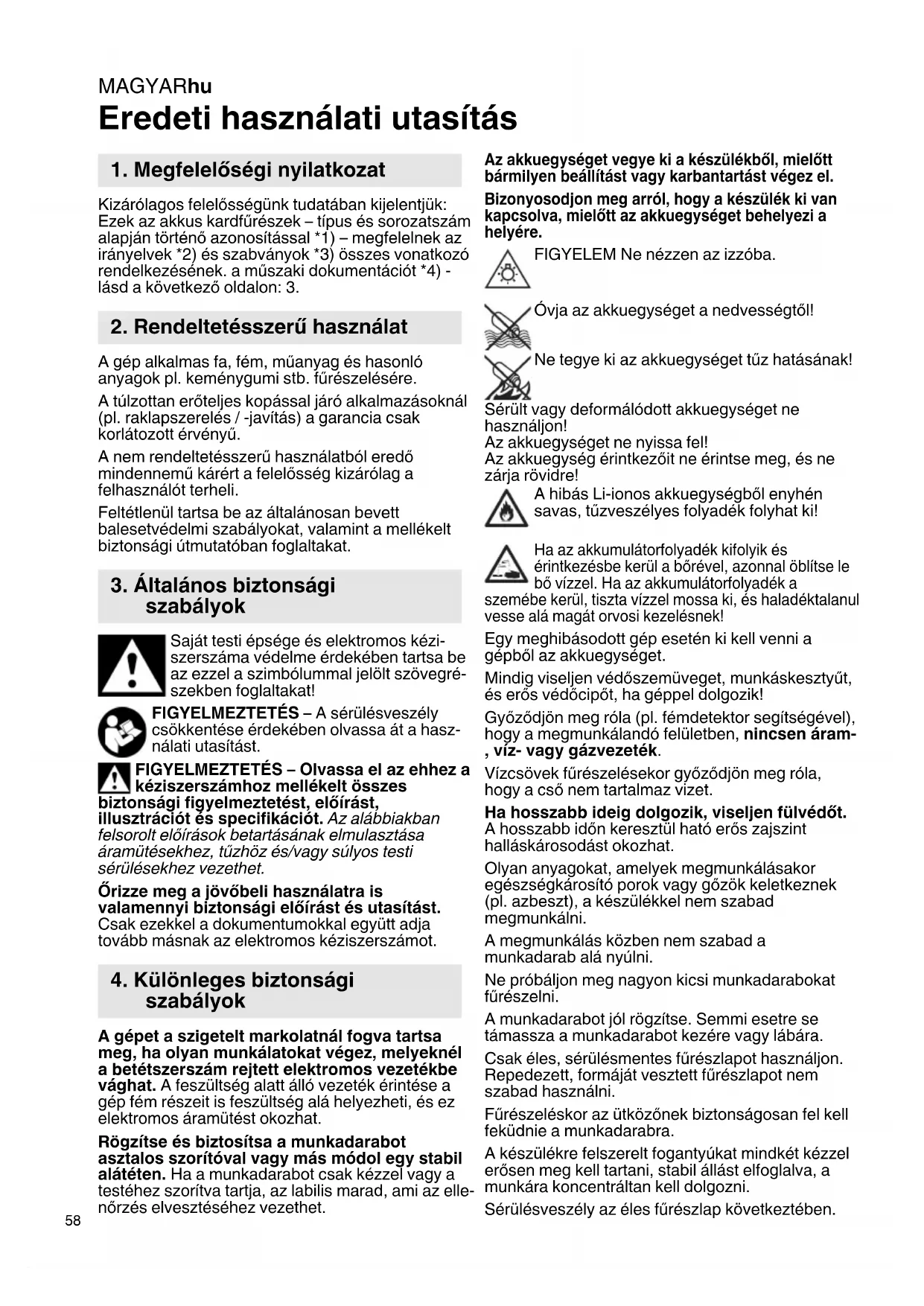 Eredeti használati utasítás Kizárólagos felelősségünk tudatában kijelentjük: Ezek az akkus kardfűrészek – típus és sorozatszám alapján történő azonosítással *1) – megfelelnek az irányelvek *2) és szabványok *3) összes vonatkozó rendelkezésének. a műszaki dokumentációt *4) - lásd a következő oldalon: 3. A gép alkalmas fa, fém, műanyag és hasonló anyagok pl. keménygumi stb. fűrészelésére. A túlzottan erőteljes kopással járó alkalmazásoknál (pl. raklapszerelés / -javítás) a garancia csak korlátozott érvényű. A nem rendeltetésszerű használatból eredő mindennemű kárért a felelősség kizárólag a felhasználót terheli. Feltétlenül tartsa be az általánosan bevett balesetvédelmi szabályokat, valamint a mellékelt biztonsági útmutatóban foglaltakat. Saját testi épsége és elektromos kézi- szerszáma védelme érdekében tartsa be az ezzel a szimbólummal jelölt szövegré- szekben foglaltakat! FIGYELMEZTETÉS – A sérülésveszély csökkentése érdekében olvassa át a hasz- nálati utasítást. FIGYELMEZTETÉS – Olvassa el az ehhez a kéziszerszámhoz mellékelt összes biztonsági figyelmeztetést, előírást, illusztrációt és specifikációt. Az alábbiakban felsorolt előírások betartásának elmulasztása áramütésekhez, tűzhöz és/vagy súlyos testi sérülésekhez vezethet. Őrizze meg a jövőbeli használatra is valamennyi biztonsági előírást és utasítást. Csak ezekkel a dokumentumokkal együtt adja tovább másnak az elektromos kéziszerszámot. A gépet a szigetelt markolatnál fogva tartsa meg, ha olyan munkálatokat végez, melyeknél a betétszerszám rejtett elektromos vezetékbe vághat. A feszültség alatt álló vezeték érintése a gép fém részeit is feszültség alá helyezheti, és ez elektromos áramütést okozhat. Rögzítse és biztosítsa a munkadarabot asztalos szorítóval vagy más módol egy stabil alátéten. Ha a munkadarabot csak kézzel vagy a testéhez szorítva tartja, az labilis marad, ami az elle- nőrzés elvesztéséhez vezethet. Az akkuegységet vegye ki a készülékből, mielőtt bármilyen beállítást vagy karbantartást végez el. Bizonyosodjon meg arról, hogy a készülék ki van kapcsolva, mielőtt az akkuegységet behelyezi a helyére. FIGYELEM Ne nézzen az izzóba. Óvja az akkuegységet a nedvességtől! Ne tegye ki az akkuegységet tűz hatásának! Sérült vagy deformálódott akkuegységet ne használjon! Az akkuegységet ne nyissa fel! Az akkuegység érintkezőit ne érintse meg, és ne zárja rövidre! A hibás Li-ionos akkuegységből enyhén savas, tűzveszélyes folyadék folyhat ki! Ha az akkumulátorfolyadék kifolyik és érintkezésbe kerül a bőrével, azonnal öblítse le bő vízzel. Ha az akkumulátorfolyadék a szemébe kerül, tiszta vízzel mossa ki, és haladéktalanul vesse alá magát orvosi kezelésnek! Egy meghibásodott gép esetén ki kell venni a gépből az akkuegységet. Mindig viseljen védőszemüveget, munkáskesztyűt, és erős védőcipőt, ha géppel dolgozik! Győződjön meg róla (pl. fémdetektor segítségével), hogy a megmunkálandó felületben, nincsen áram- , víz- vagy gázvezeték. Vízcsövek fűrészelésekor győződjön meg róla, hogy a cső nem tartalmaz vizet. Ha hosszabb ideig dolgozik, viseljen fülvédőt. A hosszabb időn keresztül ható erős zajszint halláskárosodást okozhat. Olyan anyagokat, amelyek megmunkálásakor egészségkárosító porok vagy gőzök keletkeznek (pl. azbeszt), a készülékkel nem szabad megmunkálni. A megmunkálás közben nem szabad a munkadarab alá nyúlni. Ne próbáljon meg nagyon kicsi munkadarabokat fűrészelni. A munkadarabot jól rögzítse. Semmi esetre se támassza a munkadarabot kezére vagy lábára. Csak éles, sérülésmentes fűrészlapot használjon. Repedezett, formáját vesztett fűrészlapot nem szabad használni. Fűrészeléskor az ütközőnek biztonságosan fel kell feküdnie a munkadarabra. A készülékre felszerelt fogantyúkat mindkét kézzel erősen meg kell tartani, stabil állást elfoglalva, a munkára koncentráltan kell dolgozni. Sérülésveszély az éles fűrészlap következtében.