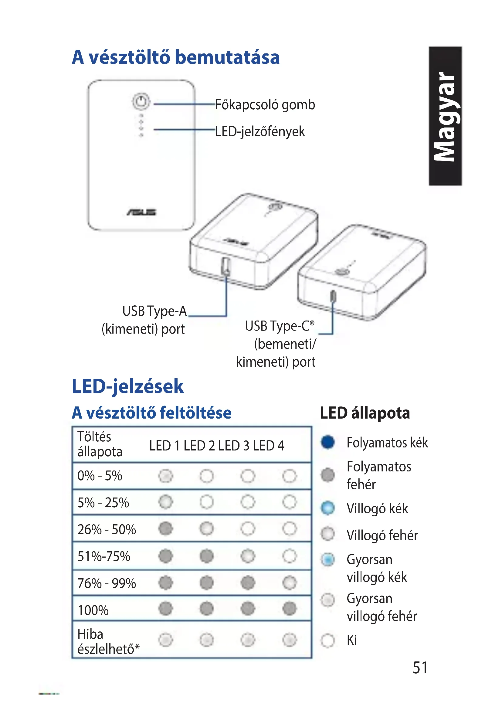 0% - 5% 5% - 25% 26% - 50% 51%-75% 76% - 99% 100% Hiba észlelhető* Folyamatos kék Folyamatos fehér Villogó kék Villogó fehér Gyorsan villogó kék Gyorsan villogó fehér Ki52 Magyar Eszközök feltöltése a vésztöltővel Lemerülés állapota