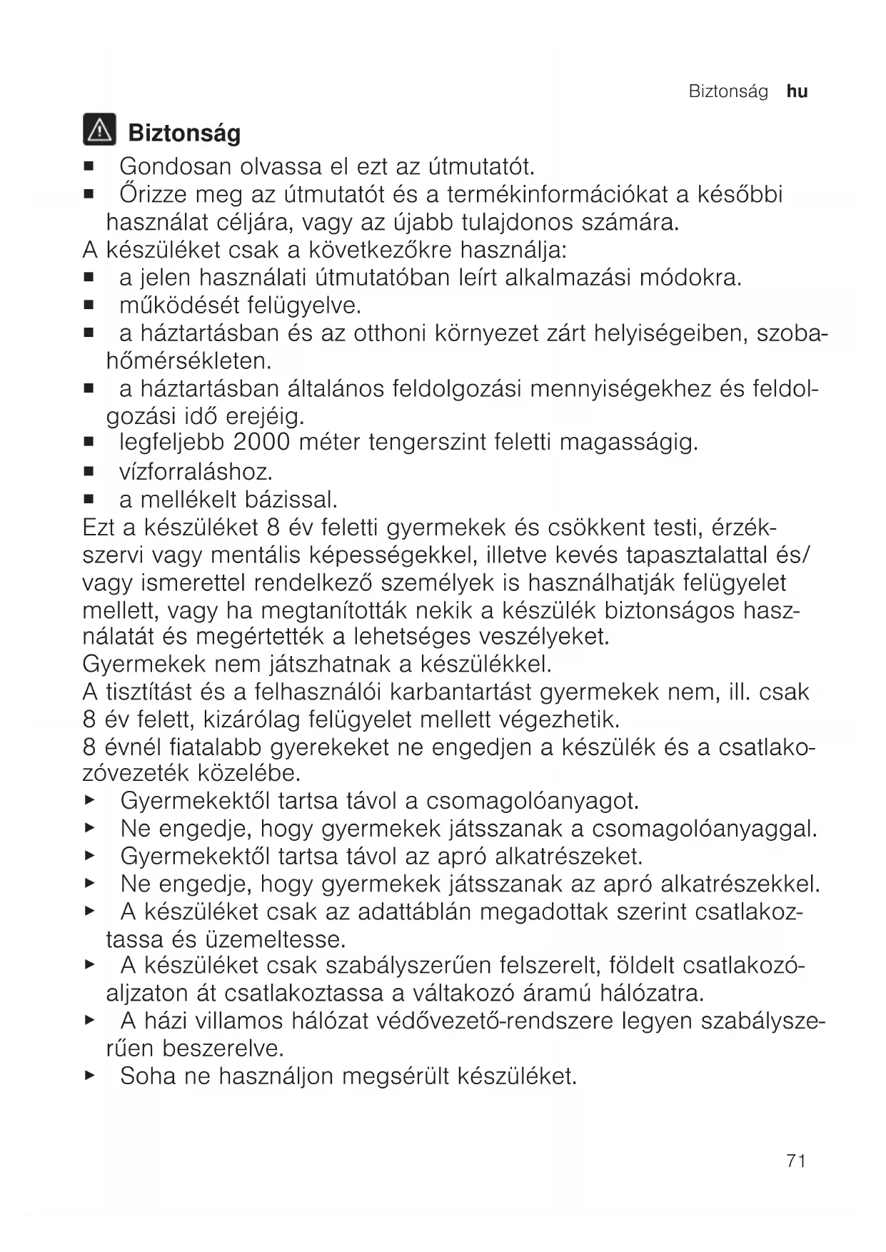 Biztonság ¡ Gondosan olvassa el ezt az útmutatót. ¡ Őrizze meg az útmutatót és a termékinformációkat a későbbi használat céljára, vagy az újabb tulajdonos számára. A készüléket csak a következőkre használja: ¡ a jelen használati útmutatóban leírt alkalmazási módokra. ¡ működését felügyelve. ¡ a háztartásban és az otthoni környezet zárt helyiségeiben, szoba- hőmérsékleten. ¡ a háztartásban általános feldolgozási mennyiségekhez és feldol- gozási idő erejéig. ¡ legfeljebb 2000 méter tengerszint feletti magasságig. ¡ vízforraláshoz. ¡ a mellékelt bázissal. Ezt a készüléket 8év feletti gyermekek és csökkent testi, érzék- szervi vagy mentális képességekkel, illetve kevés tapasztalattal és/ vagy ismerettel rendelkező személyek is használhatják felügyelet mellett, vagy ha megtanították nekik a készülék biztonságos hasz- nálatát és megértették a lehetséges veszélyeket. Gyermekek nem játszhatnak a készülékkel. A tisztítást és a felhasználói karbantartást gyermekek nem, ill. csak 8év felett, kizárólag felügyelet mellett végezhetik. 8 évnél fiatalabb gyerekeket ne engedjen a készülék és a csatlako- zóvezeték közelébe. ▶ Gyermekektől tartsa távol a csomagolóanyagot. ▶ Ne engedje, hogy gyermekek játsszanak a csomagolóanyaggal. ▶ Gyermekektől tartsa távol az apró alkatrészeket. ▶ Ne engedje, hogy gyermekek játsszanak az apró alkatrészekkel. ▶ A készüléket csak az adattáblán megadottak szerint csatlakoz- tassa és üzemeltesse. ▶ A készüléket csak szabályszerűen felszerelt, földelt csatlakozó- aljzaton át csatlakoztassa a váltakozó áramú hálózatra. ▶ A házi villamos hálózat védővezető-rendszere legyen szabálysze- rűen beszerelve. ▶ Soha ne használjon megsérült készüléket.hu Dologi károk elkerülése