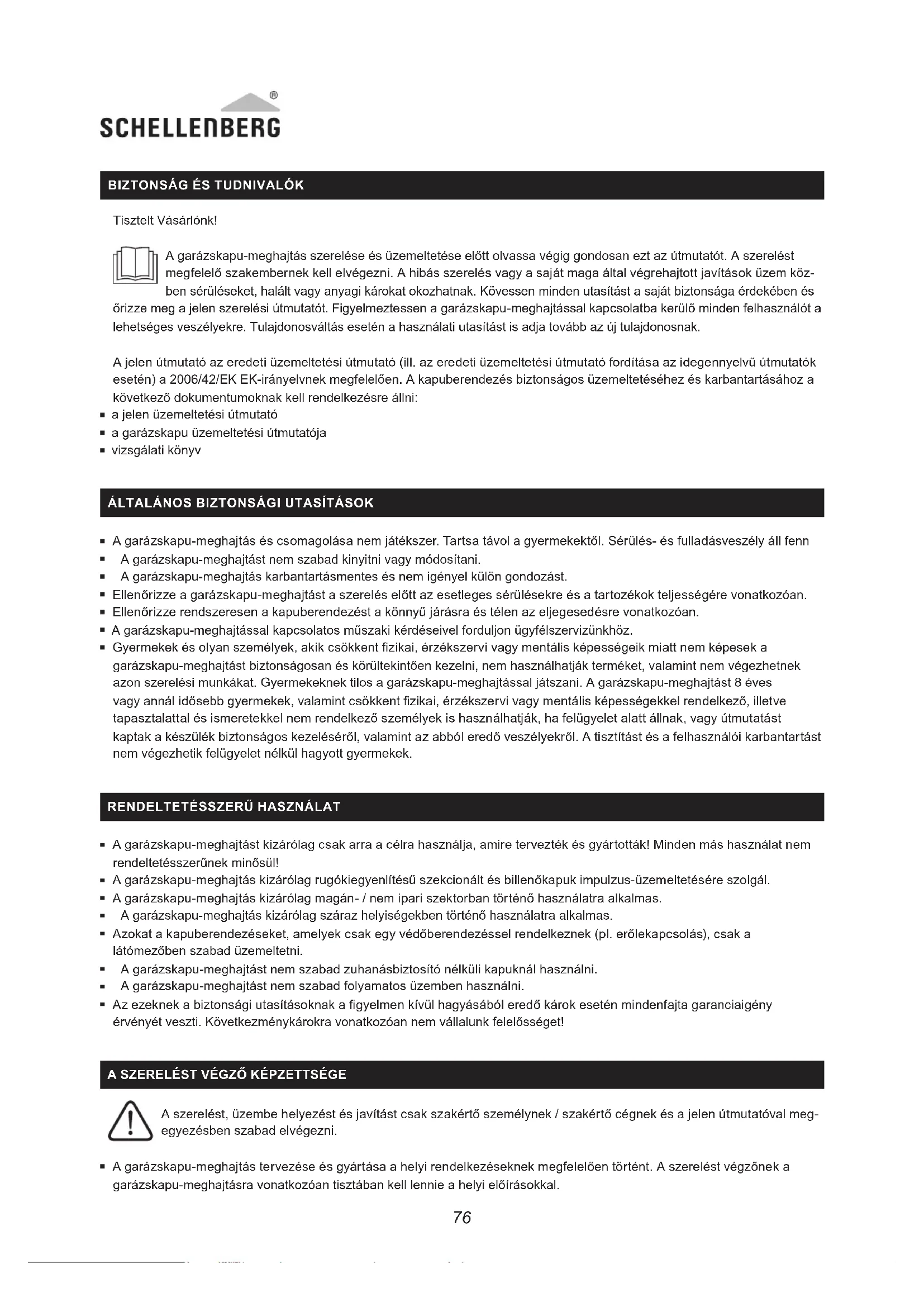 A garázskapu-meghajtást nem nehézjárású kapukhoz méretezték Ellenőrizze, hogy a kapu kézzel könnyen nyitható és zárható. Ellenőrizze, hogy a kiegyenlítőrugók megfelelően vannak beállítva, oly módon, hogy a kaput kb. egy méterre felemeli és utána elereszti A kapunak ebben az állásban sem lefelé, sem felfelé nem szabad elmozdulnia A garázskapu kiegyenlítőrugóinak utánállítását csak szakértő személy végezheti. A garázsfödémnek alkalmasnak kell lenni a garázskapu-meghajtás felszerelésére. Ellenőrizni kell, hogy szükség van-e kiegészítő rögzítő alkatrészek felszerelésére. BIZTONSÁGI UTASÍTÁSOK A SZERELÉSHEZ A szerelési munkák során ügyelni kell a munkabiztonságra vonatkozó minden érvényes előírás, valamint az elektromos készülékek üzemeltetésére vonatkozó minden előírás betartására. Erre vonatkozóan a szükséges nemzeti irányelveket kötelezően be kell tartani. Kövesse a jelen szerelési útmutató utasításait és tudnivalóit. Amennyiben a szerelésnél bizonytalan, vegye fel a kapcsolatot ügyfélszervizünkkel (l. hátoldalt). A lehetséges veszélyeztetéseket a DIN EN 13241-1 értelmében a jelen útmutató szerinti szereléssel elkerüli A villamos csatlakoztatásokat csak villamos szakember végezheti el A garázskapunak kiegyensúlyozottnak kell lenni. A mozdíthatatlan vagy nehezen járó kapukat meg kell javítani. Nem kiegyensúlyozott állapotban a garázskapuk, kapurugók, kábelek, lemezek, tartók és sínek rendkívül nagy feszültség alatt állnak, ami súlyos sérüléseket okozhat Ne próbálja meg a kapu kioldását, eltolását vagy egyengetését. Keressen fel szakembert. Az olyan garázsokhoz, amelyek nem rendelkeznek további bejárattal, egy vész-reteszkioldás a forgógombhoz (cikksz.: 60553) vagy egy vész-reteszkioldó zár (cikksz.: 60511) szükséges. Ezek a berendezések meghibásodás vagy feszültségkiesés esetén megakadályozzák a garázsból történő esetleges kizárást. A garázskapu-meghajtás beépítése előtt távolítsa el a meglévő reteszeléseket és zárakat a garázskapu szerelési útmutatója szerint, úgy hogy azok a garázskapu-meghajtás használatát ne akadályozzák Szereljen fel minden opcionális kezelőelemet (pl. kulcsos kapcsoló (cikksz.: 25101, 25102) vagy fali gomb (cikksz.: 60060)) legalább 1,5 m-es magasságban és a garázskapu látótávolságában, de távol minden mozgó alkatrésztől és gyermekek által el nem érhető helyen. Helyezze el a beszorulás elleni gyelmeztető utasításokat jól látható helyen vagy a kapcsoló közelében. Helyezze el a kézi reteszkioldás matricáját a garázskapu-meghajtás közelében. Biztosítsa a garázskapu-meghajtás üzembe helyezése előtt, hogy a kapu mozgásútjában ne legyenek akadályok. Olvassa el gondosan az utasításokat. A szerelésnél ügyeljen a rajzok szerinti minimális távolságokra Fúrt por, szennyeződések vagy forgácsok nem kerülhetnek a garázskapu-meghajtásfejbe vagy sínrendszerbe. Fedje le a szerelés során gondosan ezeket az alkatrészeket BIZTONSÁGI UTASÍTÁSOK AZ ÜZEMBE HELYEZÉSHEZ Ellenőrizze az áramcsatlakozását. Az értékeknek meg kell egyezniük a jelen kezelési útmutatóban szereplő értékekkel Ezek az adatok a garázskapu-meghajtás adattábláján találhatók A garázsban lévő áramcsatlakozásnak meg kell felelni a helyi előírásoknak.78 79 Ellenőrizze a garázskapu-meghajtás biztonsági funkcióit a következők szerint: Helyezzen egy kb. 50 mm magas tárgyat (pl. egy darab fa) a garázskapu fő zárószegélye alá. Eressze le a kaput. A kapunak az akadályon történő felütközésekor a garázskapu-meghajtásnak meg kell fordulni és szabadon kell hagyni a tárgyat Használjon az Ön nagyobb biztonsága érdekében opcionális fénysorompót (cikksz.: 60030) és ellenőrizze rendszeresen az automatikus biztonsági visszafutást A betanuló menet után a biztonsági berendezéseket (akadályfelismerés erőlekapcsolással, fénysorompó) ellenőrizni kell. A végtermék, ill. a kombináció üzembe helyezése az Alfred Schellenberg GmbH részéről mindaddig tilos, amíg a vég- termék, ill. a garázskapu-meghajtás és a garázskapu kombinációjának megfelelősége az idevonatkozó szabványok, specikációk, ill. irányelvek alapján megállapításra nem kerül. Kétség esetén szerelési szakcég bevonása szükséges. (lásd a mellékelt megfelelőségi nyilatkozatot). BIZTONSÁGI UTASÍTÁSOK AZ ÜZEMELTETÉSHEZ A nem kifogástalanul működő biztonsági akadályrendszer anyagi károkat, sérüléseket vagy akár halált is okozhat. Biztosítsa, hogy a garázskapu teljesen nyitva legyen és nyugalmi állapotban legyen, mielőtt gyalog, ill. járművel bemegy/kijön a garázsba/garázsból. Biztosítsa, hogy a garázskapu a garázs elhagyása után teljesen zárva legyen. Ügyeljen a vész-reteszkioldás használatakor arra, hogy a nyitott garázskapu a gyenge vagy törött rugók miatt hirtelen lezuhanhat Gyermekeknek tilos a garázskapu-meghajtással, ill. a távvezérlőkkel játszani. Tartsa távol a távvezérlőket a gyermekektől. Figyelje meg a mozgó kaput. Senki sem tartózkodhat a garázskapu veszélyzónájában, amíg a kapu teljesen nyitva vagy zárva nincs A garázskapu-meghajtásokat csak a látómezőben üzemeltesse, amennyiben azok csak egy védőberendezéssel rendelkeznek Soha ne maradjon állva a nyitott kapu alatt Soha ne fogja meg a vezetősíneket a kapu mozgása során. Soha ne csatlakoztasson a garázskapu-meghajtás csatlakozókapcsaira hálózati feszültséget (230 V / 50 Hz). Fennáll a lehetősége, hogy a távvezérlő és ezáltal a kapu véletlenül működésbe lép, ha az adót a nadrágzseb- ben vagy a kézitáskában tartják BIZTONSÁGI UTASÍTÁSOK A KARBANTARTÁSHOZ, JAVÍTÁSHOZ ÉS TISZTÍTÁSHOZ A tisztítás, karbantartás és az alkatrészek cseréje s