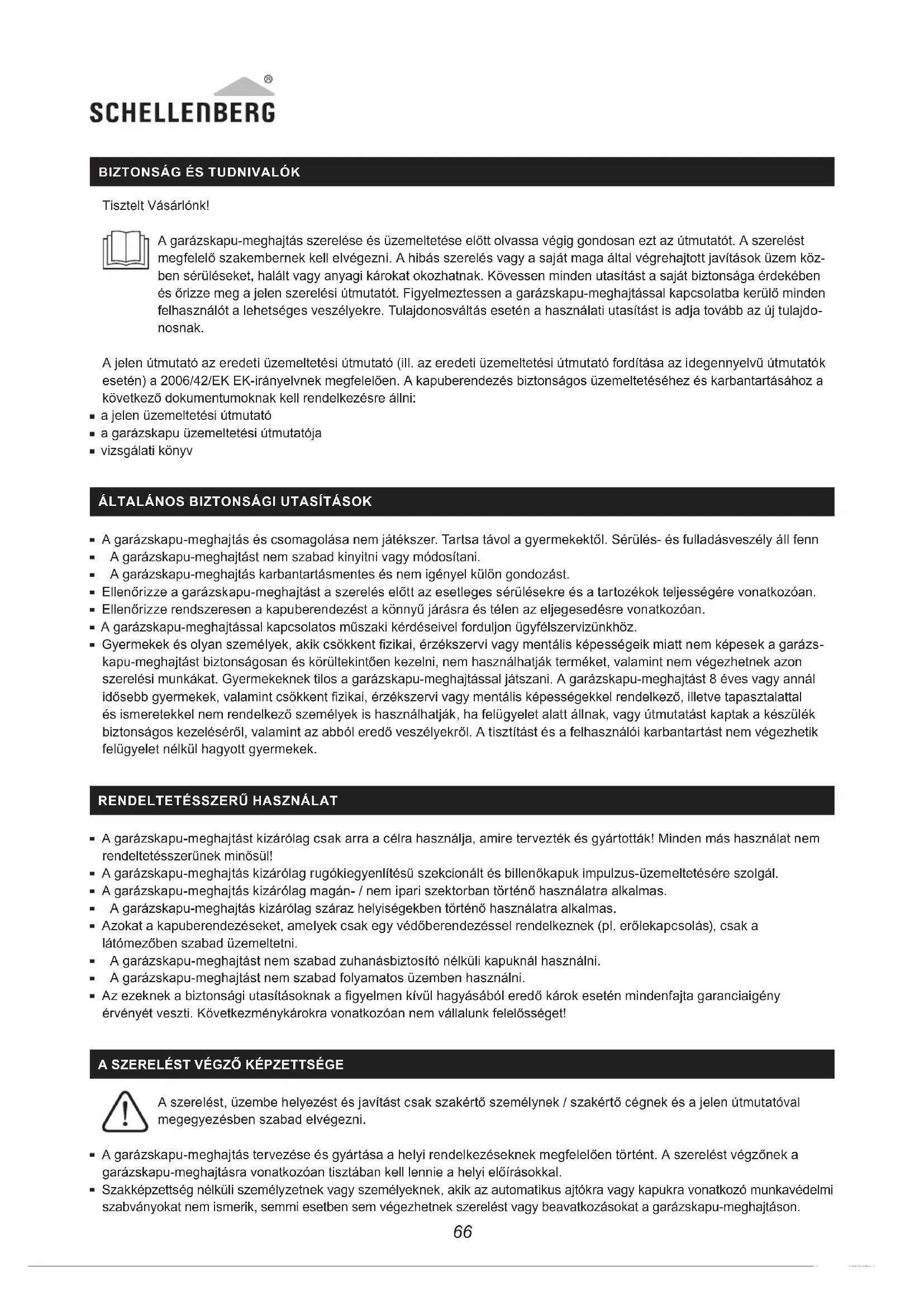 A garázskapu-meghajtást kizárólag csak arra a célra használja, amire tervezték és gyártották! Minden más használat nem rendeltetésszerűnek minősül! A garázskapu-meghajtás kizárólag rugókiegyenlítésű szekcionált és billenőkapuk impulzus-üzemeltetésére szolgál. A garázskapu-meghajtás kizárólag magán- / nem ipari szektorban történő használatra alkalmas. A garázskapu-meghajtás kizárólag száraz helyiségekben történő használatra alkalmas. Azokat a kapuberendezéseket, amelyek csak egy védőberendezéssel rendelkeznek (pl. erőlekapcsolás), csak a látómezőben szabad üzemeltetni. A garázskapu-meghajtást nem szabad zuhanásbiztosító nélküli kapuknál használni. A garázskapu-meghajtást nem szabad folyamatos üzemben használni Az ezeknek a biztonsági utasításoknak a gyelmen kívül hagyásából eredő károk esetén mindenfajta garanciaigény érvényét veszti. Következménykárokra vonatkozóan nem vállalunk felelősséget! A SZERELÉST VÉGZŐ KÉPZETTSÉGE A szerelést, üzembe helyezést és javítást csak szakértő személynek / szakértő cégnek és a jelen útmutatóval megegyezésben szabad elvégezni A garázskapu-meghajtás tervezése és gyártása a helyi rendelkezéseknek megfelelően történt. A szerelést végzőnek a garázskapu-meghajtásra vonatkozóan tisztában kell lennie a helyi előírásokkal. Szakképzettség nélküli személyzetnek vagy személyeknek, akik az automatikus ajtókra vagy kapukra vonatkozó munkavédelmi szabványokat nem ismerik, semmi esetben sem végezhetnek szerelést vagy beavatkozásokat a garázskapu-meghajtáson67