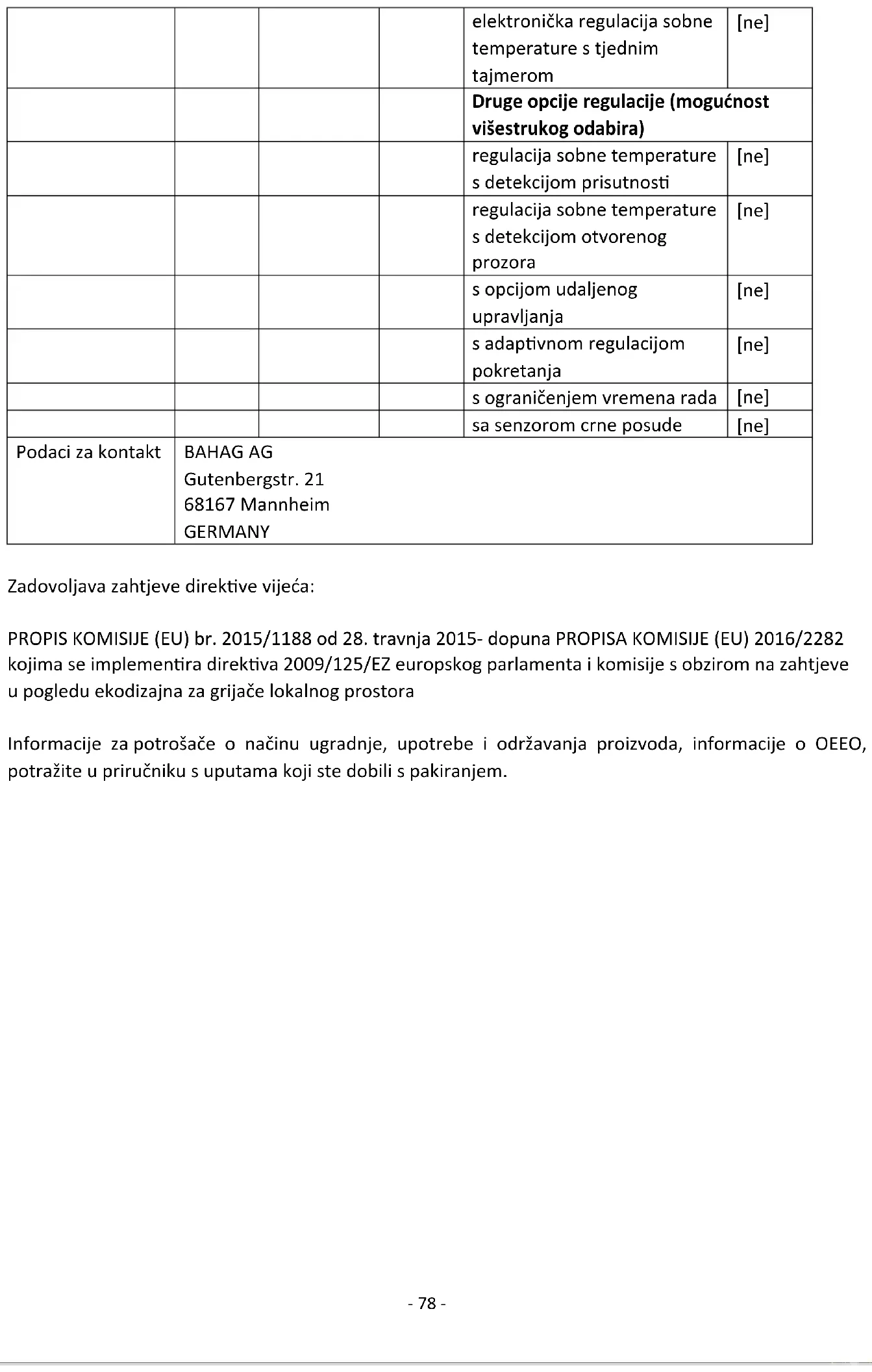 Működési feszültség: 220-240V ~ 50/60Hz Energiafogyasztás: 2200-2400W Ú jrahasznosítás – 2012/19/EU európai parlamenti és tanácsi irányelv Ez a jelzés azt jelenti, hogy az EU területén belül ezt a terméket nem szabad a többi háztartási hulladékkal együtt kidobni. A szabálytalan hulladékkezelésnek a környezetre és az emberek egészségére esetlegesen gyakorolt káros hatások megelőzése, valamint az anyagi erőforrások fenntartható újrafelhasználása érdekében az előírt módon hasznosítsa újra a terméket. A használt készülék visszajuttatására használja a gyűjtő- és visszavételi hálózatot, vagy vegye fel a kapcsolatot a kiskereskedővel, akitől a terméket vásárolta. Gondoskodnak a termék biztonságos újrahasznosításáról.- 84 - ERP információ (HU) Értékesítő: BAHAG AG Gutenbergstr. 21 68167 Mannheim GERMANY Kijelentjük, hogy a lent részletezett termék: Szükséges információk az elektromos helyi fűtőtestekről Modellszám(ok): 21768363, 21768451 Cikkszám Szimb ólum Érték Egység Cikkszám Egység Hőkimenet