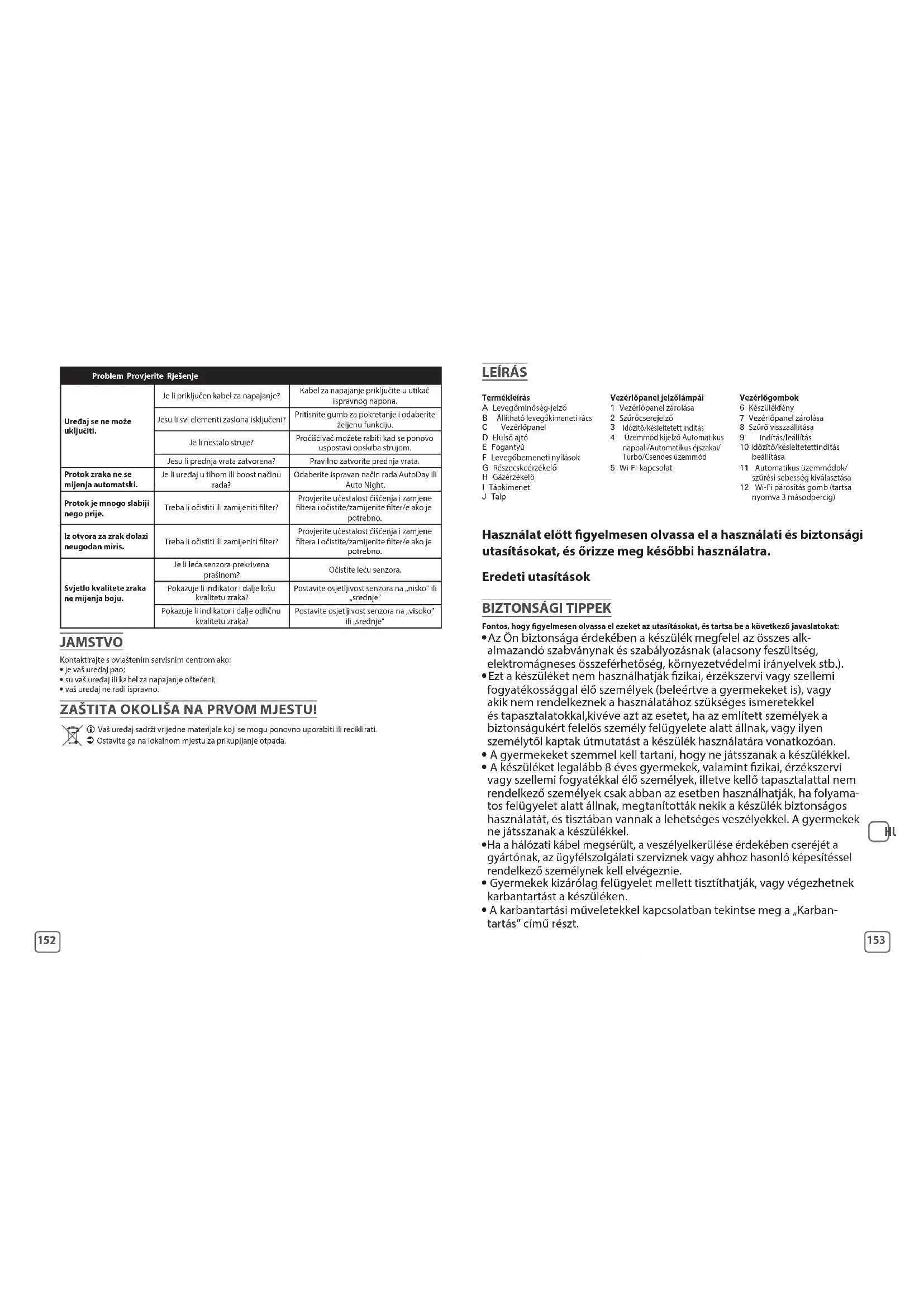 Üzemmód kijelző Automatikus nappali/Automatikus éjszakai/ Turbó/Csendes üzemmód 5 Wi-Fi-kapcsolat Vezérlőgombok 6 Készülékfény 7 Vezérlőpanel zárolása 8 Szűrő visszaállítása 9 Indítás/leállítás 10 Időzítő/késleltetett indítás beállítása 11 Automatikus üzemmódok/ szűrési sebesség kiválasztása 12 Wi-Fi párosítás gomb (tartsa nyomva 3 másodpercig) Használat előtt gyelmesen olvassa el a használati és biztonsági utasításokat, és őrizze meg későbbi használatra. Eredeti utasítások