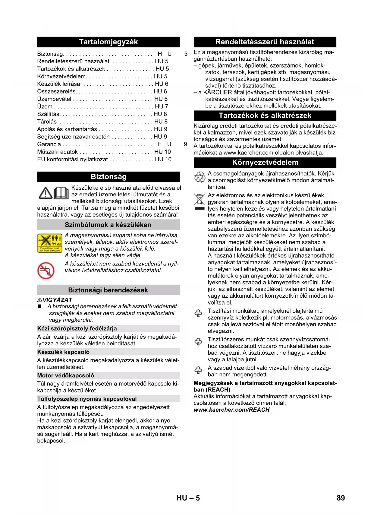 95 dB(A) Причина исключения в соответствии с Регламен- том (ЕС) 2019/1781, приложение I, раздел 2 (12): j) Сохраняется право на внесение технических изменений. Заявление о соответствии ЕU Продукт высоконапорный моющий прибор Тип: K 6 Special Основные директивы ЕU 2006/42/EC (+2009/127/EC) 2014/30/EC 2011/65/ЕC 2000/14/ЕС 2009/125/ЕС примененные предписания (EC) 2019/1781 Примененные гармонизированные нормы EN 60335–1 EN 60335–2–79 EN 62233: 2008 EN 55014–1: 2017 + A11: 2020 EN 55014–2: 2015 EN 61000–3–2: 2014 EN 61000–3–11: 2000 EN IEC 63000: 2018 Примененный порядок оценки соответствия 2000/14/ЕС: Приложение V Уровень мощности звука дБ(A) Измерено: 92 Гарантировано: 95 Winnenden, 2021/06/01 Chairman of the Board of Management Director Regulatory Affairs & Certification 88 RU– 5 Készüléke első használata előtt olvassa el az eredeti üzemeltetési útmutatót és a mellékelt biztonsági utasításokat. Ezek alapján járjon el. Tartsa meg a mindkét füzetet későbbi használatra, vagy az esetleges új tulajdonos számára! 몇 VIGYÁZAT A biztonsági berendezések a felhasználó védelmét szolgálják és ezeket nem szabad megváltoztatni vagy megkerülni. A zár lezárja a kézi szórópisztoly karját és megakadá- lyozza a készülék véletlen beindítását. A készülékkapcsoló megakadályozza a készülék vélet- len üzemeltetését. Túl nagy áramfelvétel esetén a motorvédő kapcsoló ki- kapcsolja a készüléket. A túlfolyószelep megakadályozza az engedélyezett munkanyomás túllépését. Ha a kézi szórópisztoly karját elengedi, akkor a nyo- máskapcsoló a szivattyút lekapcsolja, a magasnyomá- sú sugár leáll. Ha a kart meghúzza, a szivattyú ismét bekapcsol. Ez a magasnyomású tisztítóberendezés kizárólag ma- gánháztartásban használható: – gépek, járművek, épületek, szerszámok, homlok- zatok, teraszok, kerti gépek stb. magasnyomású vízsugárral (szükség esetén tisztítószer hozzáadá- sával) történő tisztításához. – a KÄRCHER által jóváhagyott tartozékokkal, pótal- katrészekkel és tisztítószerekkel. Vegye figyelem- be a tisztítószerekhez mellékelt utasításokat. Kizárólag eredeti tartozékokat és eredeti pótalkatrésze- ket alkalmazzon, mivel ezek szavatolják a készülék biz- tonságos és zavarmentes üzemét. A tartozékokkal és pótalkatrészekkel kapcsolatos infor- mációkat a www.kaercher.com oldalon olvashatja. Megjegyzések a tartalmazott anyagokkal kapcsolat- ban (REACH) Aktuális információkat a tartalmazott anyagokkal kap- csolatosan a következő címen talál: www.kaercher.com/REACH Tartalomjegyzék Biztonság. . . . . . . . . . . . . . . . . . . . . . . . . . . .HU 5 Rendeltetésszerű használat . . . . . . . . . . . . . HU 5 Tartozékok és alkatrészek . . . . . . . . . . . . . . . HU 5 Környezetvédelem. . . . . . . . . . . . . . . . . . . . . HU 5 Készülék leírása . . . . . . . . . . . . . . . . . . . . . . HU 6 Összeszerelés. . . . . . . . . . . . . . . . . . . . . . . . HU 6 Üzembevétel . . . . . . . . . . . . . . . . . . . . . . . . . HU 6 Üzem . . . . . . . . . . . . . . . . . . . . . . . . . . . . . . . HU 7 Szállítás. . . . . . . . . . . . . . . . . . . . . . . . . . . . . HU 8 Tárolás . . . . . . . . . . . . . . . . . . . . . . . . . . . . . HU 8 Ápolás és karbantartás . . . . . . . . . . . . . . . . . HU 9 Segítség üzemzavar esetén . . . . . . . . . . . . . HU 9 Garancia . . . . . . . . . . . . . . . . . . . . . . . . . . . .HU 9 Műszaki adatok . . . . . . . . . . . . . . . . . . . . . . . HU 10 EU konformitási nyilatkozat . . . . . . . . . . . . . . HU 10 Biztonság Szimbólumok a készüléken A magasnyomású sugarat soha ne irányítsa személyek, állatok, aktív elektromos szerel- vények vagy maga a készülék felé. A készüléket fagy ellen védje. A készüléket nem szabad közvetlenül a nyil- vános ivóvízellátáshoz csatlakoztatni. Biztonsági berendezések Kézi szórópisztoly fedélzárja Készülék kapcsoló Motor védőkapcsoló Túlfolyószelep nyomás kapcsolóval Rendeltetésszerű használat Tartozékok és alkatrészek Környezetvédelem A csomagolóanyagok újrahasznosíthatók. Kérjük a csomagolást környezetkímélő módon ártalmat- lanítsa. Az elektromos és az elektronikus készülékek gyakran tartalmaznak olyan alkotóelemeket, ame- lyek helytelen kezelés vagy helytelen ártalmatlaní- tás esetén potenciális veszélyt jelenthetnek az emberi egészségre és a környezetre. A készülék szabályszerű üzemeltetéséhez azonban szükség van ezekre az alkotóelemekre. Az ilyen szimbó- lummal megjelölt készülékeket nem szabad a háztartási hulladékkal együtt ártalmatlanítani. A használt készülékek értékes újrahasznosítható anyagokat tartalmaznak, amelyeket újrahasznosí- tó helyen kell elhelyezni. Az elemek és az akku- mulátorok olyan anyagokat tartalmaznak, ame- lyeknek nem szabad a környezetbe kerülni. Kér- jük, az elhasznált készüléket, valamint az elemet vagy az akkumulátort környezetkímélő módon tá- volítsa el. Tisztítási munkákat, amelyeknél olajtartalmú szennyvíz keletkezik pl. motormosás, alvázmosás csak olajleválasztóval ellátott mosóhelyen szabad elvégezni. Tisztítószeres munkát csak szennyvízcsatorná- hoz csatlakoztatott vízzáró munkafelületen sza- bad végezni. A tisztítószert ne hagyja vizekbe vagy a talajba jutni. A szabad vizekből való vízvétel néhány ország- ban nem megengedett. 89HU– 6 A készülék szállítási terjedelme fel van tüntetve a cso- m