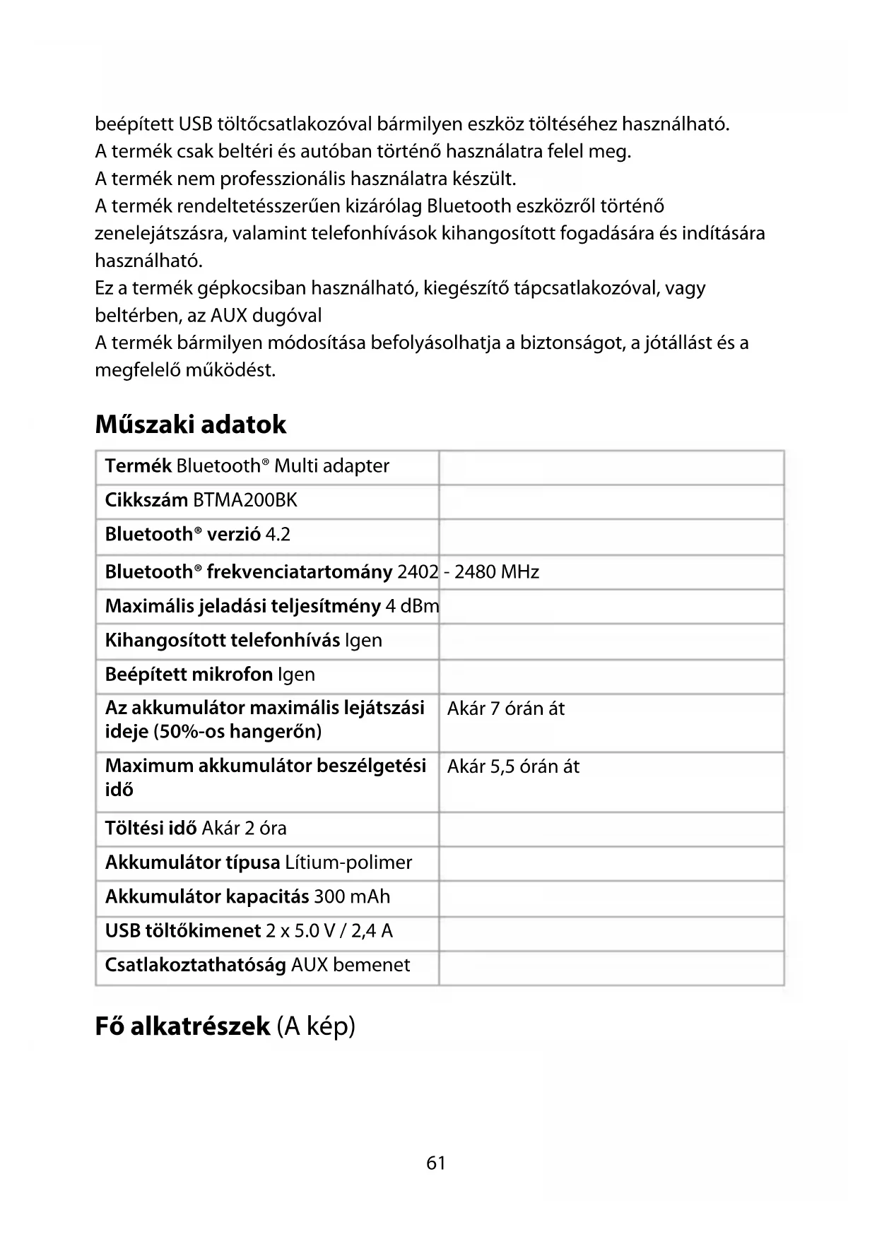 Gyors beüzemelési útmutató Bluetooth® Multi adapter BTMA200BK További információért lásd a bővített online kézikönyvet: ned.is/btma200bk Tervezett felhasználás A Nedis BTMA200BK Bluetooth rendszerrel felszerelt, kéz nélküli használatra készült. A termék beépített mikrofonnal rendelkezik kéz nélküli hívásokhoz, és61 beépített USB töltőcsatlakozóval bármilyen eszköz töltéséhez használható. A termék csak beltéri és autóban történő használatra felel meg. A termék nem professzionális használatra készült. A termék rendeltetésszerűen kizárólag Bluetooth eszközről történő zenelejátszásra, valamint telefonhívások kihangosított fogadására és indítására használható. Ez a termék gépkocsiban használható, kiegészítő tápcsatlakozóval, vagy beltérben, az AUX dugóval A termék bármilyen módosítása befolyásolhatja a biztonságot, a jótállást és a megfelelő működést. Műszaki adatok Termék Bluetooth® Multi adapter Cikkszám BTMA200BK Bluetooth® verzió 4.2 Bluetooth® frekvenciatartomány 2402 - 2480 MHz Maximális jeladási teljesítmény 4 dBm Kihangosított telefonhívás Igen Beépített mikrofon Igen Az akkumulátor maximális lejátszási ideje (50%-os hangerőn) Akár 7 órán át Maximum akkumulátor beszélgetési idő Akár 5,5 órán át Töltési idő Akár 2 óra Akkumulátor típusa Lítium-polimer Akkumulátor kapacitás 300 mAh USB töltőkimenet 2 x 5.0 V / 2,4 A Csatlakoztathatóság AUX bemenet Fő alkatrészek (A kép)62