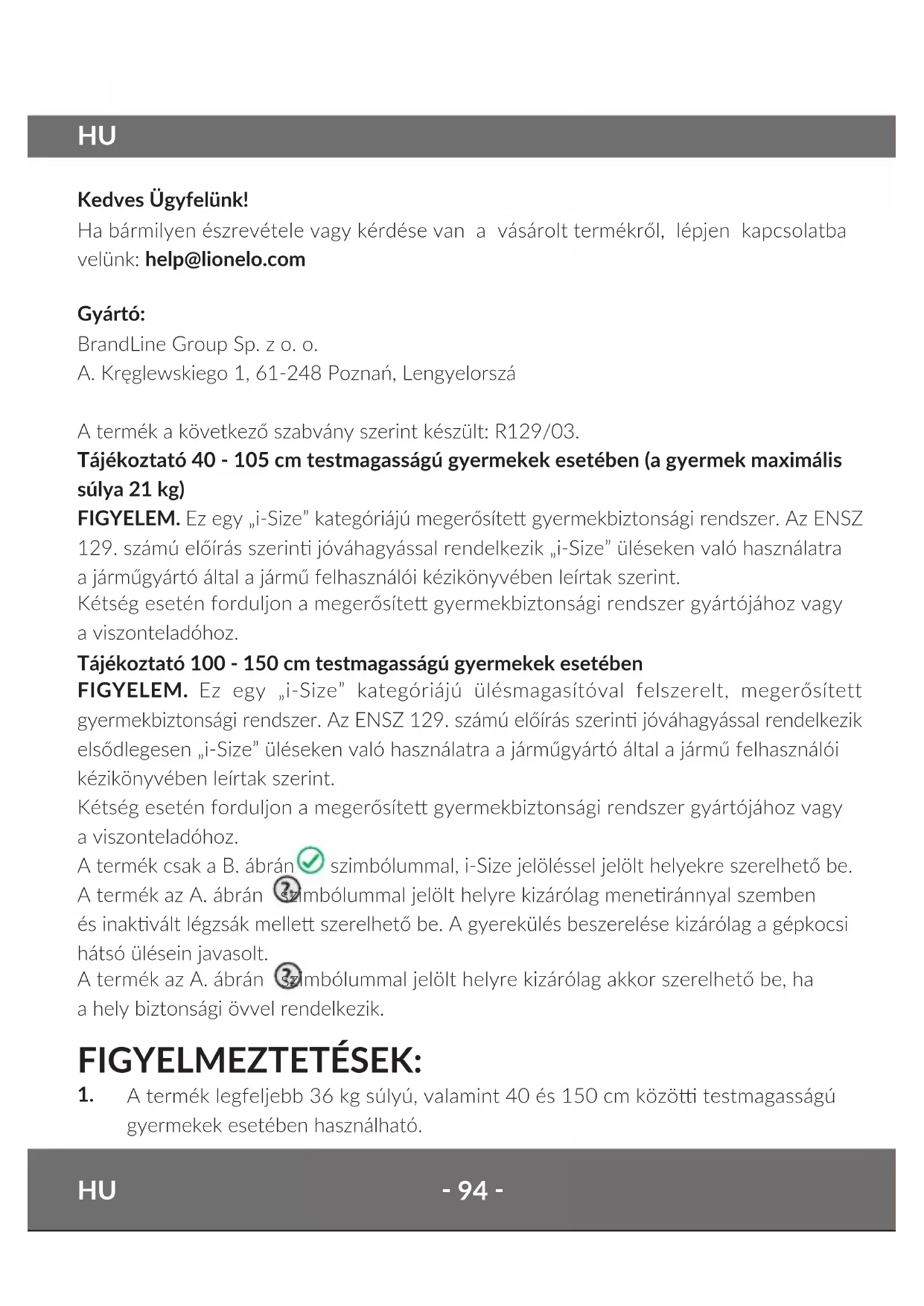 Kedves Ügyfelünk! Ha bármilyen észrevétele vagy kérdése van a vásárolt termékről, lépjen kapcsolatba velünk: help@lionelo.com Gyártó: BrandLine Group Sp. z o. o. A. Kręglewskiego 1, 61-248 Poznań, Lengyelorszá A termék a következő szabvány szerint készült: R129/03. Tájékoztató 40 - 105 cm testmagasságú gyermekek esetében (a gyermek maximális súlya 21 kg) FIGYELEM. Ez egy „i-Size” kategóriájú megerősíte gyermekbiztonsági rendszer. Az ENSZ