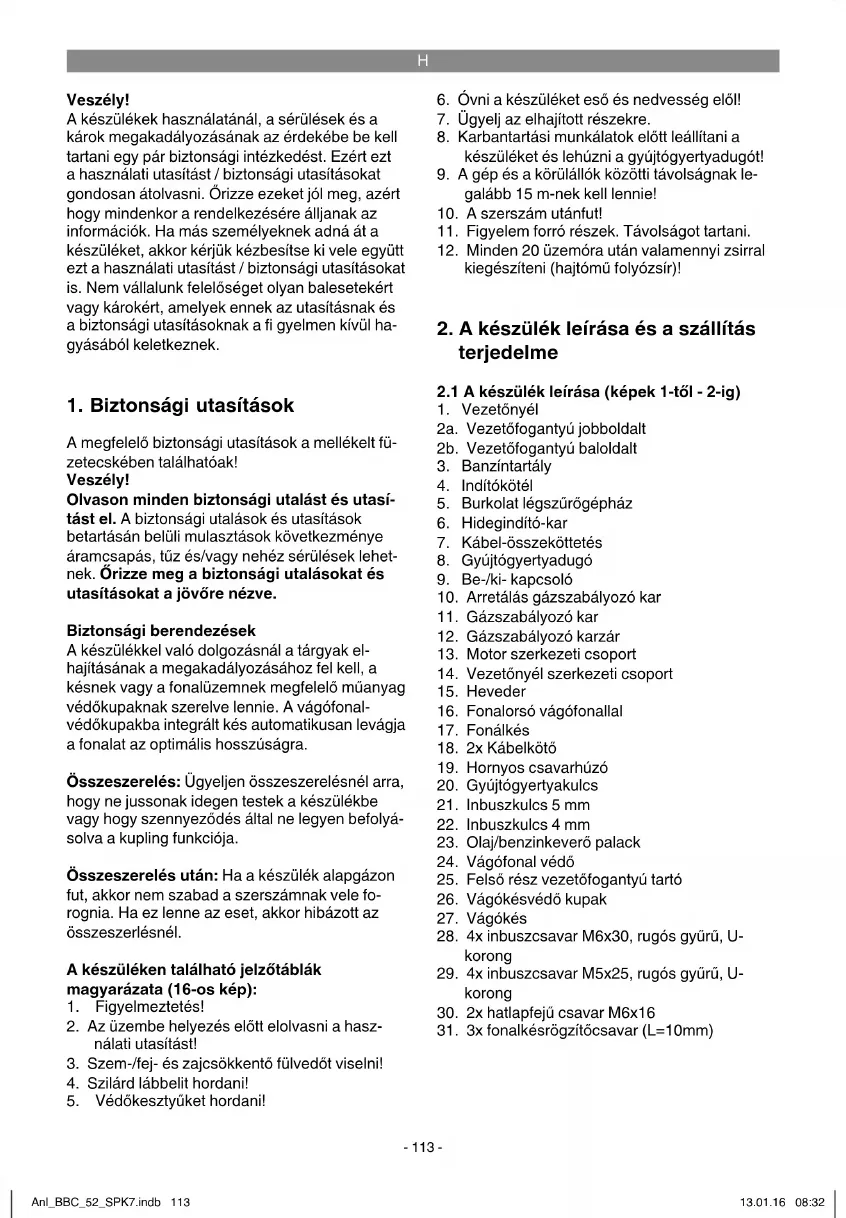 A motoros kasza (vágókés használata) könnyű cserje, erős gaz és koronaszint vágására alkal- mas. A motoros trimmer (fonalorsó használata vágófo- nallal) fű, pázsitfelületek és könnyű gaz vágására alkalmas. A készülék rendeltetés szerüi használa- tának a feltétele, a gyártó által mellékelt használa- ti utasításnak a betartása. Minden más fajta has- ználat, amelyik ebben a használati utasításban nem kifejezetten engedélyezett, károkat okozhat a készüléken és a kezelő számára egy komoly veszélyt jelenthet. Vegye okvetlenül fi gyelebe a biztonsági utasításokban foglalt fenntartásokat. Kérjük vegye fi gyelembe, hogy a készülékeink rendeltetésük szerint nem az ipari, kézműipari vagy gyári használatra lettek konstruálva. Nem vállalunk szavatosságot, ha a készülék ipari, kézműipari vagy gyári üzemek valamint egyenértékű tevékenységek területén van hasz- nálva. Veszély! A használó testi veszélyeztetése miatt a következő munkálatokra nem szabad használni a benzinmotoros kaszát: a gyalogutak tisztítására és szecskevágógépként a fa- és a sövénylevá- gottak összeaprítására. Továbbá nem szabad a benzínmotoros kaszát a talajemelkedések, mint példaul vakondtúrások elsimítására felhasználni. Biztonsági okokból nem szabad a benzínmotoros kaszát más munkaszerszámok és bármilyen fajta szerszámkészlet meghajtó aggregátumaként használni. A gépet csak a rendeltetése szerint szabad has- ználni. Ezt túlhaladó bármilyen használat, nem számít rendeltetésszerűnek. Ebből adódó bármi- lyen kárért vagy bármilyen fajta sérülésért a hasz- náló ill. a kezelő felelős és nem a gyártó. Anl_BBC_52_SPK7.indb 114Anl_BBC_52_SPK7.indb 114 13.01.16 08:3213.01.16 08:32H