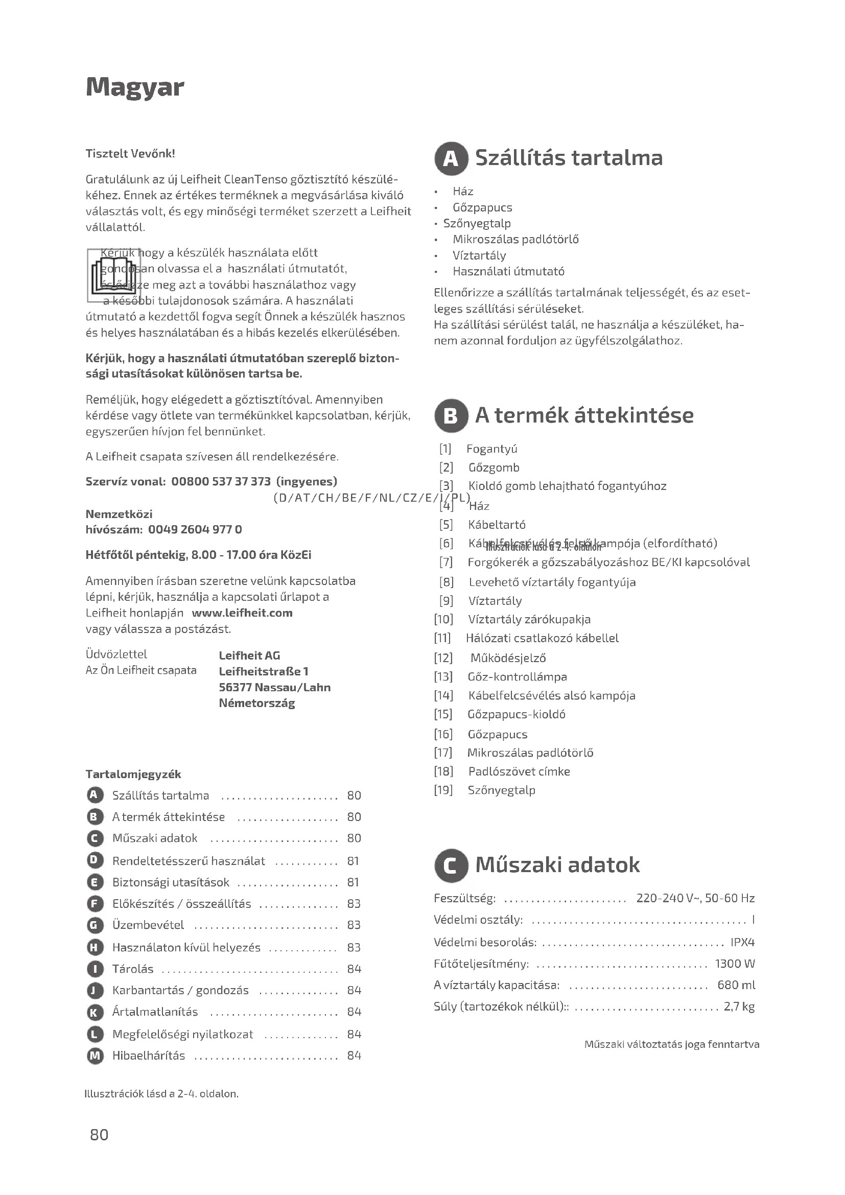 - Használatiútmutató Ellenőrizzeaszállítástartalmánakteljességét,ésazeset- legesszállításisérüléseket. Haszállításisérülésttalál,nehasználjaakészüléket,ha- nemazonnalforduljonazügyfélszolgálathoz. Tisztelt Vevőnk! GratulálunkazújLeifheitCleanTensogőztisztítókészülé- kéhez.Ennekazértékesterméknekamegvásárlásakiváló választásvolt,ésegyminőségiterméketszerzettaLeifheit vállalattól. Kérjükhogyakészülékhasználataelőtt gondosanolvassaelahasználatiútmutatót, ésőrizzemegaztatovábbihasználathozvagy akésőbbitulajdonosokszámára.Ahasználati útmutatóakezdettőlfogvasegítÖnnekakészülékhasznos éshelyeshasználatábanésahibáskezeléselkerülésében. Kérjük, hogy a használati útmutatóban szereplő bizton- sági utasításokat különösen tartsa be. Reméljük,hogyelégedettagőztisztítóval.Amennyiben kérdésevagyötletevantermékünkkelkapcsolatban,kérjük, egyszerűenhívjonfelbennünket. ALeifheitcsapataszívesenállrendelkezésére. Szervíz vonal: 00800 537 37 373 (ingyenes) (D/AT/CH/BE/F/NL/CZ/E/I/PL) Nemzetközi hívószám: 0049 2604 977 0 Hétfőtől péntekig, 8.00 - 17.00 óra KözEi Amennyibenírásbanszeretnevelünkkapcsolatba lépni,kérjük,használjaakapcsolatiűrlapota Leifheithonlapján www.leifheit.com vagyválasszaapostázást. Üdvözlettel AzÖnLeifheitcsapata [1] Fogantyú [2] Gőzgomb [3] Kioldógomblehajthatófogantyúhoz [4] Ház [5] Kábeltartó [6] Kábelfelcsévélésfelsőkampója(elfordítható) [7] ForgókerékagőzszabályozáshozBE/KIkapcsolóval [8] Levehetővíztartályfogantyúja [9] Víztartály [10] Víztartályzárókupakja [11] Hálózaticsatlakozókábellel [12] Működésjelző [13] Gőz-kontrollámpa [14] Kábelfelcsévélésalsókampója [15] Gőzpapucs-kioldó [16] Gőzpapucs [17] Mikroszálaspadlótörlő [18] Padlószövetcímke [19] Szőnyegtalp Feszültség:....................... 220-240V~,50-60Hz Védelmiosztály:........................................I Védelmibesorolás:..................................IPX4 Fűtőteljesítmény: ................................ 1300W Avíztartálykapacitása:..........................680ml Súly(tartozékoknélkül)::...........................2,7kg