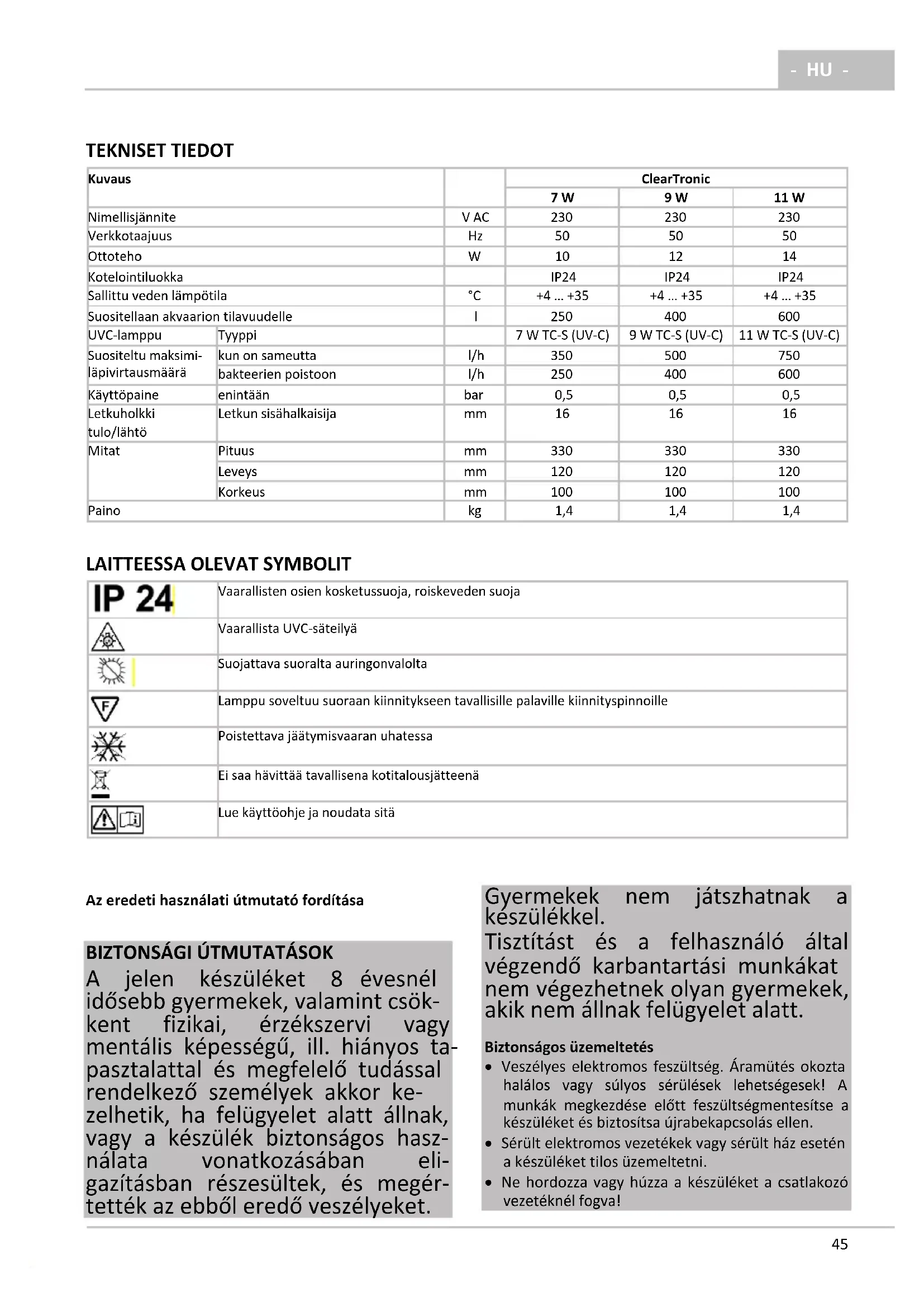 - Az UVC lámpát tilos a burkolaton kívül üzemeltetni.