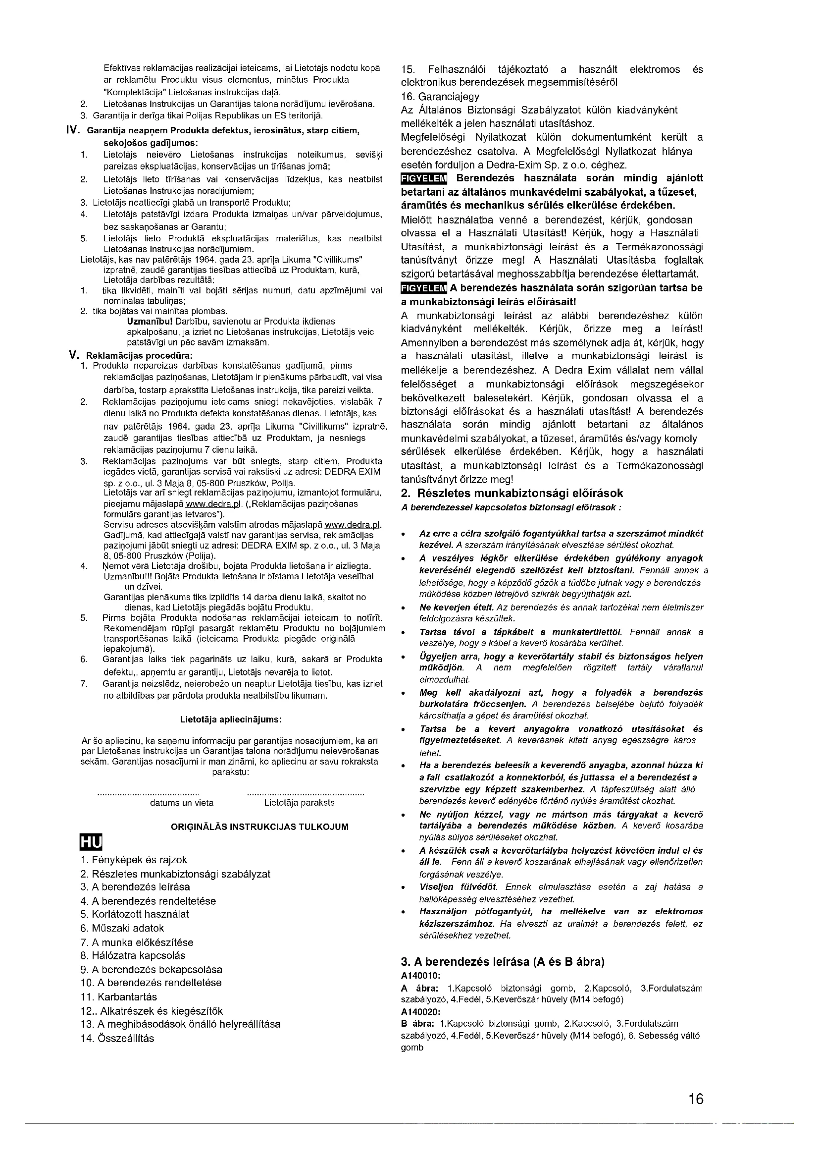 Az Általános Biztonsági Szabályzatot külön kiadványként mellékelték a jelen használati utasításhoz. Megfelelőségi Nyilatkozat külön dokumentumként került a berendezéshez csatolva. A Megfelelőségi Nyilatkozat hiánya esetén forduljon a Dedra-Exim Sp. z o.o. céghez. FIGYELEM Berendezés használata során mindig ajánlott betartani az általános munkavédelmi szabályokat, a tűzeset, áramütés és mechanikus sérülés elkerülése érdekében. Mielőtt használatba venné a berendezést, kérjük, gondosan olvassa el a Használati Utasítást! Kérjük, hogy a Használati Utasítást, a munkabiztonsági leírást és a Termékazonossági tanúsítványt őrizze meg! A Használati Utasításba foglaltak szigorú betartásával meghosszabbítja berendezése élettartamát. FIGYELEM A berendezés használata során szigorúan tartsa be a munkabiztonsági leírás előírásait! A munkabiztonsági leírást az alábbi berendezéshez külön kiadványként mellékelték. Kérjük, őrizze meg a leírást! Amennyiben a berendezést más személynek adja át, kérjük, hogy a használati utasítást, illetve a munkabiztonsági leírást is mellékelje a berendezéshez. A Dedra Exim vállalat nem vállal felelősséget a munkabiztonsági előírások megszegésekor bekövetkezett balesetekért. Kérjük, gondosan olvassa el a biztonsági előírásokat és a használati utasítást! A berendezés használata során mindig ajánlott betartani az általános munkavédelmi szabályokat, a tűzeset, áramütés és/vagy komoly sérülések elkerülése érdekében. Kérjük, hogy a használati utasítást, a munkabiztonsági leírást és a Termékazonossági tanúsítványt őrizze meg!