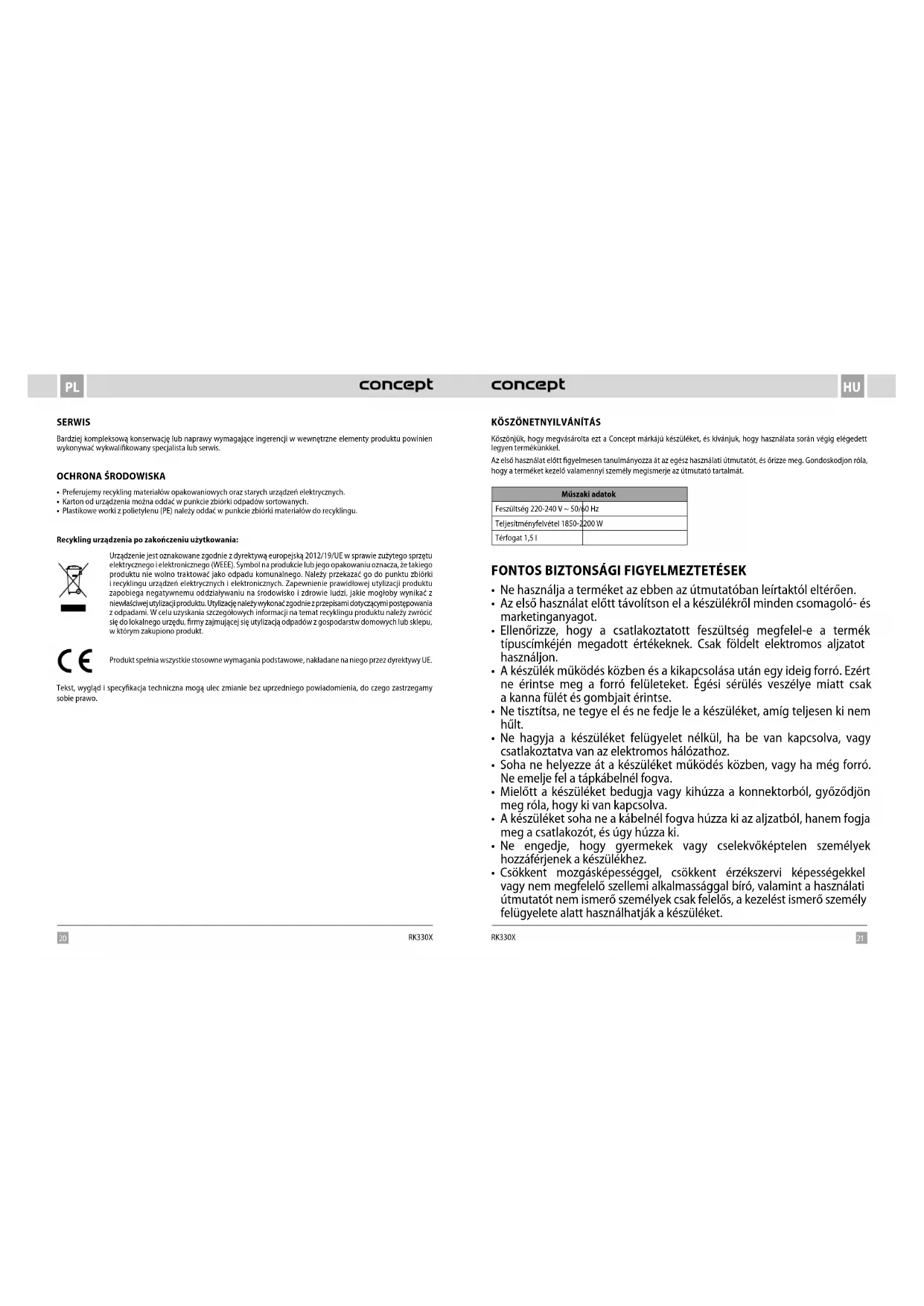 - A polietilén (PE) műanyagzacskókat adja le újrahasznosítható anyagokat gyűjtő helyen. A készülék újrahasznosítása az élettartama végén: Ez a készülék az európai Elektromos hulladékról és elektromos berendezésekről (WEEE) szóló 2012/19/ EU irányelvnek megfelelően van megjelölve. A terméken vagy a csomagolásán található szimbólum jelzi, hogy a termék nem tartozik a vegyes háztartási hulladék közé. El kell vinni olyan helyre, ahol az elektromos és elektronikus hulladékot gyűjtik újrahasznosítás céljából. A termék megfelelő módon történő megsemmisítésének biztosításával megakadályozza a környezetet és az emberi egészséget veszélyeztető negatív hatásokat, amelyeket a nem megfelelő hulladék-megsemmisítés okozhatna. A megsemmisítést ahulladékgazdálkodási előírásoknak megfelelően kell végrehajtani. A termék újrahasznosítására vonatkozó részletesebb információkért forduljon az illetékes helyi hivatalhoz, a háztartási hulladék megsemmisítésével foglalkozó szolgáltatóhoz, vagy az üzlethez, ahol a terméket vásárolta. Ez a termék megfelel az összes vonatkozó EU irányelv követelményeinek. A szövegben, a kivitelben és a műszaki jellemzőkben előzetes figyelmeztetés nélkül sor kerülhet változtatásokra, minden módosításra vonatkozó jog fenntartva. PATEICĪBA Pateicamies par šīs “Concept” ierīces iegādi. Ceram, ka būsiet apmierināti ar šo izstrādājumu visu tā izmantošanas laiku. Pirms lietošanas rūpīgi izlasiet šo lietošanas instrukciju un uzglabājiet to drošā vietā, lai nepieciešamības gadījumā varētu pārlasīt. Nodrošiniet, lai arī citi cilvēki, kuri izmantos šo ierīci, pirms tās lietošanas būtu iepazinušies ar norādījumiem. Tehniskie dati Spriegums 220–240V ~ 50/60Hz Jauda 1850–2200W Tilpums 1,5l SVARĪGI DROŠĪBAS NORĀDĪJUMI