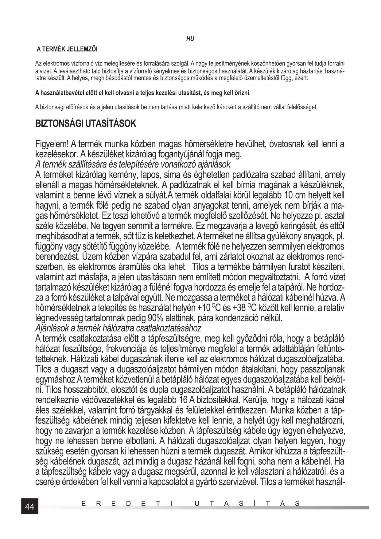 Figyelem! A termék munka közben magas hőmérsékletre hevülhet, óvatosnak kell lenni a kezelésekor. A készüléket kizárólag fogantyújánál fogja meg. A termék szállítására és telepítésére vonatkozó ajánlások A terméket kizárólag kemény, lapos, sima és éghetetlen padlózatra szabad állítani, amely ellenáll a magas hőmérsékleteknek. A padlózatnak el kell bírnia magának a készüléknek, valamint a benne lévő víznek a súlyát.A termék oldalfalai körül legalább 10 cm helyett kell hagyni, a termék fölé pedig ne szabad olyan anyagokat tenni, amelyek nem bírják a ma- gas hőmérsékletet. Ez teszi lehetővé a termék megfelelő szellőzését. Ne helyezze pl. asztal széle közelébe. Ne tegyen semmit a termékre. Ez megzavarja a levegő keringését, és ettől meghibásodhat a termék, sőt tűz is keletkezhet. A terméket ne állítsa gyúlékony anyagok, pl. függöny vagy sötétítő függöny közelébe. A termék fölé ne helyezzen semmilyen elektromos berendezést. Üzem közben vízpára szabadul fel, ami zárlatot okozhat az elektromos rend- szerben, és elektromos áramütés oka lehet. Tilos a termékbe bármilyen furatot készíteni, valamint azt másfajta, a jelen utasításban nem említett módon megváltoztatni. A forró vizet tartalmazó készüléket kizárólag a fülénél fogva hordozza és emelje fel a talpáról. Ne hordoz- za a forró készüléket a talpával együtt. Ne mozgassa a terméket a hálózati kábelnél húzva. A hőmérsékletnek a telepítés és használat helyén +10