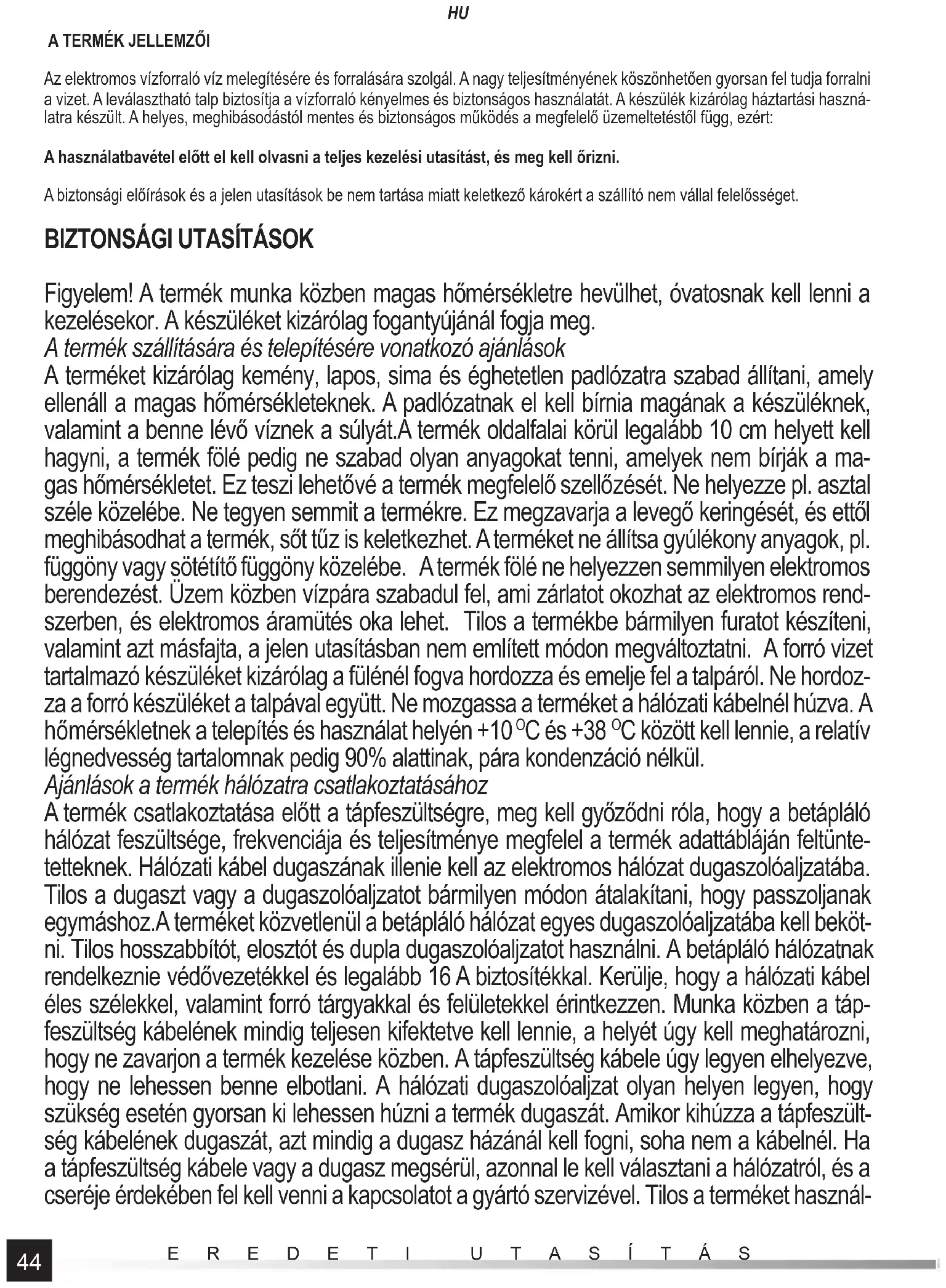 Figyelem! A termék munka közben magas hőmérsékletre hevülhet, óvatosnak kell lenni a kezelésekor. A készüléket kizárólag fogantyújánál fogja meg. A termék szállítására és telepítésére vonatkozó ajánlások A terméket kizárólag kemény, lapos, sima és éghetetlen padlózatra szabad állítani, amely ellenáll a magas hőmérsékleteknek. A padlózatnak el kell bírnia magának a készüléknek, valamint a benne lévő víznek a súlyát.A termék oldalfalai körül legalább 10 cm helyett kell hagyni, a termék fölé pedig ne szabad olyan anyagokat tenni, amelyek nem bírják a ma- gas hőmérsékletet. Ez teszi lehetővé a termék megfelelő szellőzését. Ne helyezze pl. asztal széle közelébe. Ne tegyen semmit a termékre. Ez megzavarja a levegő keringését, és ettől meghibásodhat a termék, sőt tűz is keletkezhet. A terméket ne állítsa gyúlékony anyagok, pl. függöny vagy sötétítő függöny közelébe. A termék fölé ne helyezzen semmilyen elektromos berendezést. Üzem közben vízpára szabadul fel, ami zárlatot okozhat az elektromos rend- szerben, és elektromos áramütés oka lehet. Tilos a termékbe bármilyen furatot készíteni, valamint azt másfajta, a jelen utasításban nem említett módon megváltoztatni. A forró vizet tartalmazó készüléket kizárólag a fülénél fogva hordozza és emelje fel a talpáról. Ne hordoz- za a forró készüléket a talpával együtt. Ne mozgassa a terméket a hálózati kábelnél húzva. A hőmérsékletnek a telepítés és használat helyén +10