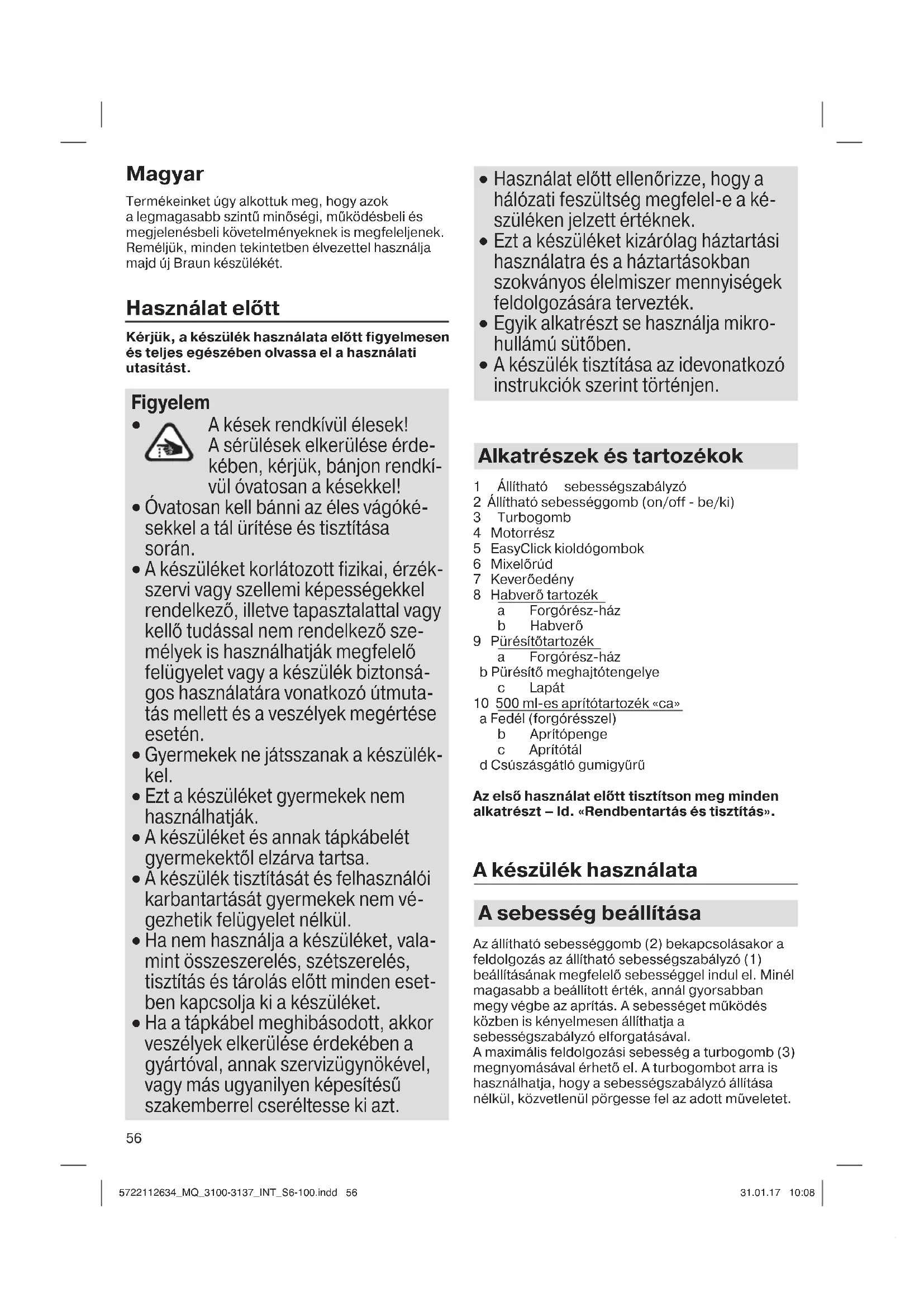 A készülék tisztítása az idevonatkozó instrukciók szerint történjen. Alkatrészek és tartozékok 1 Állítható sebességszabályzó 2 Állítható sebességgomb (on/off - be/ki) 3 Turbogomb 4 Motorrész 5 EasyClick kioldógombok 6 Mixelőrúd 7 Keverőedény 8 Habverő tartozék a Forgórész-ház b Habverő 9 Pürésítőtartozék a Forgórész-ház b Pürésítő meghajtótengelye c Lapát 10 500 ml-es aprítótartozék «ca» a Fedél (forgórésszel) b Aprítópenge c Aprítótál d Csúszásgátló gumigyűrű Az első használat előtt tisztítson meg minden alkatrészt – ld. «Rendbentartás és tisztítás». A készülék használata A sebesség beállítása Az állítható sebességgomb (2) bekapcsolásakor a feldolgozás az állítható sebességszabályzó (1) beállításának megfelelő sebességgel indul el. Minél magasabb a beállított érték, annál gyorsabban megy végbe az aprítás. A sebességet működés közben is kényelmesen állíthatja a sebességszabályzó elforgatásával. A maximális feldolgozási sebesség a turbogomb (3) megnyomásával érhető el. A turbogombot arra is használhatja, hogy a sebességszabályzó állítása nélkül, közvetlenül pörgesse fel az adott műveletet. 5722112634_MQ_3100-3137_INT_S6-100.indd 565722112634_MQ_3100-3137_INT_S6-100.indd 56 31.01.17 10:0831.01.17 10:0857 Keverőszár (A) A botmixer tökéletesen alkalmas mártások, szószok, salátaöntetek, levesek, bébiételek, valamint italok, illetve gyümölcsös és tejes turmixok készítésére. A legjobb eredmény eléréséhez használja a turbo sebességfokozatot. Összeszerelés és működtetés