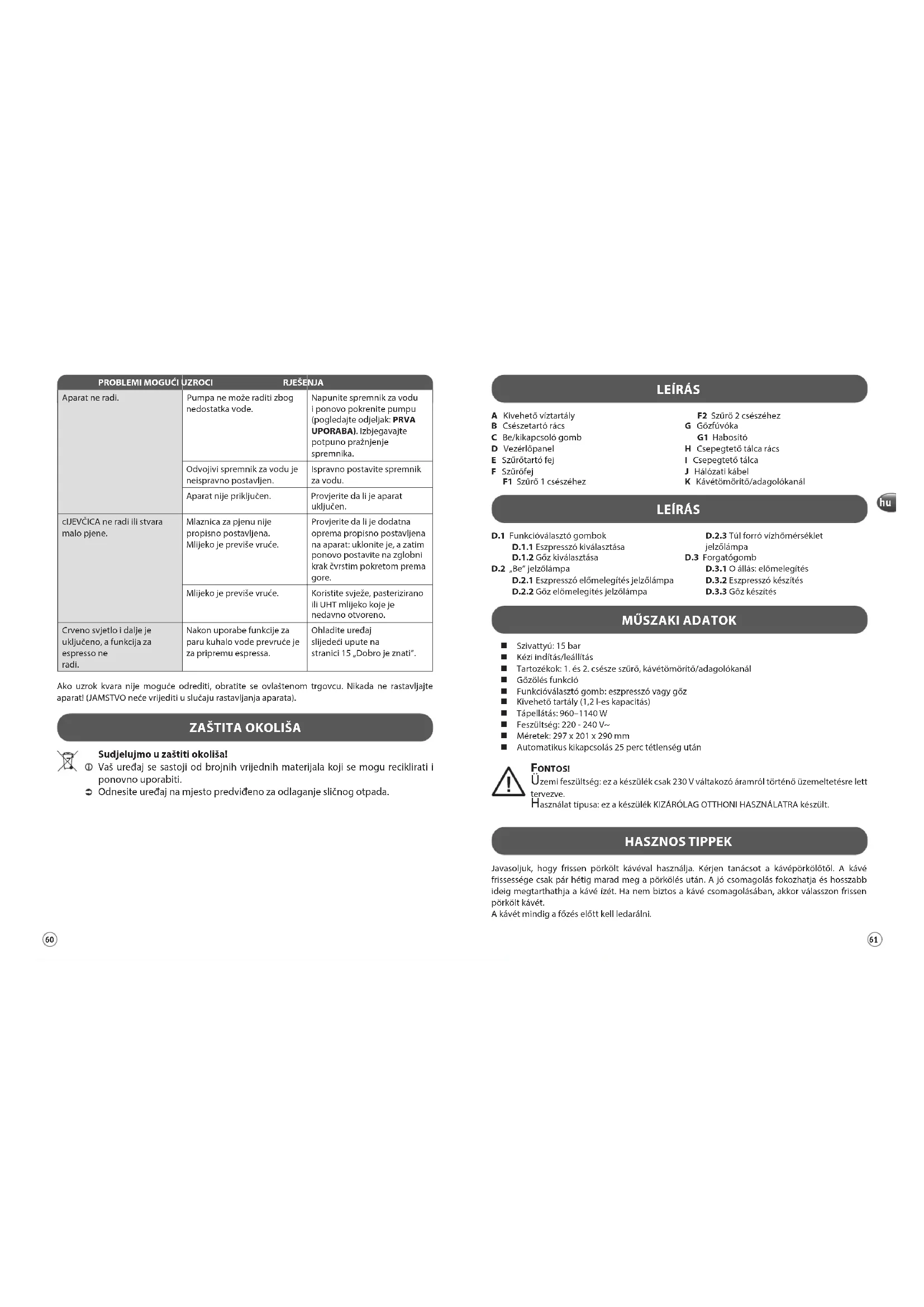 SPECIFICHE TECNICHE Pompa: 15 bar Avvio/arresto manuale Accessori: filtri da 1 e 2 tazze, cucchiaio dosatore/pressino Funzione Vapore Pulsante di selezione: espresso o vapore Serbatoio amovibile (capacità 1,2 l) Alimentazione: 960 - 1140 W Tensione: 220 - 240 V Dimensioni: 297 x 201 x 290 mm Spegnimento automatico dopo 25 minuti IMPORTANTE! Tensione di utilizzo: questo apparecchio è progettato per funzionare unicamente con corrente alternata a 230 V. Tipo di utilizzo: questo apparecchio è progettato ESCLUSIVAMENTE PER USO DOMESTICO. DESCRIZIONE A Serbatoio dell’acqua rimovibileB Vassoio portatazzeC Pulsante di accensione/spegnimentoD Pannello di controlloE Testa portafiltroF Testa del filtroF1 Filtro per 1 tazzaF2 Filtro per 2 tazzeG Ugello del vaporeG1 Ugello della schiumaH Griglia del vassoio raccogligocceI Vassoio raccogligocceJ Cavo di alimentazioneK Cucchiaio dosatore - pressino DESCRIZIONE D.1 Pulsante di selezioneD.1.1 Selezione espressoD.1.2 Selezione vaporeD.2 Spia di accensioneD.2.1 Spia Preriscaldamento espressoD.2.2 Spia Preriscaldamento vaporeD.2.3 Spia Temperatura dell’acqua troppo caldaD.3 ManopolaD.3.1 Posizione O: preriscaldamentoD.3.2 Preparazione espressoD.3.3 Preparazione vapore ÓVJA A KÖRNYEZETET! Első a környezetvédelem! Az Ön terméke értékes újrahasznosítható anyagokat tartalmaz. Kérjük készülékét ne dobja ki, hanem adja le az erre a célra kijelölt gyűjtőhelyen. PROBLÉMÁK LEHETSÉGES OKOK MEGOLDÁSOKA fúvóka nem működik, vagy kevés habot készít.A gőzfúvóka nincs megfelelően felhelyezve.Ellenőrizze, hogy a tartozékok megfelelően vannak-e felszerelve a készülékre: vegye le, majd helyezze vissza a felfüggesztett karra, ehhez erősen mozdítsa felfelé.A tej túl forró. Használjon frissen felbontott pasztörizált vagy UHT tejet.A piros jelzőfény világít, ésa presszókávé funkció nemműködikA gőz funkció használata után a vízmelegítő túl forró a presszókávé elkészítéséhez.A 15. oldalon található„Jó tudni+ rész utasításai szerint hűtse le a gépet. Ha nem lehetséges meghatározni a hiba okát, akkor forduljon jóváhagyott kiskereskedőhöz. Soha ne szerelje szét a készüléket! (Ha a készüléket szétszereli, akkor a garancia érvényét veszíti.)7372
