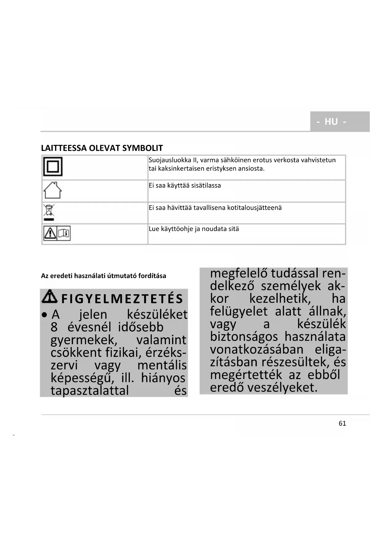 - A jelen készüléket 8 évesnél idősebb gyermekek, valamint csökkent fizikai, érzéks- zervi vagy mentális képességű, ill. hiányos tapasztalattal és megfelelő tudással ren- delkező személyek ak- kor kezelhetik, ha felügyelet alatt állnak, vagy a készülék biztonságos használata vonatkozásában eliga- zításban részesültek, és megértették az ebből eredő veszélyeket.- HU -