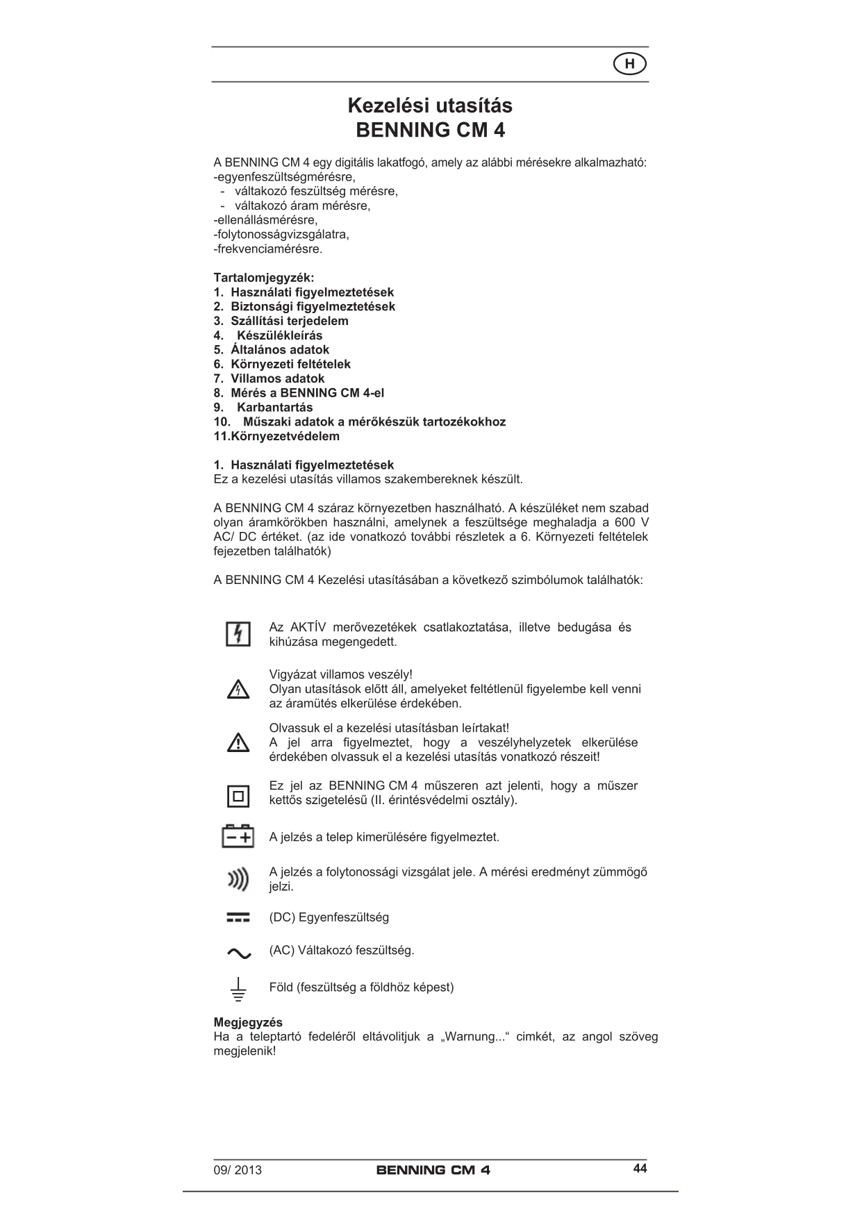 Föld (feszültség a földhöz képest) Megjegyzés Ha a teleptartó fedeléről eltávolitjuk a „Warnung...“ cimkét, az angol szöveg megjelenik!09/ 2013 BENNING CM 4