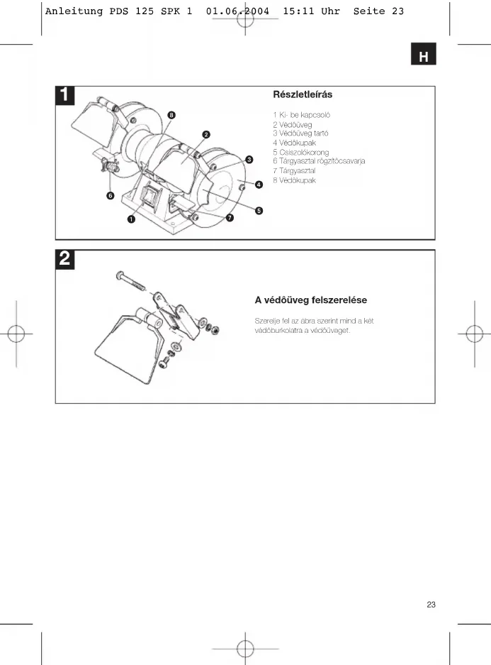 Anleitung PDS 125 SPK 1 01.06.2004 15:11 Uhr Seite 23Általános biztonsági utasítások és balesetvédelem Baleset és veszélymentes munkavégzés a géppel csakis akkor van garantálva, ha a biztonsági és a használati utasításokat végig olvassa és a benne foglaltakat betartja. Minden használat elôtt vizsgálja meg a gépet, a csatlakozókábelt és a hálózati dugót. Csak hibátlan és sérülés mentes géppel dolgozzon. A sérült részeket egy villamossági szakemberrel azonnal ki kell cseréltetni. Ha a gépen munkálatokat végez, ha szerszámot cserél, illetve ha a gép használaton kívül van, a hálózati dugót mindig húzza ki a dugaszolóaljzatból. A hálózati kábel sérülésének elkerülése végett, a hálózati kábelt a géptôl mindig hátrafelé vezesse el. Tárolja gépeit biztonságosan, és a gyerekek számára elérhetetlen helyen. Azbeszt tartalmú anyagot nem szabad megmunkálni. A szakmai egyesület megfelelô baleset megelôzési elôírását (VBG 119) kérjük figyelembe venni. Csakis originális pótalkatrészeket használjon. A javításokat csakis egy villamossági szakember végezheti el. A munkahelyen a zajkifejtés túllépheti a 85 dB (A). Ebben az esetben az üzemeltetôk részére hang- és fülvédô intézkedésre van szükség. Ennek az elektromos szerszámnak a zaját a IEC 59 CO 11, IEC 704, DIN 45635 21- rész, NFS 31-031 (84/537/EWG) szerint mérik. Ügyeljen egy biztonságos állásra. Kerülje el a nem természetes testtartásokat. Elektromos szerszámját ne tegye ki esônek. Ne használja az elektromos szerszámokat vizes vagy nedves helyen és gyullékony folyadékok közelében sem. Óvja a hálózati kábelt az olaj, oldószerek vagy éles szélek által okozotti sérülésektôl. Tartsa a munkahelyét rendben. A gép hálózatra való csatlakoztatása elôtt, gyôzôdjön meg arról, hogy a gép ki van kapcsolva. Viseljen megfelelô munkaruhát . Ne viseljen bô ruhát vagy ékszert. Hosszú haj esetén hordjon hajneccet. Saját biztonsága érdekében csak a szerszám gyártó tartozékait és toldalék gépeit használja. Csiszolás, drótkorongozás és szétválasztás esetén használjon védôszemüveget, biztonsági kesztyět és fülvédôt. Vizsgálja felül, hogy a korongon megadott fordulatszám egyforma vagy nagyobb e mint a csiszoló méretezési fordulatszáma. Bizonyosodjon meg arról, hogy a korong méretei a csiszolóhoz passzolnak. A csiszolókorongokat a gyártó utasításai szerint kell gondosan tárolni és kezelni. Ellenôrizze a korongokat használatuk elôtt; ne használjon letörött, megrepedezett vagy másmilyen módon sérült termékeket. Bizonyosodjon meg arról, hogy a csiszolószerszámok a gyártó utasításai szerint lettek felszerelve. Viseljen gondot arról, hogy ha a csiszoló eszközökkel közététek állnak a rendelkezésre és követelve is, akkor ezek használva is legyenek. Viseljen gondot arról, hogy a használat elôtt a csiszoló eszközök rendesen fel legyenek szerelve és erôsítve. Hagyja a szerszámot 5 percig bisztonságos pozicióban üres menetben járni. Ha intenzív rezgések lépnek fel vagy más hiányosságokat észlelne, akkor azonnal állítsa le a gépet. Ha ez a helyzet lépne fel akkor vizsgálja felül a gépet, hogy a hiba okát meg tudja állapítani. Ne üzemeltesse az elektromos szerszámot sohasem a vele szállított védôburkolat nélkül. Ne használjon nagy lyukú csiszolókorongok alkalmassá tételéhez hasított redukáló perselyeket vagy adaptereket. Viseljen gondot arról, hogy a használatkor keletkezô szikrák ne jelentsenek veszélyt, mint például azáltal hogy személyeket eltalálnak, vagy hogy gyullékony anyagokat meggyújtanak. Viseljen mindig védôszemüveget és fülvédôt; szükség esetén használjon más személyvédô eszközöket is mint például kesztyět, kötényt és sisakot. Csiszoláskor a munkadarab forró lesz. Figyelem! Megégetési veszély! Hagyja a munkadarabot lehülni. A csiszolás közben az anyag kiizzhat, hosszabb megmunkálásoknál idôközben hětse le a munkadarabot. Ne használjon hětôszereket vagy hasonlót.
