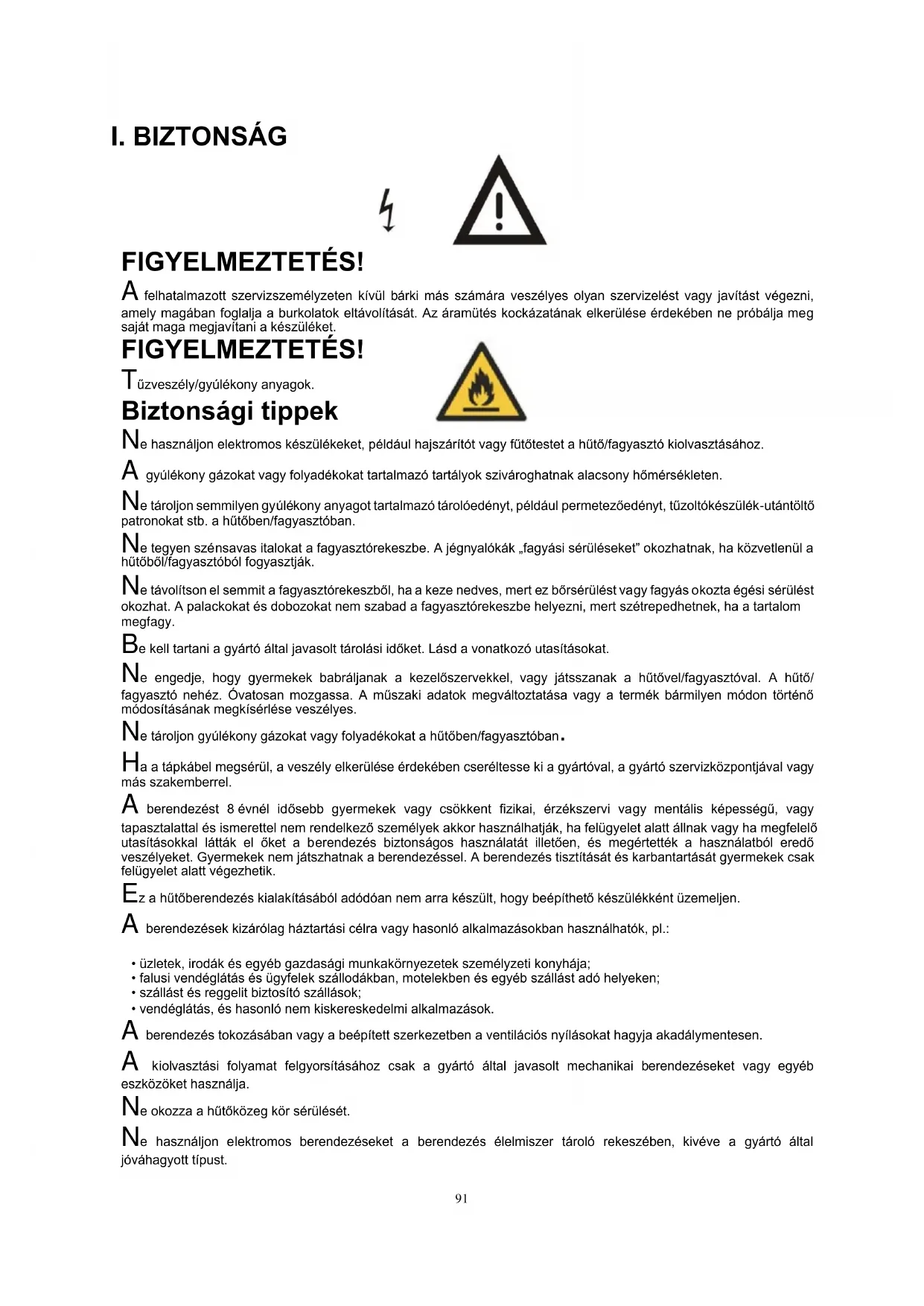 FIGYELMEZTETÉS! A felhatalmazott szervizszemélyzeten kívül bárki más számára veszélyes olyan szervizelést vagy javítást végezni, amely magában foglalja a burkolatok eltávolítását. Az áramütés kockázatának elkerülése érdekében ne próbálja meg saját maga megjavítani a készüléket. FIGYELMEZTETÉS! Tűzveszély/gyúlékony anyagok. Biztonsági tippek Ne használjon elektromos készülékeket, például hajszárítót vagy fűtőtestet a hűtő/fagyasztó kiolvasztásához. A gyúlékony gázokat vagy folyadékokat tartalmazó tartályok szivároghatnak alacsony hőmérsékleten. Ne tároljon semmilyen gyúlékony anyagot tartalmazó tárolóedényt, például permetezőedényt, tűzoltókészülék-utántöltő patronokat stb. a hűtőben/fagyasztóban. Ne tegyen szénsavas italokat a fagyasztórekeszbe. A jégnyalókák „fagyási sérüléseket” okozhatnak, ha közvetlenül a hűtőből/fagyasztóból fogyasztják. Ne távolítson el semmit a fagyasztórekeszből, ha a keze nedves, mert ez bőrsérülést vagy fagyás okozta égési sérülést okozhat. A palackokat és dobozokat nem szabad a fagyasztórekeszbe helyezni, mert szétrepedhetnek, ha a tartalom megfagy. Be kell tartani a gyártó által javasolt tárolási időket. Lásd a vonatkozó utasításokat. Ne engedje, hogy gyermekek babráljanak a kezelőszervekkel, vagy játsszanak a hűtővel/fagyasztóval. A hűtő/ fagyasztó nehéz. Óvatosan mozgassa. A műszaki adatok megváltoztatása vagy a termék bármilyen módon történő módosításának megkísérlése veszélyes. Ne tároljon gyúlékony gázokat vagy folyadékokat a hűtőben/fagyasztóban. Ha a tápkábel megsérül, a veszély elkerülése érdekében cseréltesse ki a gyártóval, a gyártó szervizközpontjával vagy más szakemberrel. A berendezést 8 évnél idősebb gyermekek vagy csökkent fizikai, érzékszervi vagy mentális képességű, vagy tapasztalattal és ismerettel nem rendelkező személyek akkor használhatják, ha felügyelet alatt állnak vagy ha megfelelő utasításokkal látták el őket a berendezés biztonságos használatát illetően, és megértették a használatból eredő veszélyeket. Gyermekek nem játszhatnak a berendezéssel. A berendezés tisztítását és karbantartását gyermekek csak felügyelet alatt végezhetik. Ez a hűtőberendezés kialakításából adódóan nem arra készült, hogy beépíthető készülékként üzemeljen. A berendezések kizárólag háztartási célra vagy hasonló alkalmazásokban használhatók, pl.: