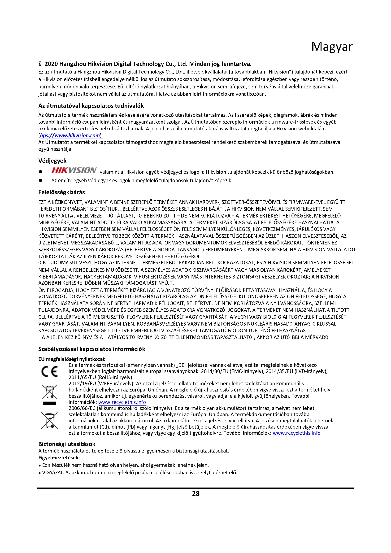 © 2020 Hangzhou Hikvision Digital Technology Co., Ltd. Minden jog fenntartva. Ez az útmutató a Hangzhou Hikvision Digital Technology Co., Ltd., illetve fiókvállalatai (a továbbiakban „Hikvision”) tulajdonát képezi, ezért a Hikvision előzetes írásbeli engedélye nélkül tilos az útmutató sokszorosítása, módosítása, lefordítása egészben vagy részben történő, bármilyen módon való terjesztése. Ettől eltérő nyilatkozat hiányában, a Hikvision sem kifejezett, sem törvény által vélelmezett garanciát, jótállást vagy biztosítékot nem vállal az útmutatóra, illetve az abban leírt információkra vonatkozóan. Az útmutatóval kapcsolatos tudnivalók Az útmutató a termék használatára és kezelésére vonatkozó utasításokat tartalmaz. Az itt szereplő képek, diagramok, ábrák és minden további információ csupán leírásként és magyarázatként szolgál. Az Útmutatóban szereplő információk a firmware-frissítések és egyéb okok miatt előzetes értesítés nélkül változhatnak. A jelen használati útmutató aktuális változatát megtalálja a Hikvision weboldalán (https://www.hikvision.com). Az Útmutatót a termékkel kapcsolatos támogatáshoz megfelelő képesítéssel rendelkező szakemberek támogatásával és útmutatásával együtt használja. Védjegyek valamint a Hikvision egyéb védjegyei és logói a Hikvision tulajdonát képezik különböző joghatóságokban. Az említett egyéb védjegyek és logók a megfelelő tulajdonosok tulajdonát képezik. Felelősségkizárás EZT A KÉZIKÖNYVET, VALAMINT A BENNE SZEREPLŐ TERMÉKET ANNAK HARDVER-, SZOFTVER-ÖSSZETEVŐIVEL ÉS FIRMWARE-ÉVEL EGYÜ TT „EREDETI FORMÁBAN” BIZTOSÍTJUK, „BELEÉRTVE AZOK ÖSSZES ESETLEGES HIBÁJÁT”. A HIKVISION NEM VÁLLAL SEM KIFEJEZETT, SEM TÖ RVÉNY ÁLTAL VÉLELMEZETT JÓTÁLLÁST, TÖ BBEK KÖ ZÖ TT – DE NEM KORLÁTOZVA – A TERMÉK ÉRTÉKESÍTHETŐSÉGÉRE, MEGFELELŐ MINŐSÉGÉRE, VALAMINT ADOTT CÉLRA VALÓ ALKALMASSÁGÁRA. A TERMÉKET KIZÁRÓLAG SAJÁT FELELŐSSÉGÉRE HASZNÁLHATJA. A HIKVISION SEMMILYEN ESETBEN SEM VÁLLAL FELELŐSSÉGET ÖN FELÉ SEMMILYEN KÜLÖNLEGES, KÖVETKEZMÉNYES, JÁRULÉKOS VAGY KÖZVETETT KÁRÉRT, BELEÉRTVE TÖBBEK KÖZÖTT A TERMÉK HASZNÁLATÁVAL ÖSSZEFÜGGÉSBEN AZ ÜZLETI HASZON ELVESZTÉSÉBŐL, AZ ÜZLETMENET MEGSZAKADÁSÁBÓ L, VALAMINT AZ ADATOK VAGY DOKUMENTUMOK ELVESZTÉSÉBŐL EREDŐ KÁROKAT, TÖRTÉNJEN EZ SZERZŐDÉSSZEGÉS VAGY KÁROKOZÁS (BELEÉRTVE A GONDATLANSÁGOT) EREDMÉNYEKÉNT, MÉG AKKOR SEM, HA A HIKVISION VÁLLALATOT TÁJÉKOZTATTÁK AZ ILYEN KÁROK BEKÖVETKEZÉSÉNEK LEHETŐSÉGÉRŐL. Ö N TUDOMÁSUL VESZI, HOGY AZ INTERNET TERMÉSZETÉBŐL FAKADÓAN REJT KOCKÁZATOKAT, ÉS A HIKVISION SEMMILYEN FELELŐSSÉGET NEM VÁLLAL A RENDELLENES MŰKÖDÉSÉRT, A SZEMÉLYES ADATOK KISZIVÁRGÁSÁÉRT VAGY MÁS OLYAN KÁROKÉRT, AMELYEKET KIBERTÁMADÁSOK, HACKERTÁMADÁSOK, VÍRUSFERTŐZÉSEK VAGY MÁS INTERNETES BIZTONSÁGI VESZÉLYEK OKOZTAK; A HIKVISION AZONBAN KÉRÉSRE IDŐBEN MŰSZAKI TÁMOGATÁST NYÚJT. ÖN ELFOGADJA, HOGY EZT A TERMÉKET KIZÁRÓLAG A VONATKOZÓ TÖRVÉNYI ELŐÍRÁSOK BETARTÁSÁVAL HASZNÁLJA, ÉS HOGY A VONATKOZÓ TÖRVÉNYEKNEK MEGFELELŐ HASZNÁLAT KIZÁRÓLAG AZ ÖN FELELŐSSÉGE. KÜLÖNÖSKÉPPEN AZ ÖN FELELŐSSÉGE, HOGY A TERMÉK HASZNÁLATA SORÁN NE SÉRTSE HARMADIK FÉL JOGAIT, BELEÉRTVE, DE NEM KORLÁTOZVA A NYILVÁNOSSÁGRA, SZELLEMI TULAJDONRA, ADATOK VÉDELMÉRE ÉS EGYÉB SZEMÉLYES ADATOKRA VONATKOZÓ JOGOKAT. A TERMÉKET NEM HASZNÁLHATJA TILTOTT CÉLRA, BELEÉRTVE A TÖ MEGPUSZTÍTÓ FEGYVEREK FEJLESZTÉSÉT VAGY GYÁRTÁSÁT, A VEGYI VAGY BIOLÓ GIAI FEGYVEREK FEJLESZTÉSÉT VAGY GYÁRTÁSÁT, VALAMINT BÁRMILYEN, ROBBANÁSVESZÉLYES VAGY NEM BIZTONSÁGOS NUKLEÁRIS HASADÓ ANYAG-CIKLUSSAL KAPCSOLATOS TEVÉKENYSÉGET, ILLETVE EMBERI JOGI VISSZAÉLÉSEKET TÁMOGATÓ MÓDON TÖRTÉNŐ FELHASZNÁLÁST. HA A JELEN KÉZIKÖ NYV ÉS A HATÁLYOS TÖ RVÉNY KÖ ZÖ TT ELLENTMONDÁS TAPASZTALHATÓ , AKKOR AZ UTÓ BBI A MÉRVADÓ . Szabályozással kapcsolatos információk EU megfelelőségi nyilatkozat