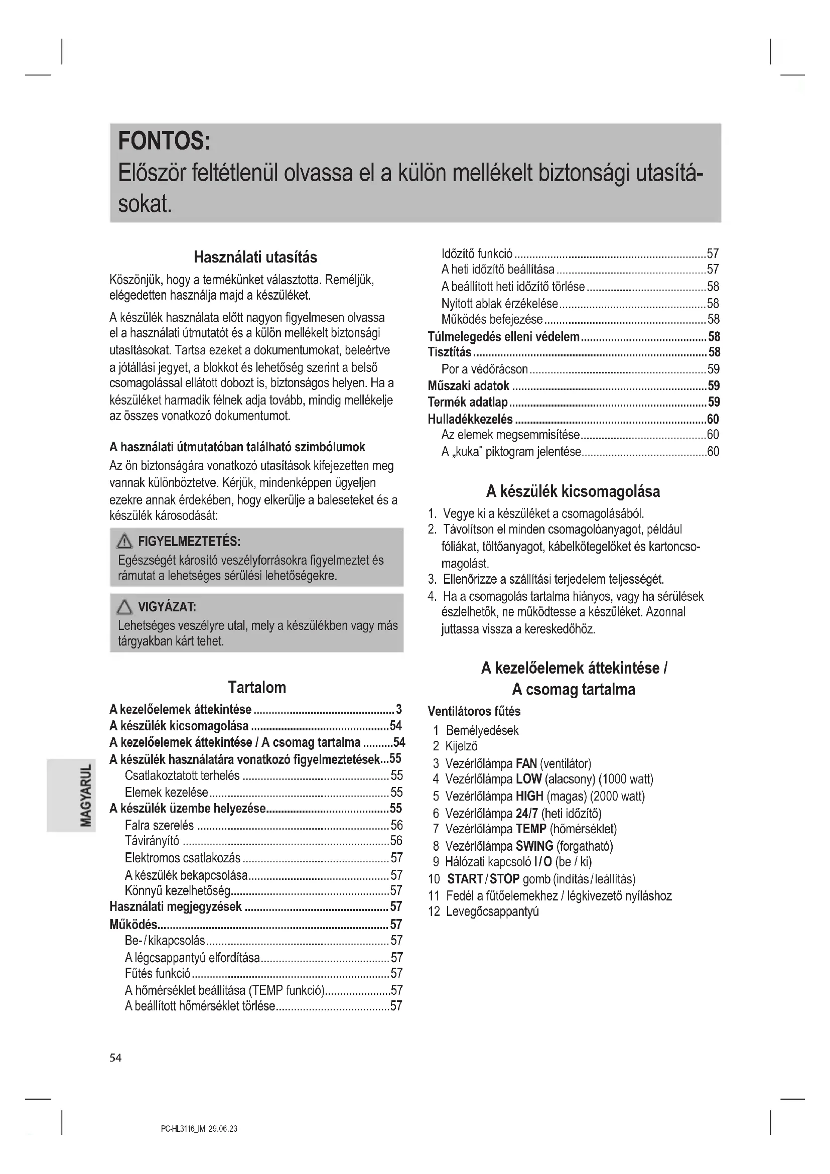 FONTOS: Először feltétlenül olvassa el a külön mellékelt biztonsági utasítá- sokat. Használati utasítás Köszönjük, hogy a termékünket választotta. Reméljük, elégedetten használja majd a készüléket. A készülék használata előtt nagyon gyelmesen olvassa el a használati útmutatót és a külön mellékelt biztonsági utasításokat. Tartsa ezeket a dokumentumokat, beleértve a jótállási jegyet, a blokkot és lehetőség szerint a belső csomagolással ellátott dobozt is, biztonságos helyen. Ha a készüléket harmadik félnek adja tovább, mindig mellékelje az összes vonatkozó dokumentumot. A használati útmutatóban található szimbólumok Az ön biztonságára vonatkozó utasítások kifejezetten meg vannak különböztetve. Kérjük, mindenképpen ügyeljen ezekre annak érdekében, hogy elkerülje a baleseteket és a készülék károsodását: FIGYELMEZTETÉS: Egészségét károsító veszélyforrásokra gyelmeztet és rámutat a lehetséges sérülési lehetőségekre. VIGYÁZAT: Lehetséges veszélyre utal, mely a készülékben vagy más tárgyakban kárt tehet. Tartalom A kezelőelemek áttekintése ...............................................3 A készülék kicsomagolása ..............................................54 A kezelőelemek áttekintése / A csomag tartalma ..........54 A készülék használatára vonatkozó gyelmeztetések