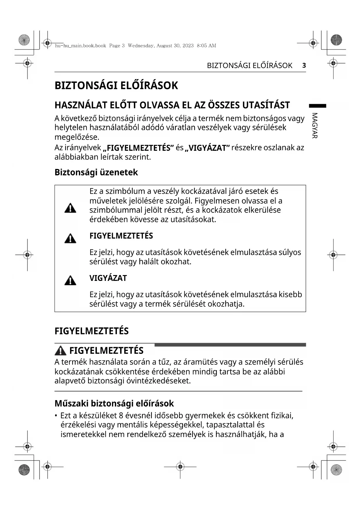 „VIGYÁZAT” részekre oszlanak az alábbiakban leírtak szerint. Biztonsági üzenetek FIGYELMEZTETÉS FIGYELMEZTETÉS A termék használata során a tűz, az áramütés vagy a személyi sérülés kockázatának csökkentése érdekében mindig tartsa be az alábbi alapvető biztonsági óvintézkedéseket. Műszaki biztonsági előírások