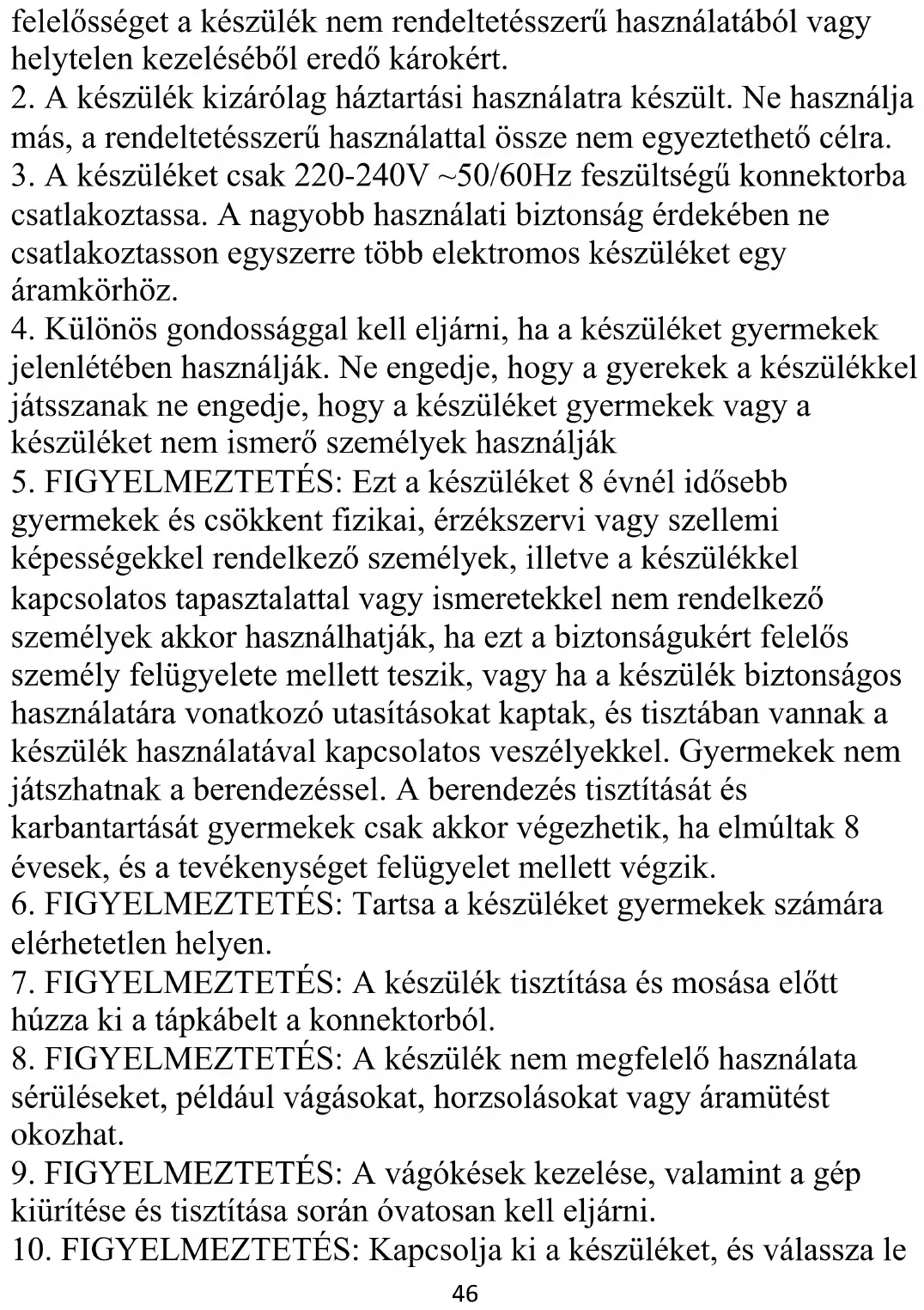 MEGJEGYZÉS: KÜLÖNÖSEN ÜGYELJEN ARRA, HOGY AZ ÉLELMISZEREKKEL KÖZVETLENÜL ÉRINTKEZŐ RÉSZEK: TOLÓ, ADAGOLÓ, ŐRLŐKAMRA ÉS KÉSEK. KÜLÖNÖSEN ALAPOSAN TISZTÍTJUK. AZ ÉTELMARADÉKOK BAKTÉRIUMOK ELSZAPORODÁSÁT OKOZHATJÁK, ÉS BETEGSÉGHEZ VAGY SÉRÜLÉSHEZ VEZETHETNEK. Műszaki leírás: A folyamatos használat maximális időtartama: 3 perc Teljesítmény: 150 W Bemeneti feszültség: v~ 50/60 Hz