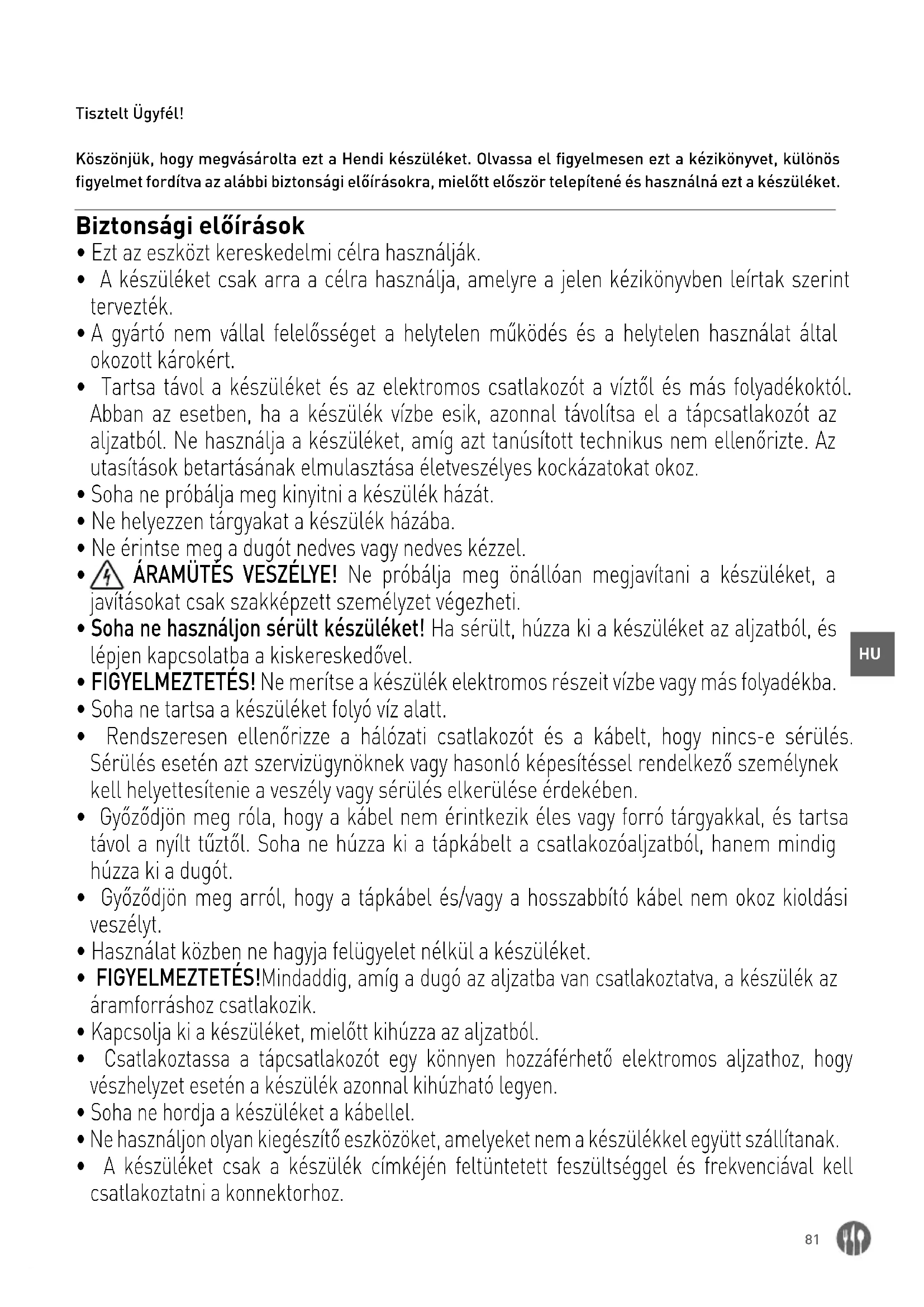 Tisztelt Ügyfél! Köszönjük, hogy megvásárolta ezt a Hendi készüléket. Olvassa el figyelmesen ezt a kézikönyvet, különös figyelmet fordítva az alábbi biztonsági előírásokra, mielőtt először telepítené és használná ezt a készüléket. Biztonsági előírások